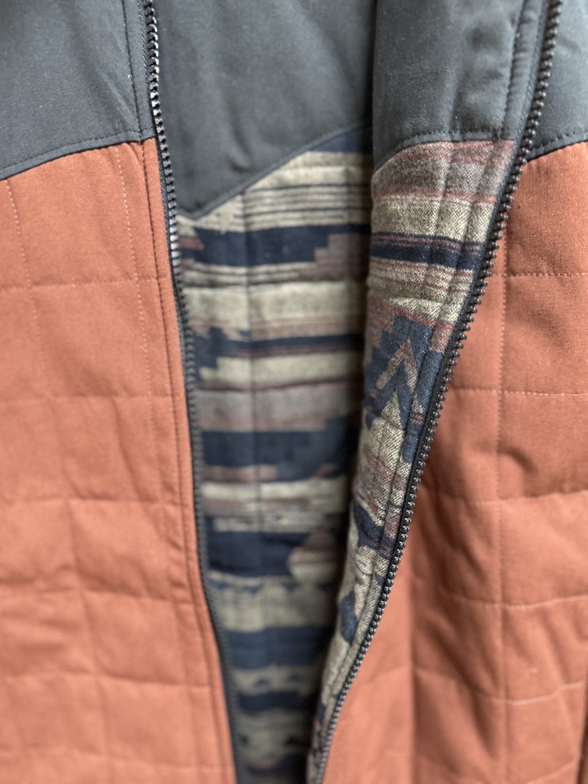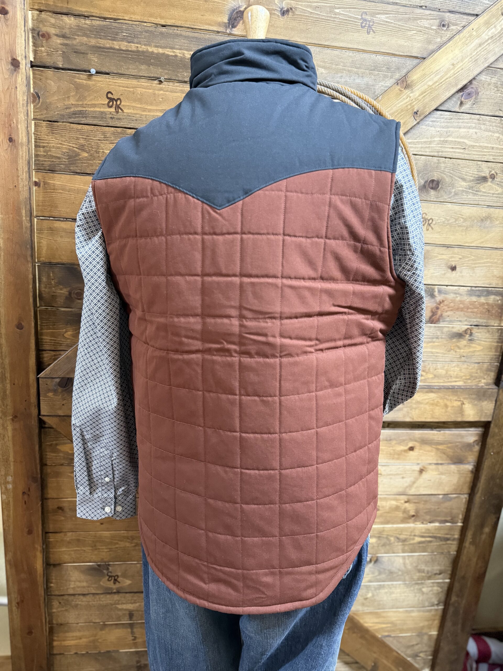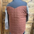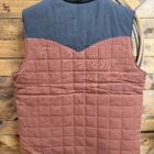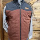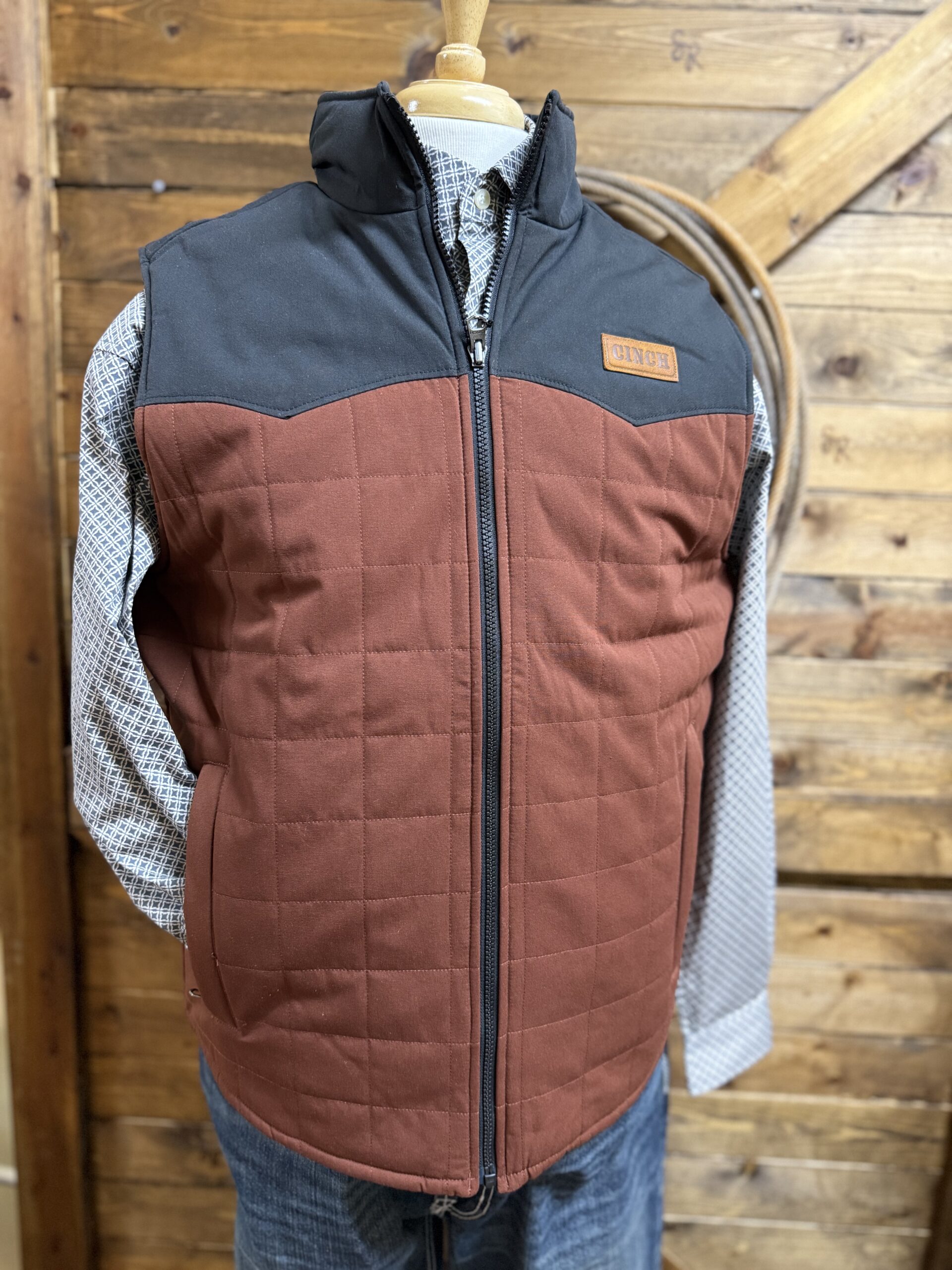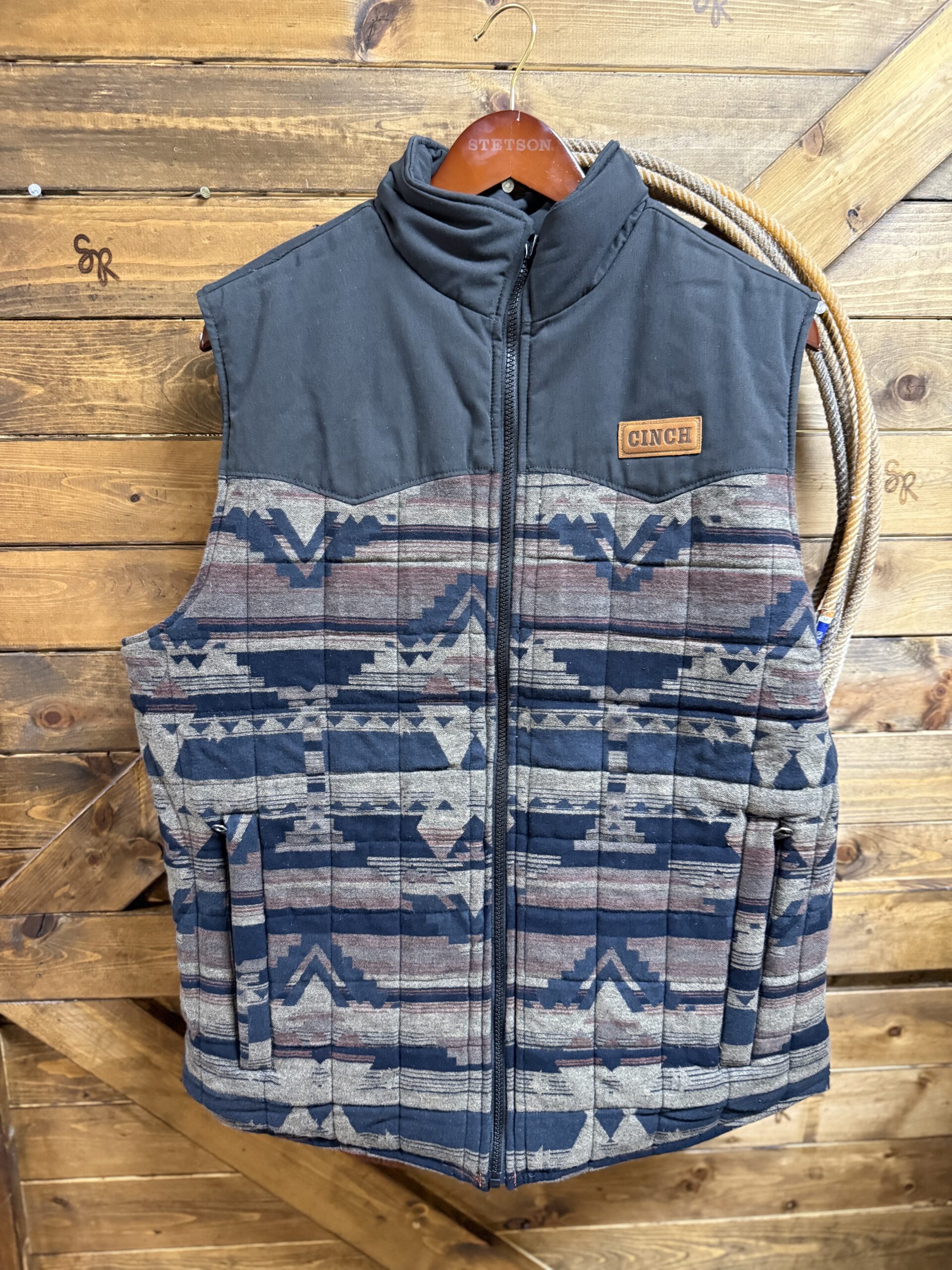 A reversible quilted vest that sports great look regardless of which side you choose to wear outside. The front of both sides features a full length navy zipper, individual hand pockets that close on a zipper and the Cinch logo patch on the left side of the chest. One side is a quilted design  of brick red and a navy upper across the shoulders and up the collar. The opposite side is a pretty quilted navy aztec pattern with a navy upper across the shoulders and up the collar. Designed with heavier made material to withstand the coldest of cold temperatures here in the south. Made with a durable water resistant fabric to shed moisture. A look that presents itself either way and for a variety of occasions. Wear it comfortably regardless of the event!