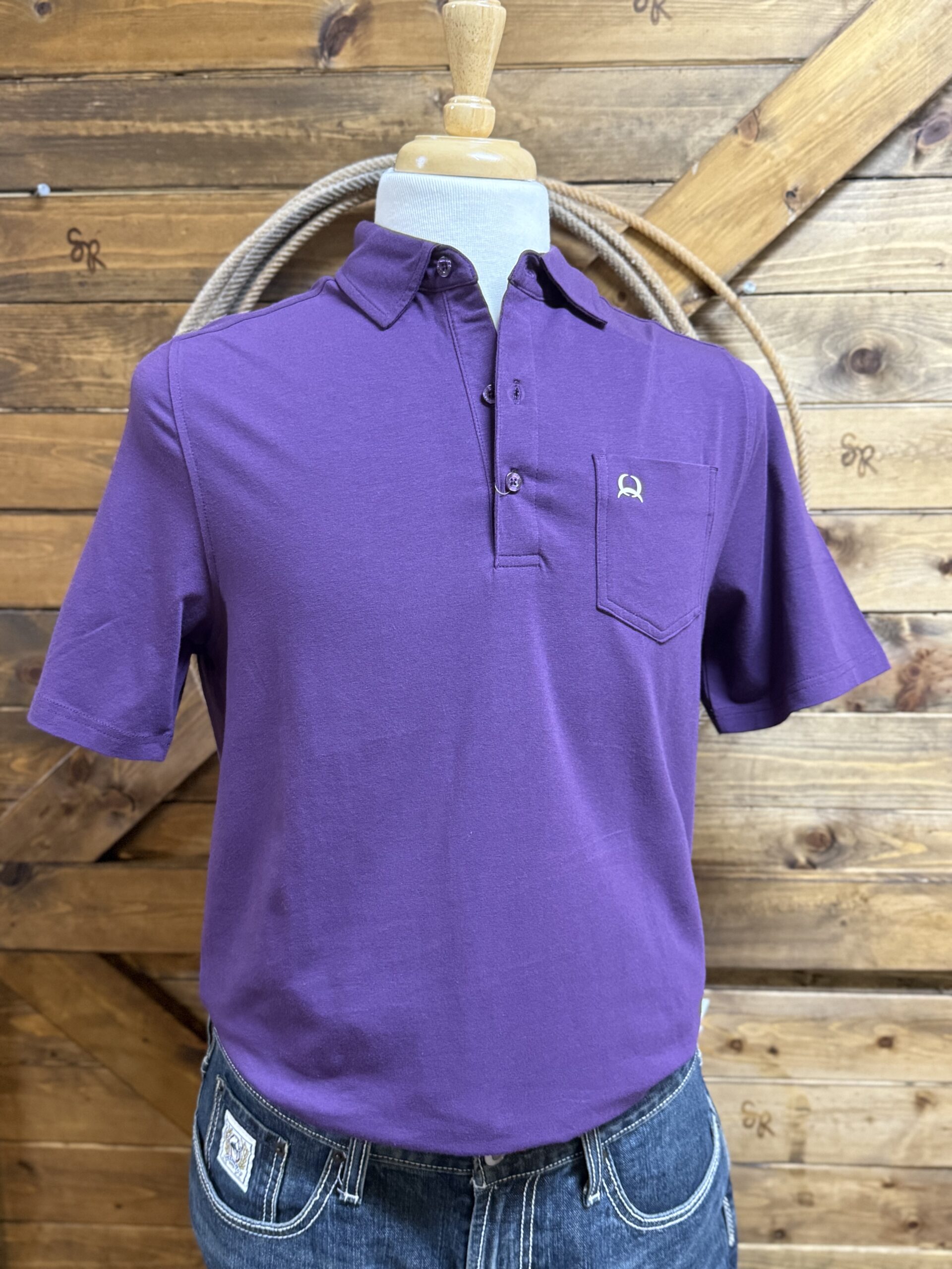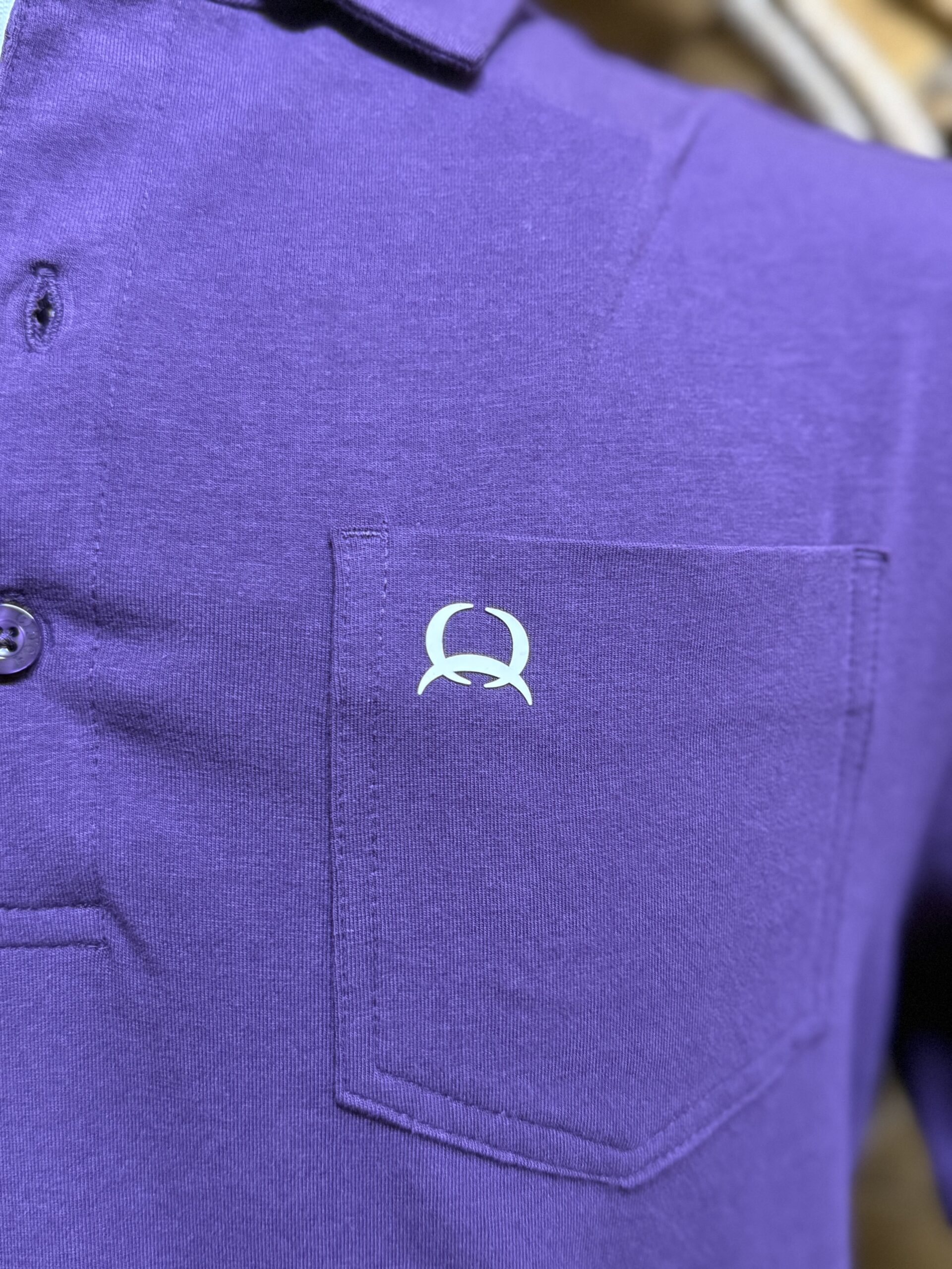 A cotton polo! Yes, we have something for those of you looking for a more traditional polo. They don’t all have to be a performance material. The look is so sharp on this cotton polo. A pretty deep purple in color, it carries all of the qualities of a nice shirt. The front has an open front pocket on the left hand side of the chest. It does have the arena flex, the stretch that allows the shirt to move with you. Great look, traditional fabric.