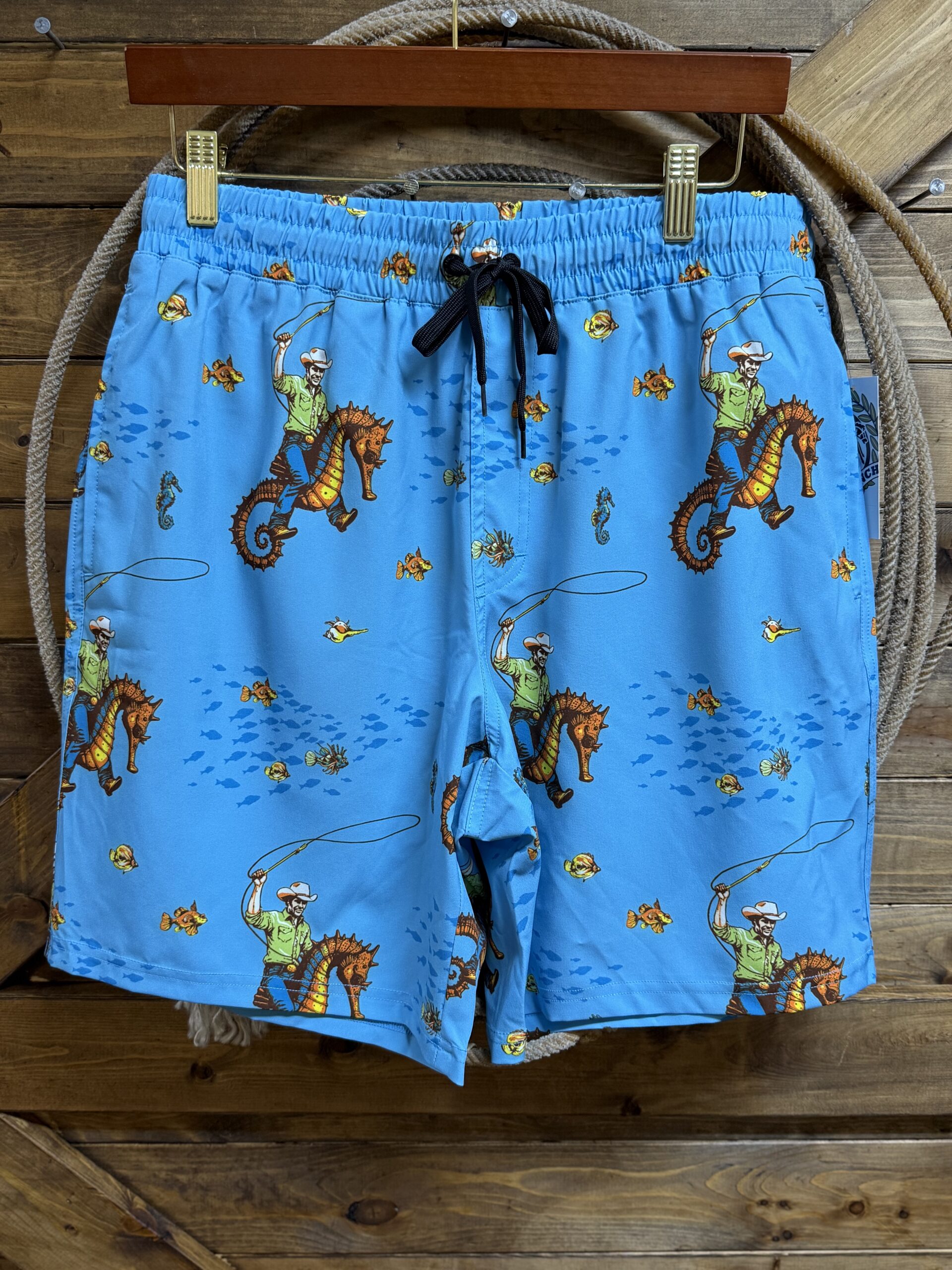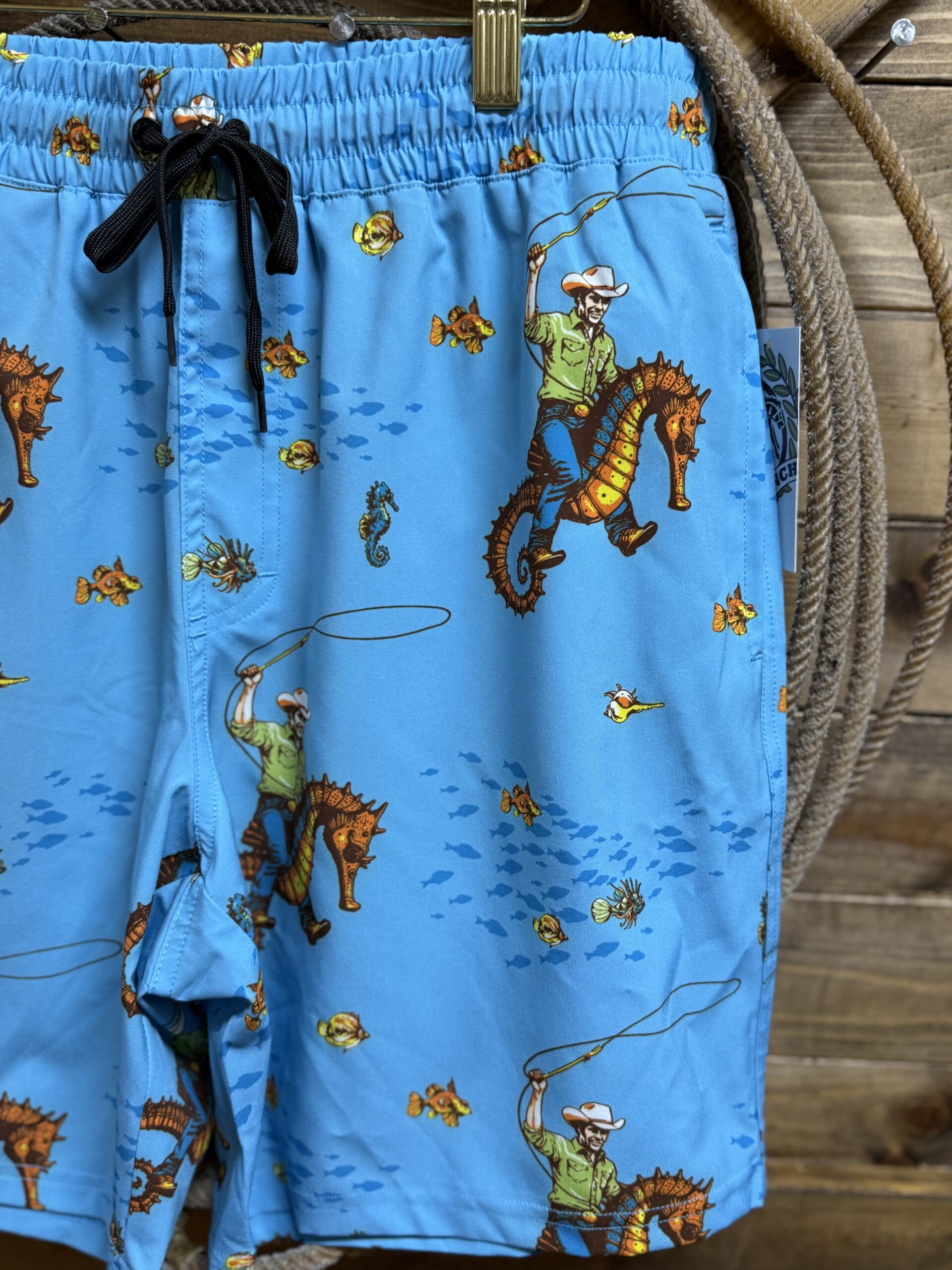 Bringing the cowboy fun to the pool party! Good fun conversation starter in these cowboys on seahorses. The front features a drawstring waist and front pockets on each side while the backside only has a right back pocket with a velcro closure. Perfect for the cowboy on his venture to a good time on the water!