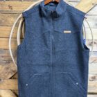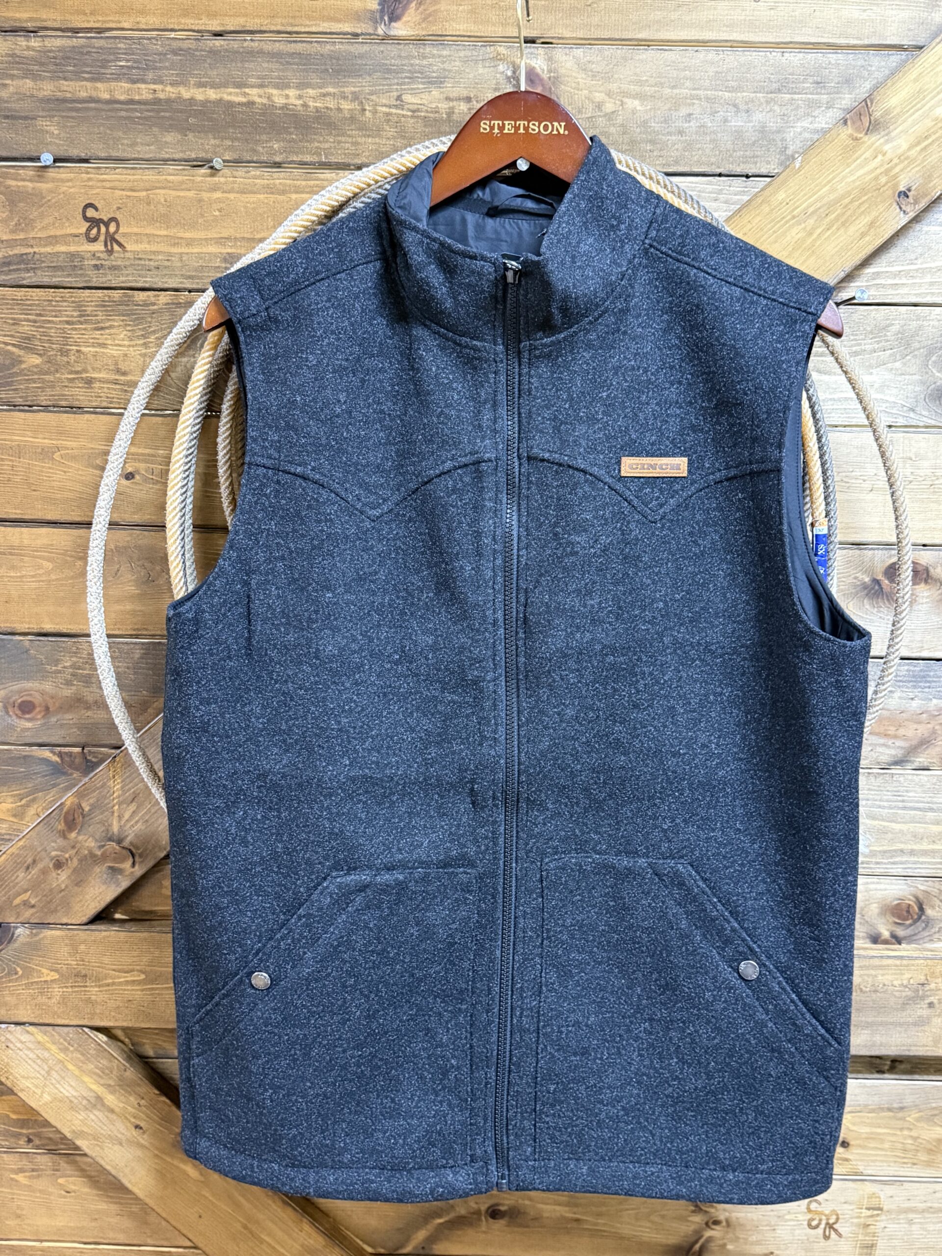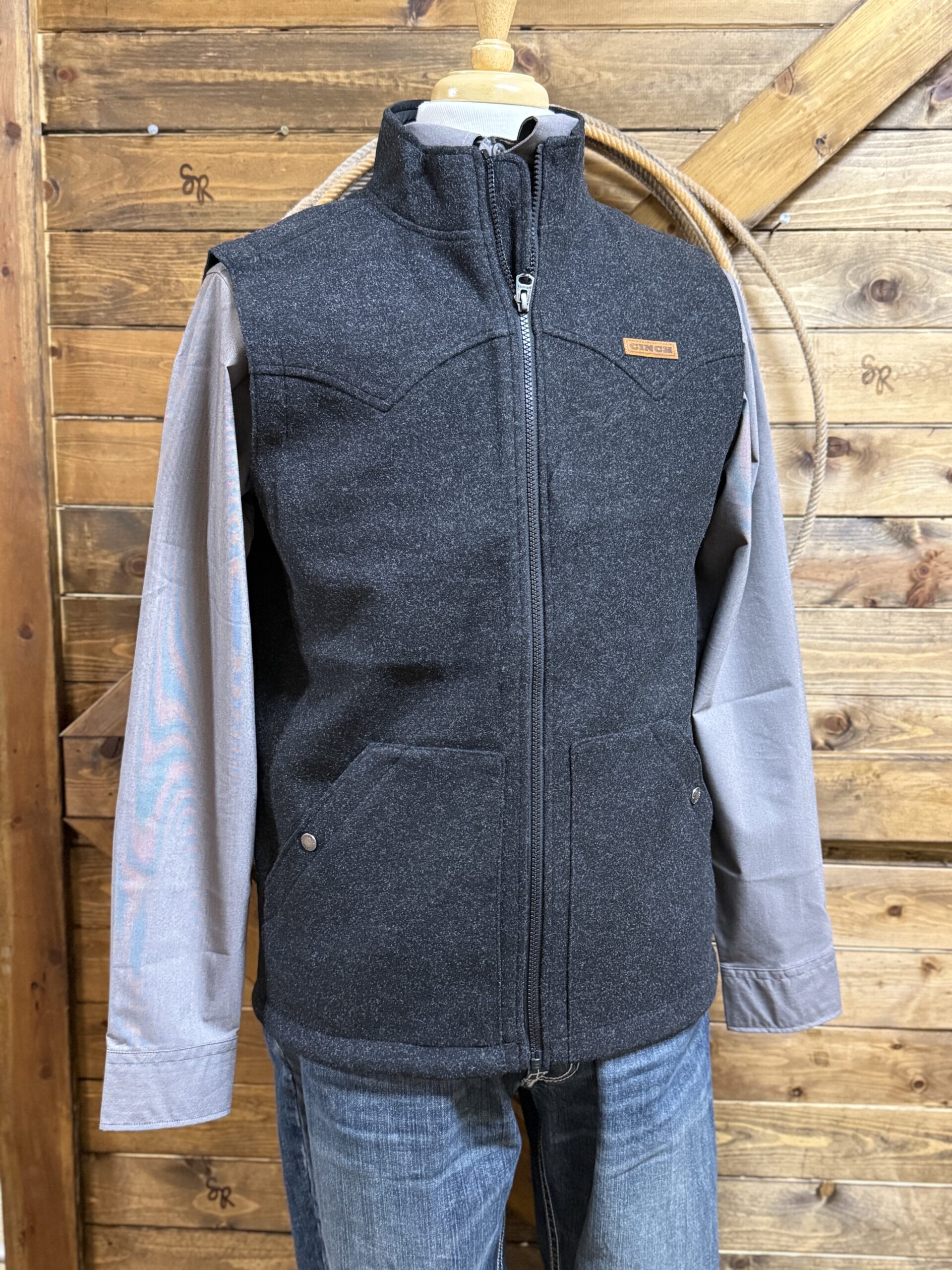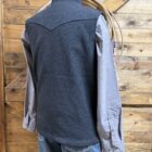 A vest with a little dressier style! It can certainly be worn for any occasion however the wool exterior presents a little dressier appearance. Soft black wool exterior featuring a sheer interior lining with slip pockets on both sides of the interior. The front of the vest features a seam across the front of the shoulders and again across the back of the shoulders. A full length color matched zipper and large square pockets adorn the front. Each of the pockets have a slit opening secured with a single centered snap button closure. This is perfect for your holiday gatherings or the family pictures that are scheduled.