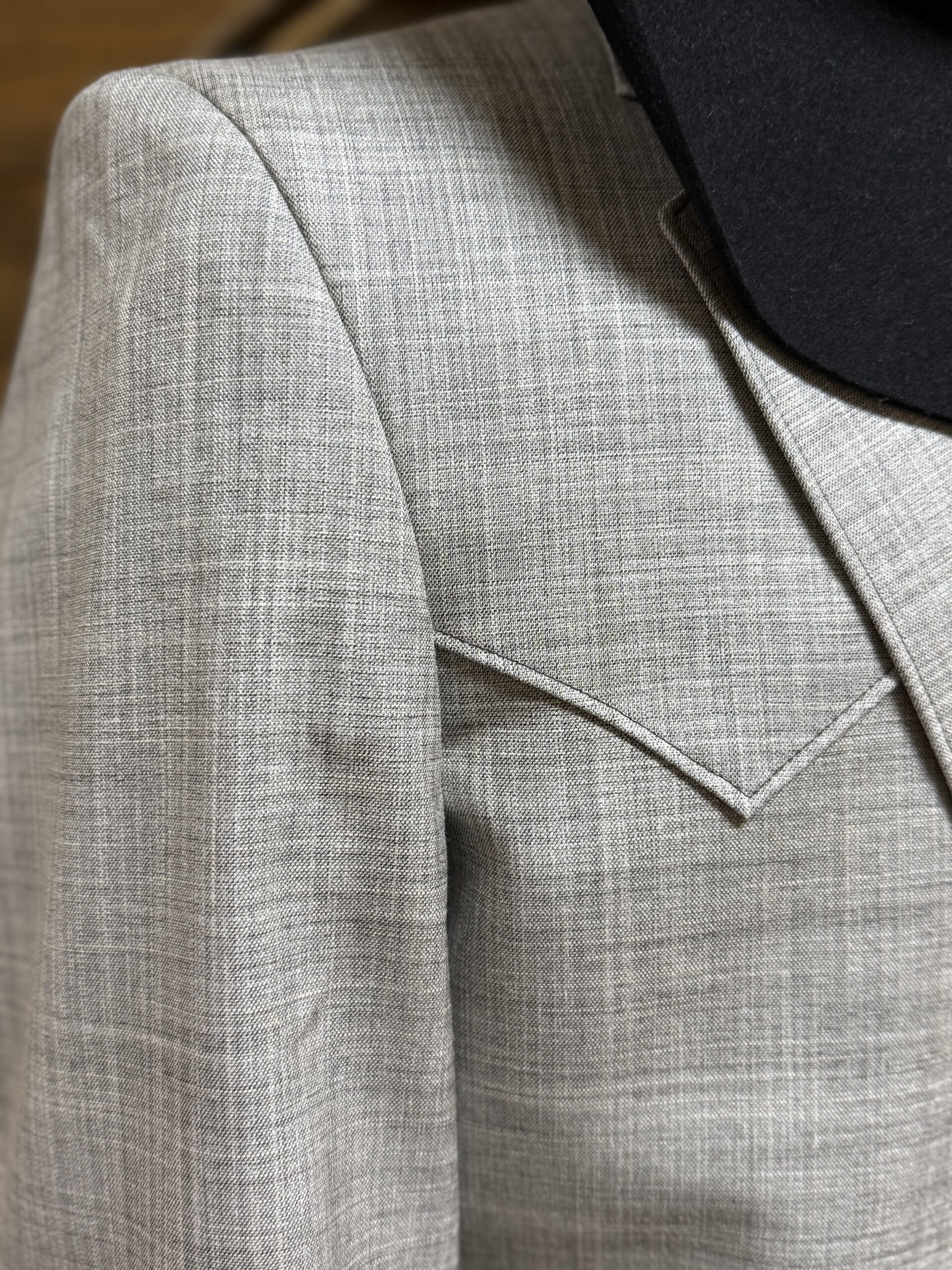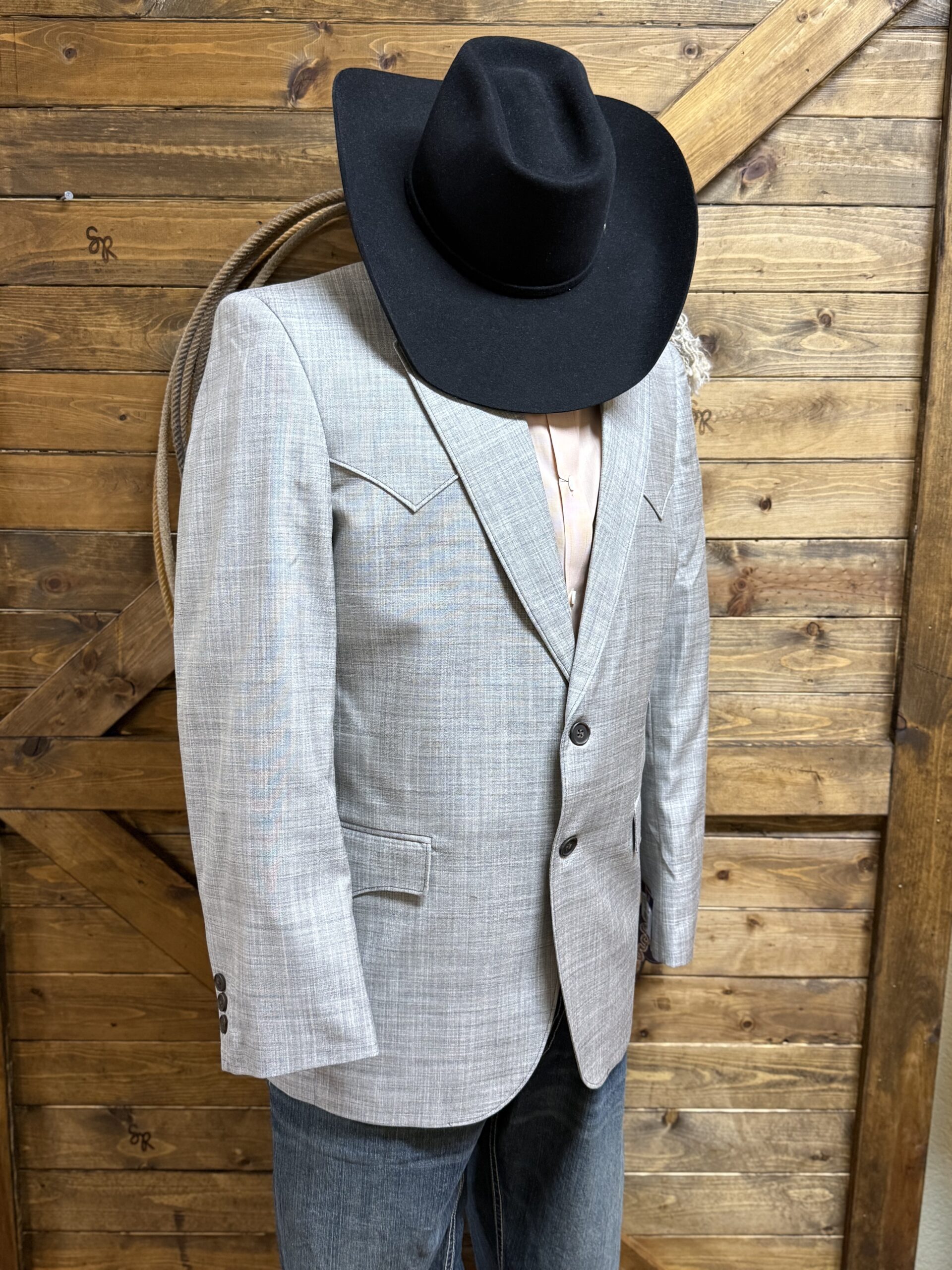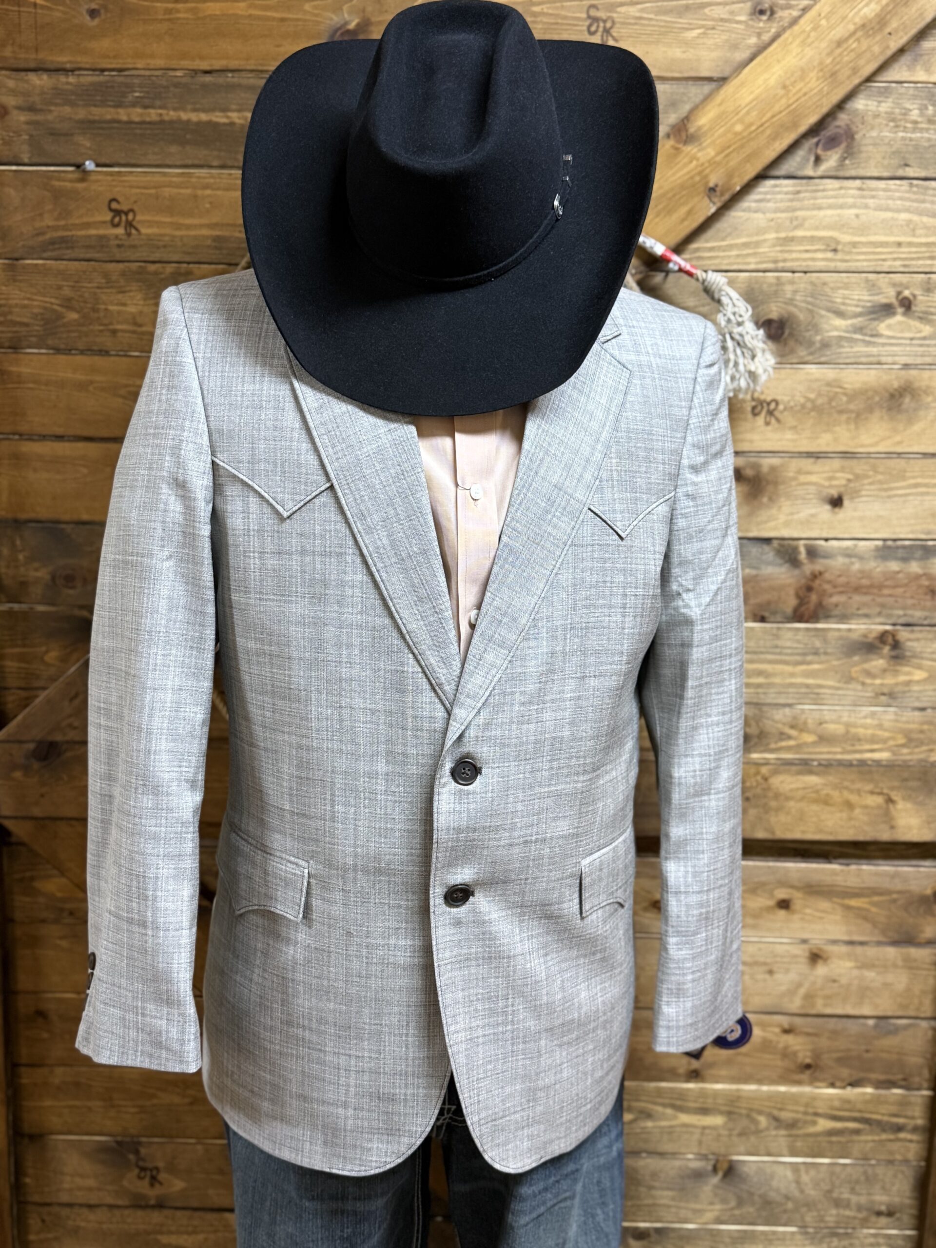 When a special occasion arises, it shouldn’t be hard deciding on what to wear! We have made it as easy as it can be without being like the rest! The perfect colored sport coat-wood ash. It carries tones of grey with black and the slightest shade of light blue mixed within. The colors here are arguably the most popular and easiest to color match. You pick your shirt, printed or solid and just put on the jacket. These colors go with everything, from slacks to jeans and colors to prints! The front of the jacket features a 2 button closure and useable front pockets on each side. The chest is bare with a western yoke seam coming down across the front of both shoulders. It continues across the back the same cutting across at the shoulders. A single split tail is displayed on the backside.  At the end of each sleeve is a neat 3 button set on a welted hem. Fully lined with a gorgeous black satin in paisley print, each side of the jacket opening is designed with a deep slit pocket. Soo just go on and get this one! It’s literally meant for your closet and covers all the bases in one jacket! A color that is in all year long every year!