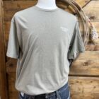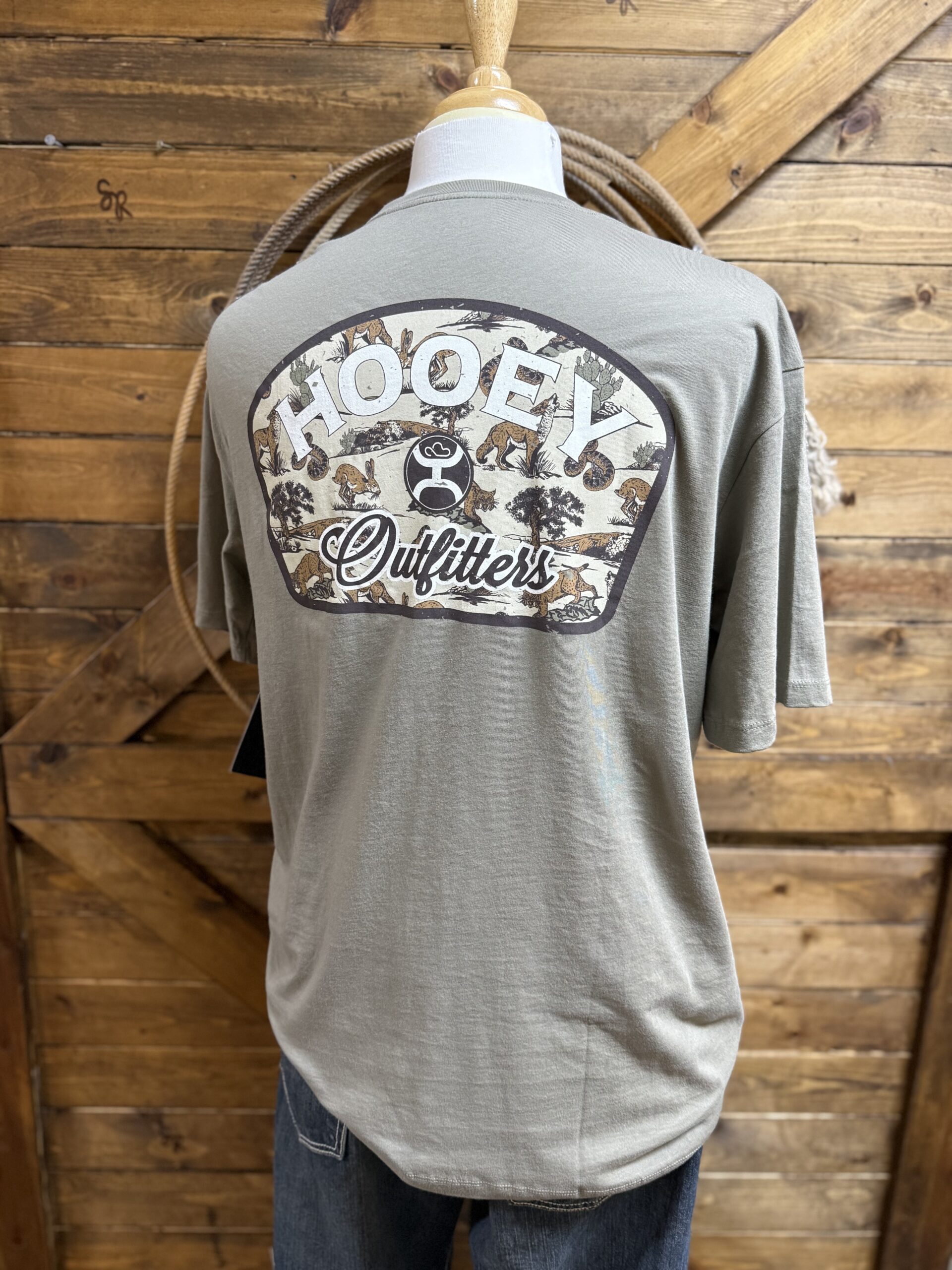 A good crew neck tee featuring the graphic on the backside. The front displays the Hooey Outfitters graphic in a small frame located on the upper left hand corner of the chest. The backside displays the large Hooey Outfitters graphic in a large centered display. A super cool camo, unique to the wildlife of the south, sets the background for the Hooey logo and cowboy. Displayed on an olive tee, this camo graphic fits the color scheme. Great for everyday style!
