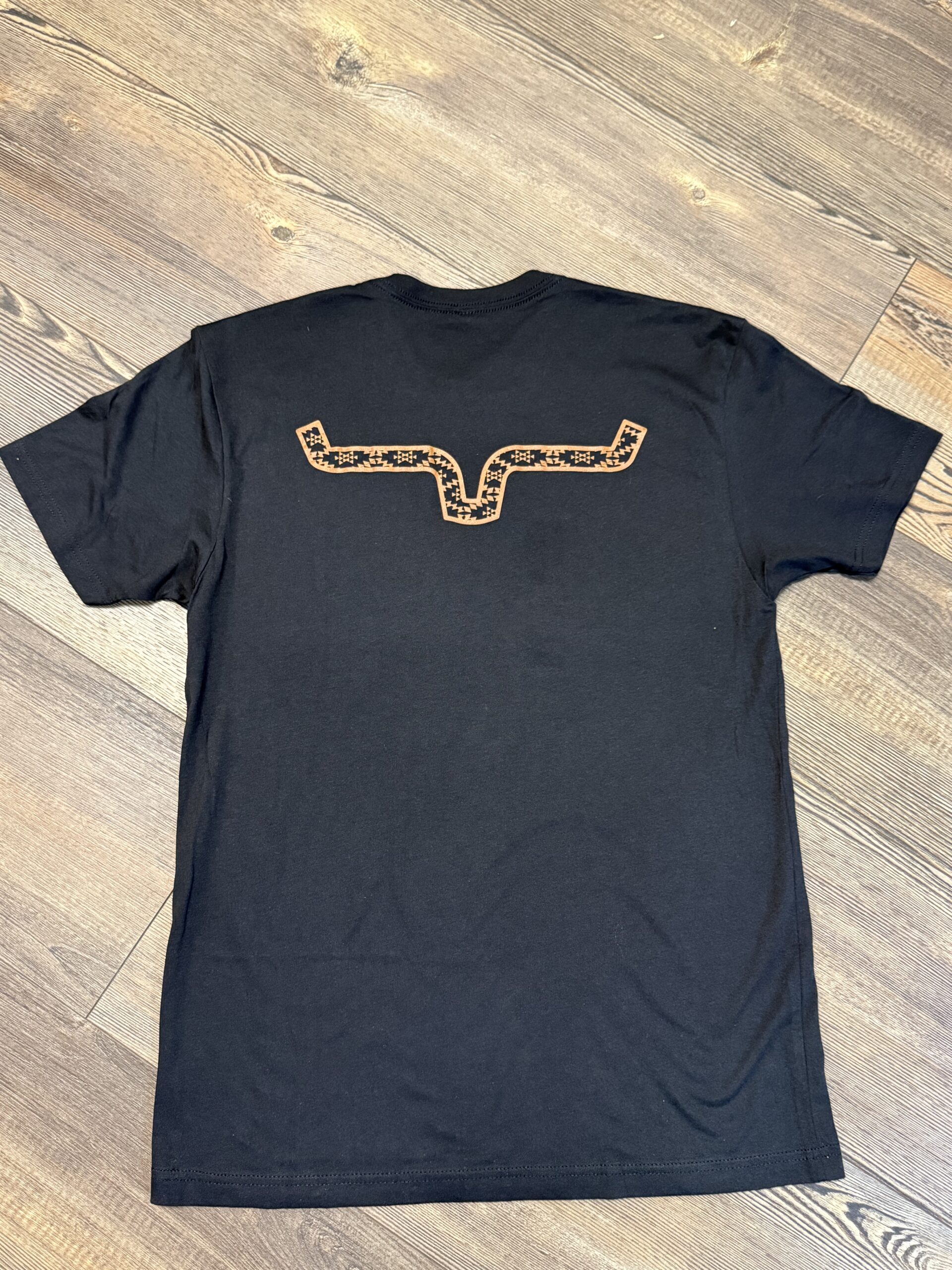 Good tees made for every day! Great simple black tee featuring the Kimes logo centered on the back in a brown aztec print. The front displays the same logo located on the top left of the chest. Great for an easy every day attire. Dress it up with your favorite Kimes denim and an open front jacket.