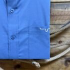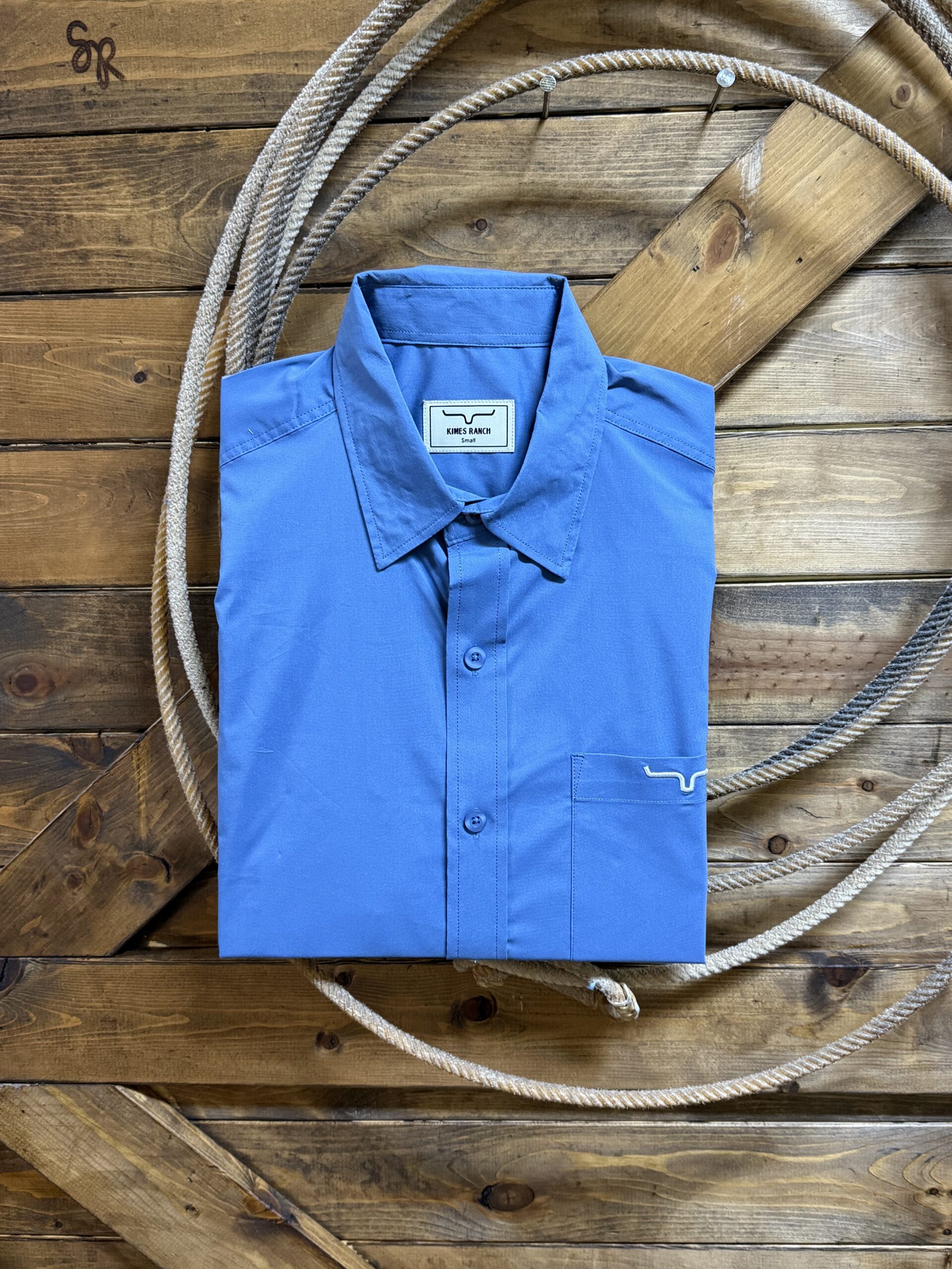 Classic in color and style. Carbon blue, a lighter shade of blue, on this basic long sleeve button down. Color matched buttons line the front and are found again at the sleeve end. An open front pocket sets neatly situated on the left side of the chest with the Kimes Ranch logo embroidered in white. The material of this shirt is designed to keep you cool, dry, and comfortable to allow you the best fit. The perfect amount of stretch allows you to move freely without sacrificing a sharp look. Great for days in the arena, office, or a night out. Its suited to adjust to your active lifestyle.