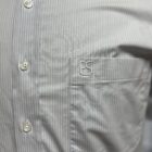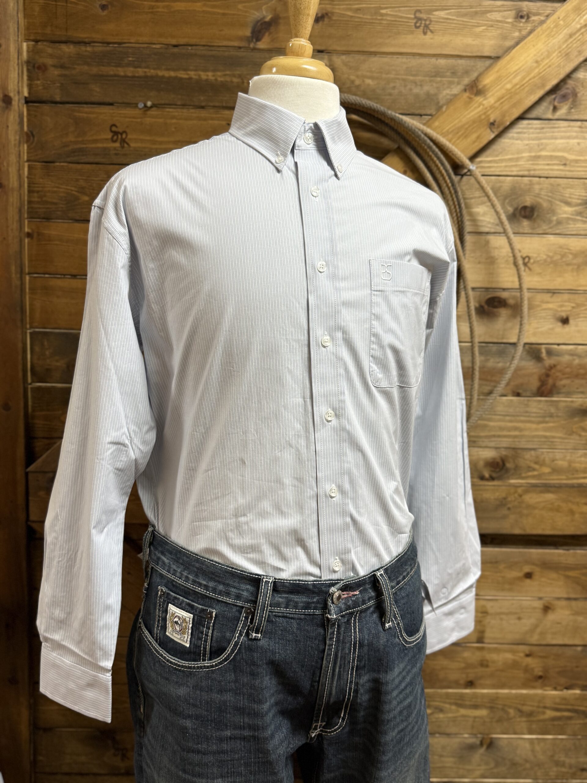 Great classic blue and white pin stripe! The light blue and white stripes collide for a professional look in any situation. Classic white buttons line the front, pin down the collar, and adjust the sleeve end on a 2 button set. The open front pocket sets on the left side of the chest sporting the Panhandle Slim logo in a white embroidery. Great look for any type of day regardless of the agenda!