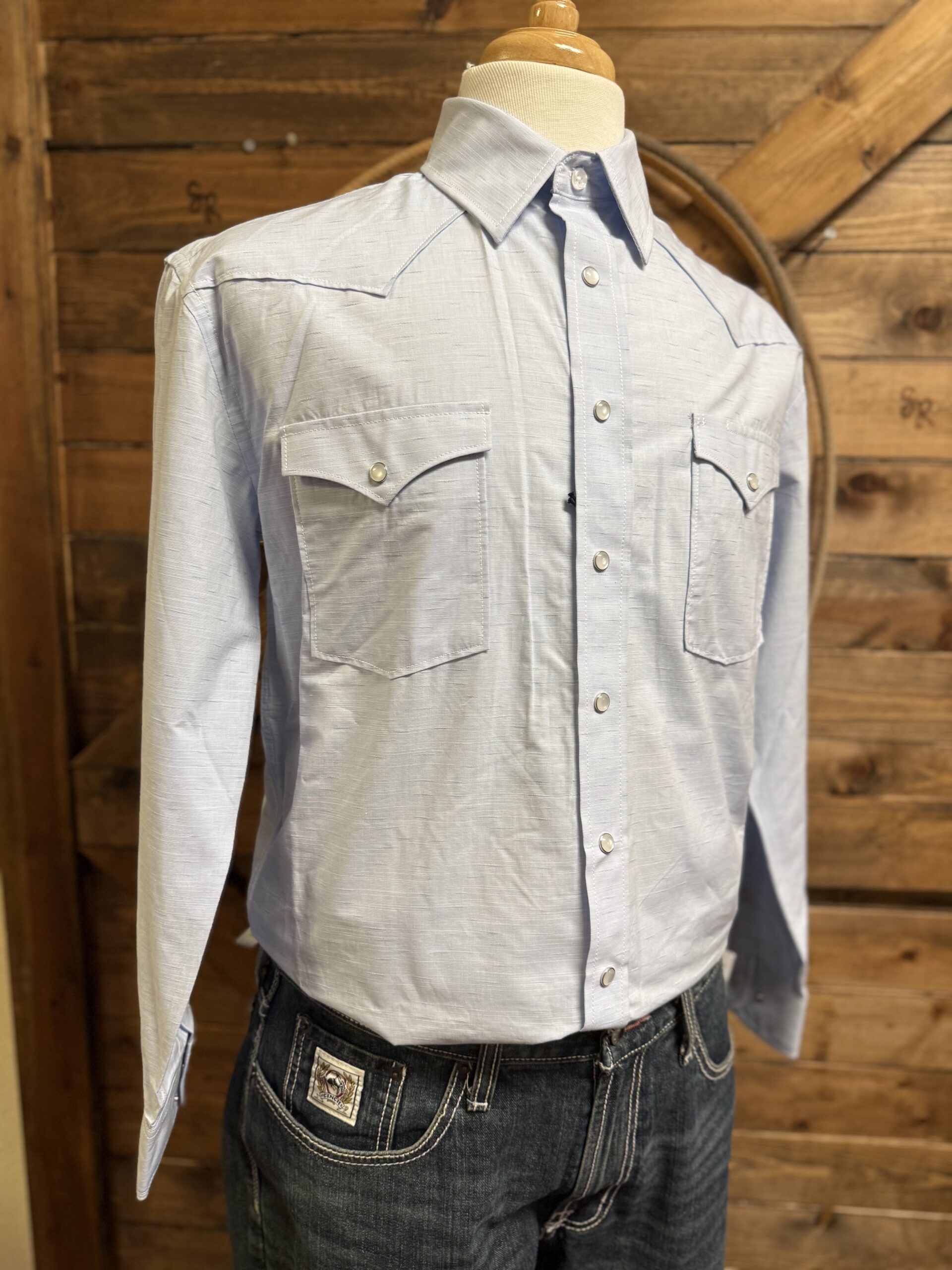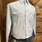 Pearl snaps with double front pockets are the epitome of style for the western cowboy. A nice lightweight breathable long sleeve features pearl snaps down the center of the front and at the sleeve ends as well. A front pocket sets on each side of the chest with a flap closure on a single pearl snap. The western yoke is visible across the front of the shoulders with a single white stitch and again on the back across the center of the shoulders. Pretty light blue with a dark blue pull scattered throughout. Serves as an everyday work shirt or one that you get out on a nice occasion. Great western cut and style!