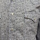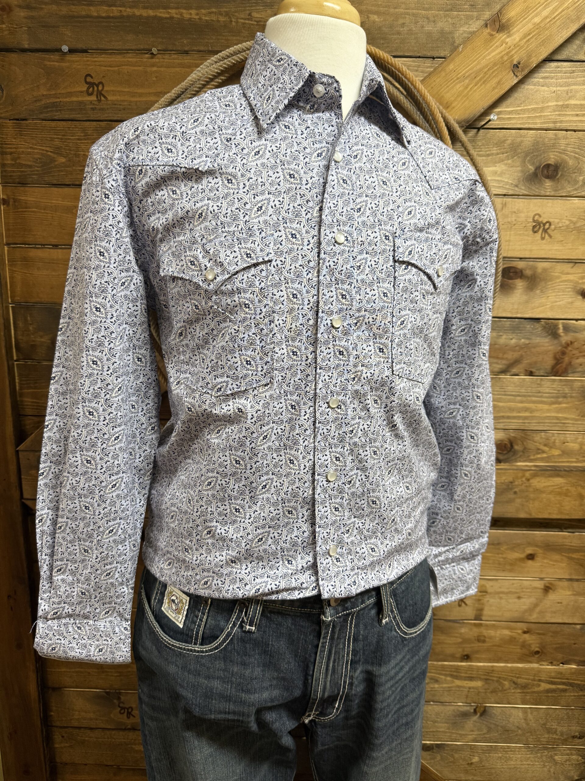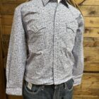 Pearl snaps are the center of western attire. Featured on the front of this blue floral print long sleeve, they can be found down the front, closing each of the front chest pockets, and again at the sleeve end. A western yoke seam comes down across the front of both shoulders and again across the backside of the shoulders. Great classic fit for whatever event you are styling. Pairs nicely under a solid sport coat for a more formal look.