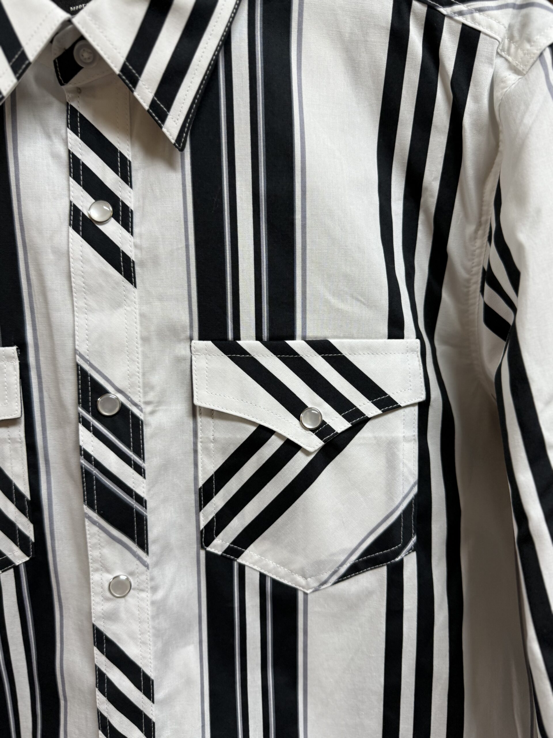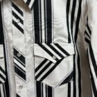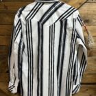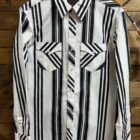 Here is a vintage look in the classic black and white stripe! Great pearl snap long sleeve shirt with all of the vintage in the color and stripe pattern. The front features a double front pocket, one located on each side of the chest with a single pearl snap flap closure. A western seam carves out the backside of the shoulders. Great modern fit will run true to size. The material is designed with the reflex technology that allows the material a slight amount of stretch. A comfortable fit all over that will allow you a little extra stretch in all of the areas in which you may need it the most. Create yourself a traditional western look with all of the vintage effects.