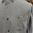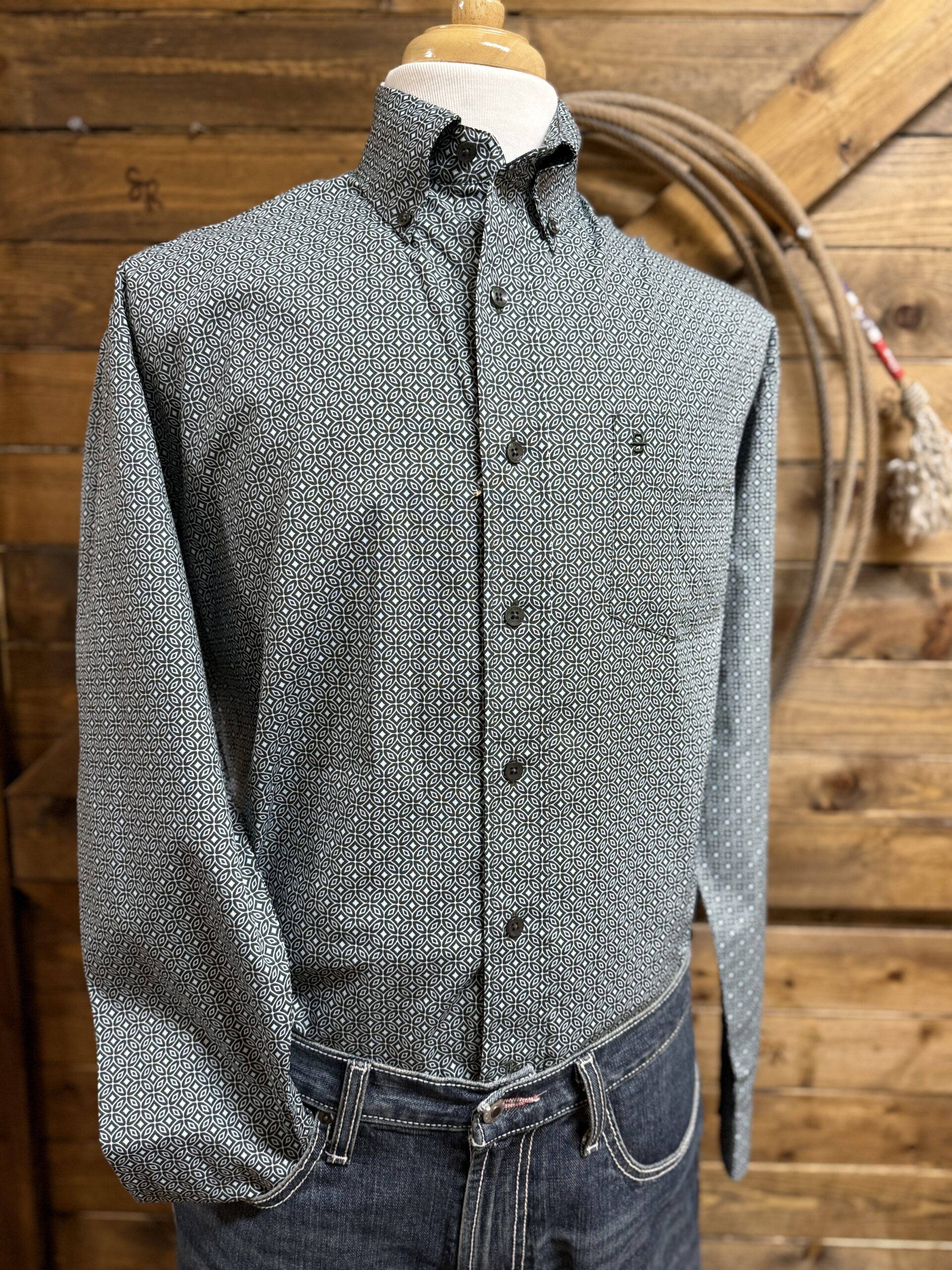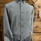 Long sleeve button downs are a mens must have. They are easy to dress up or dress down for day to day wear. Cool color combination of green mixed with light blue create a round geo print pattern. Deep green buttons line the front, pin down the collar, and adjust the sleeve ends on a 2 button set. The left side of the chest displays an open pocket featuring the Stetson logo embroidered in a deep green thread. Made for any occasion, this classic fit is an easy one to grab from the closet on any given day.