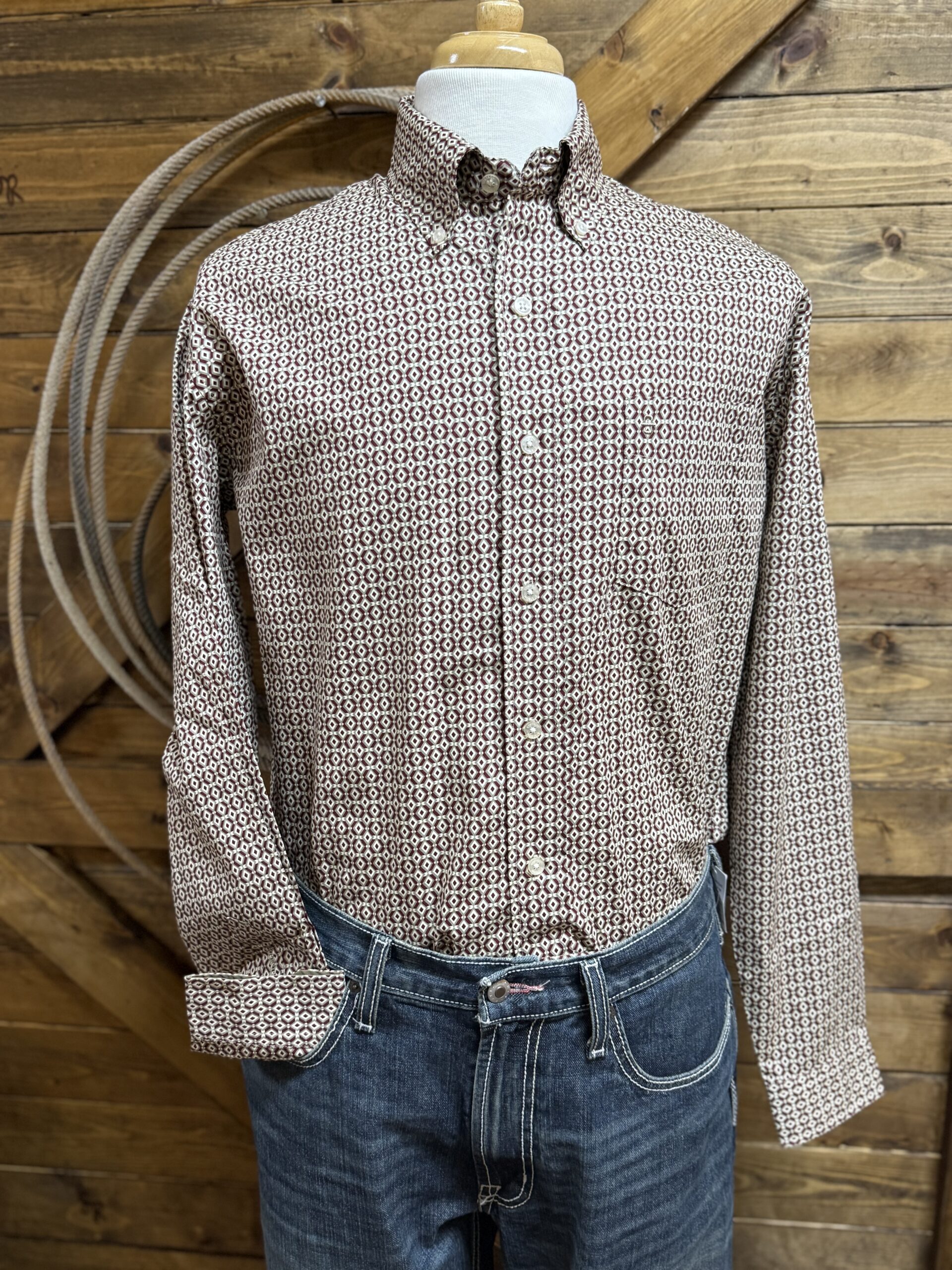 Look sharp in a Stetson, shirt that is! Great red diamond print outlined in a tan and off white highlight. The front features a classic white buttons down the front, pinning down the collar, and again at the sleeve end on a 2 button adjustable set. An open front pocket is situated on the left side of the chest with the Stetson logo embroidered in the corner. A classic fit that is made for your comfort. Great everyday pattern for office days or spice it up a bit and put your best solid sport coat over the top. A look that is sure to grab a look!