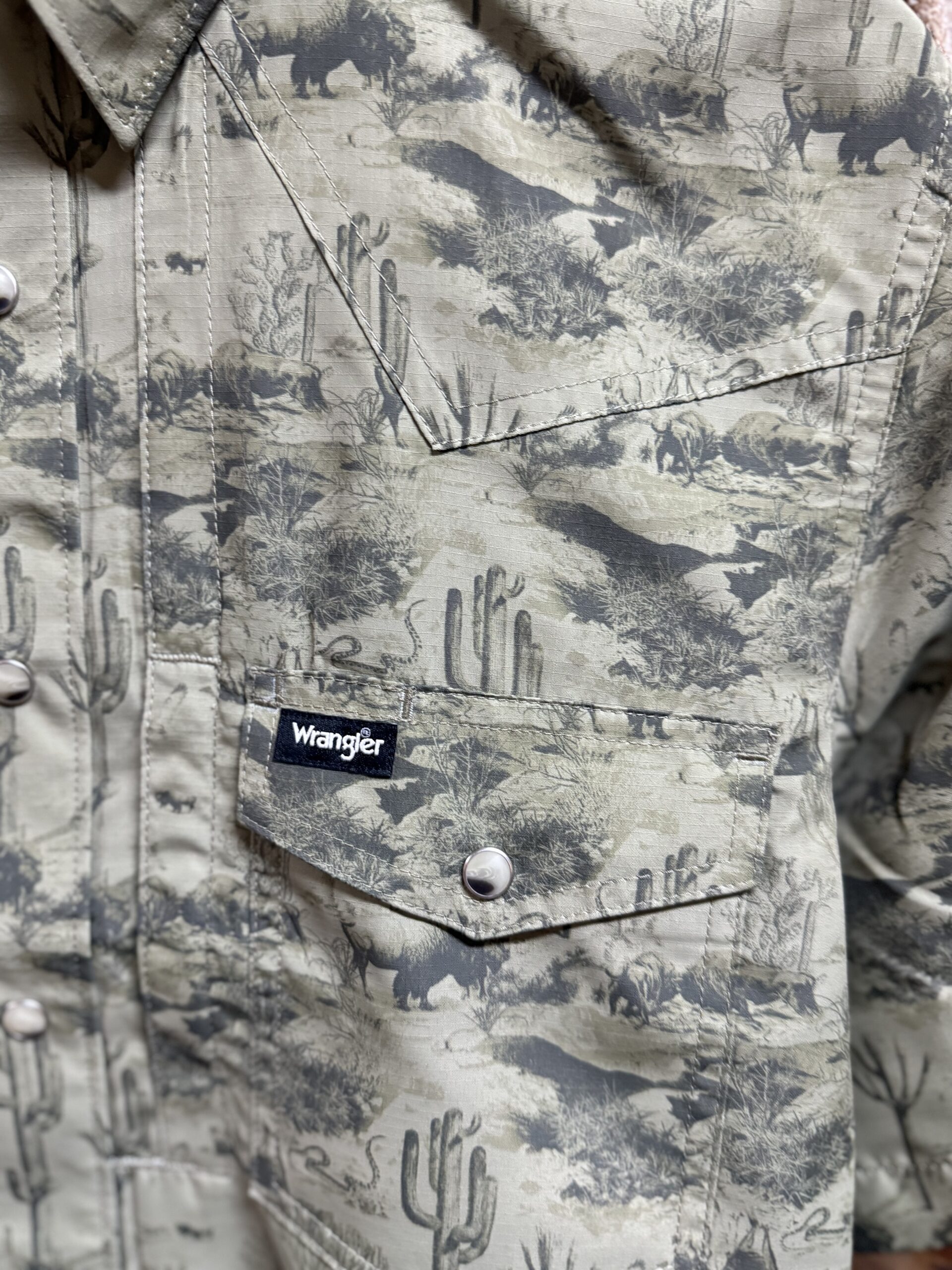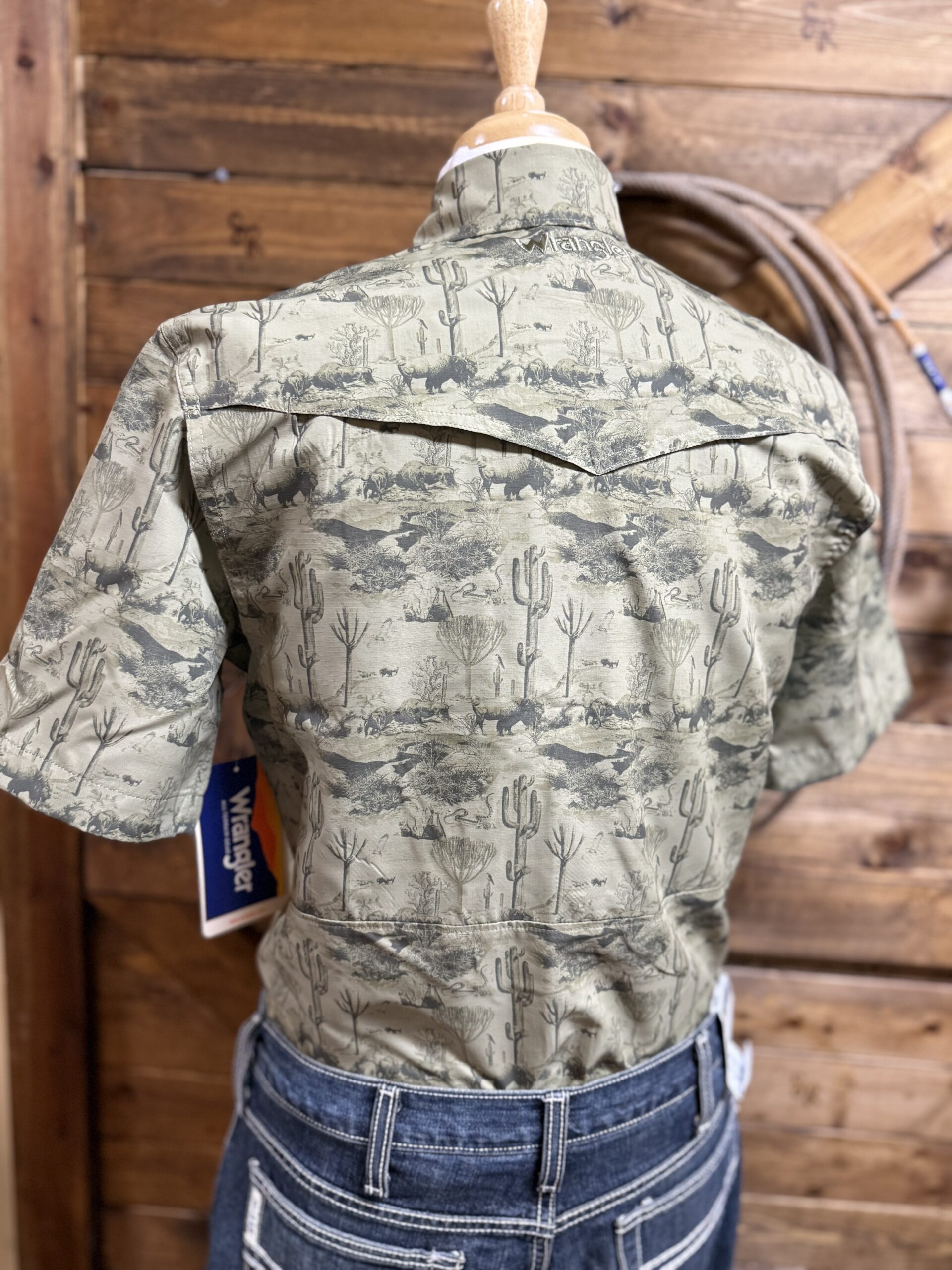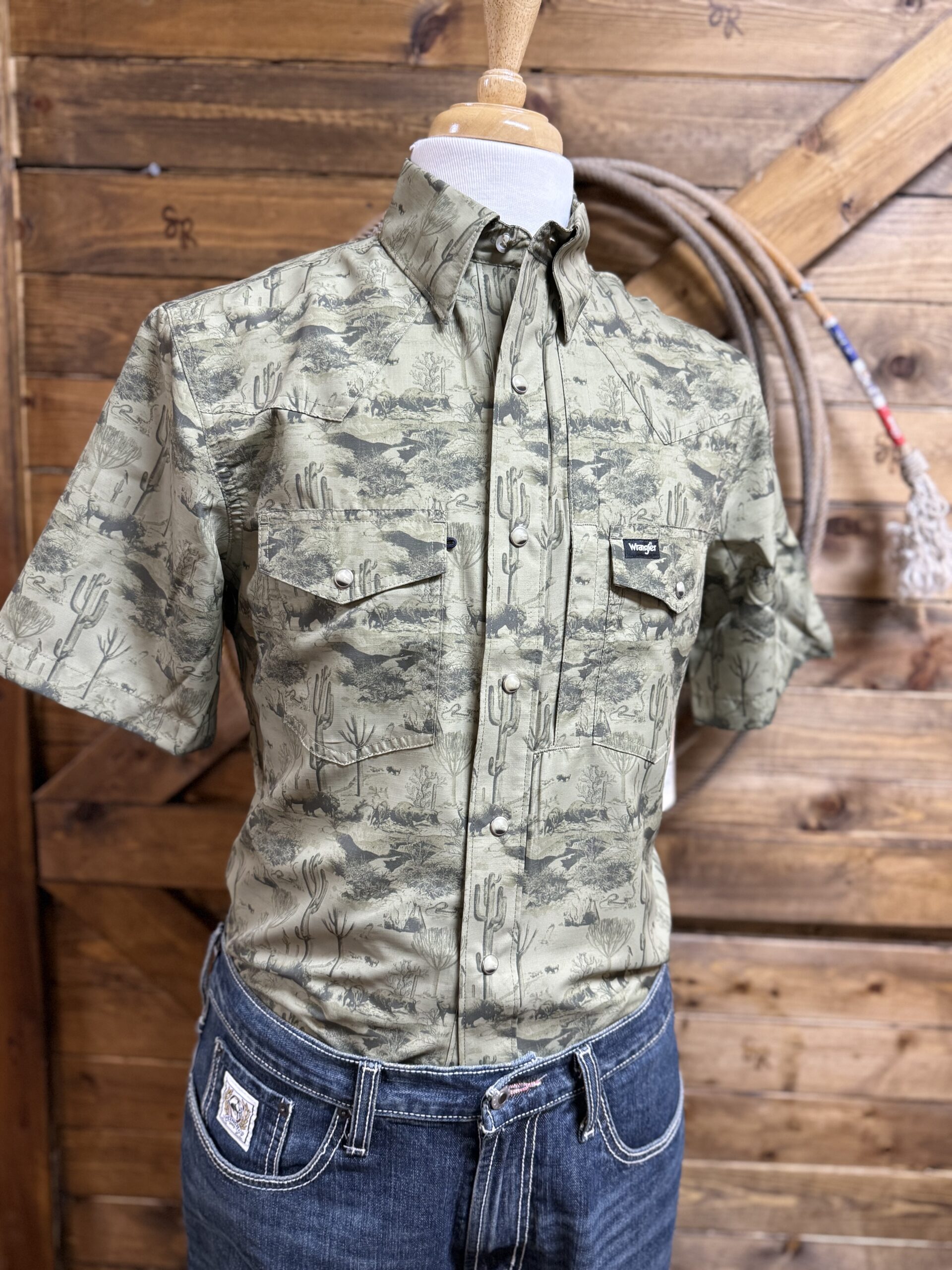 Be the first to review “Mens Wrangler ATG Performance S/S Pearl Snap-Olive Western Print”