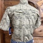The performance gear from Wrangler, ATG( All Terrain Gear) is without a doubt comfortable for a full days work. A relaxed fit performance shirt made from the lightest moisture wicking material. It’s designed to be cool and comfortable allowing moisture to escape your body in a dry fit. It also protects you against UV rays with a 40+ protection rating. The olive western print design in scattered throughout the entire shirt in a darker print of green. A traditional relaxed fit western designed shirt carries the western yoke seam down across the front of both shoulders and again across the back of the shoulders. Pearl snaps line the front and close each of the chest pockets on a single snap. Venting across the back of the shoulders lays within the yoke seam and comes down the side as well just below the point of the shoulder. A great western look in a performance material made for a variety of occasions. Outdoors, indoors, working, leisure. You name it its suited.