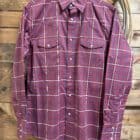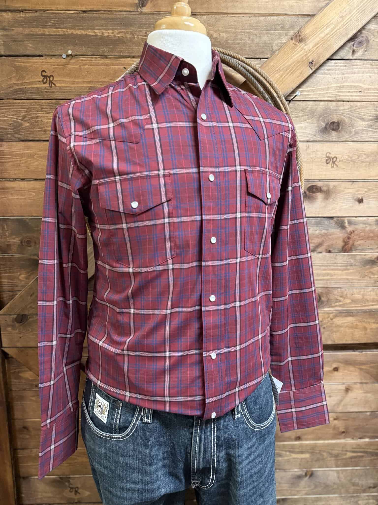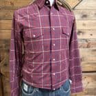 It’s a classic closet piece! A basic western style long sleeve featuring all the western things. Pearls snaps line the front and close the cuff on 3 pearl snaps. Double front pockets each close on a single pearl snap while the left pocket features a pen slip. The western yoke cuts across the front of the shoulders as well as the center of the shoulders on the backside. Pretty burgundy plaid is lightened with blue and white plaid.