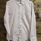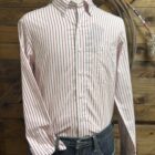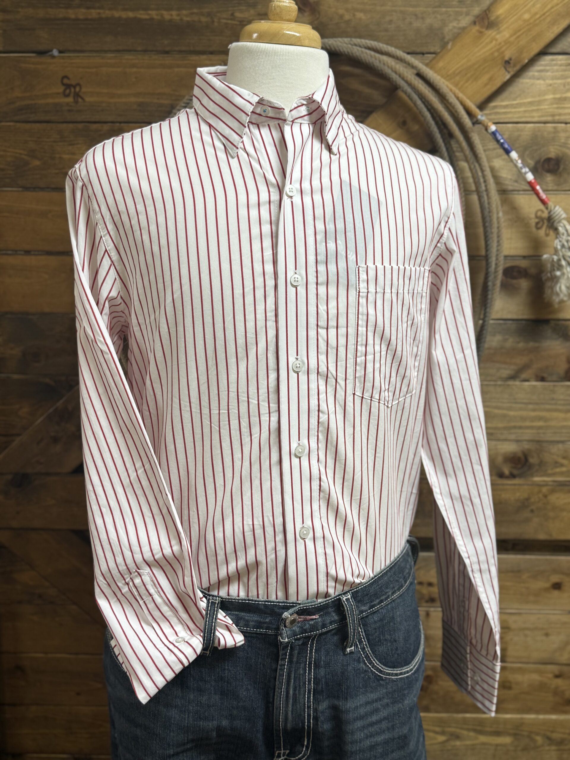 When Wrangler and CoJo do a collab it always turns out good! Pretty red and white striped traditional button down. Classic white buttons come down the center of the front and adjust the sleeve on a two button set. The collar is held down with the smallest white button that are laid under the edge of the collar. An open front pocket sets on the left side of the chest in the same red and white stripe pattern. The CoJo logo is found on the left sleeve cuff in a red threaded embroidery. The classic fit will allow for a more generous cut and fit alike. Perfect for everyday wear. This is the kind and print that is easily dressed up a bit paired with your best solid sport coat.