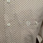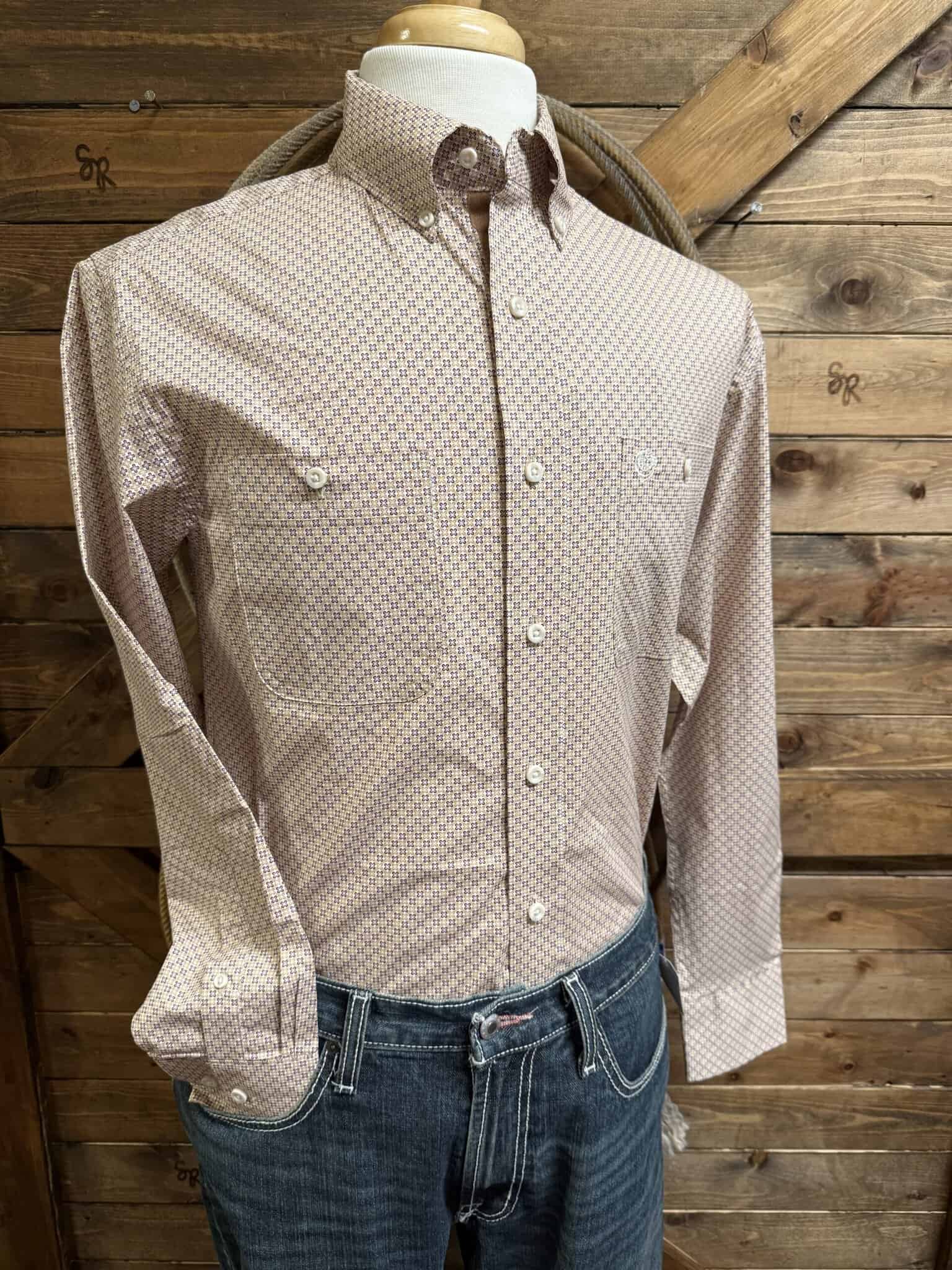 George Strait has a line with great prints and color patterns in the always great Wrangler Brand. The classic fit allows a bit of extra room in all the spots you need it most. Nice lighter weight cotton for a comfortable fit. The front features marbled buttons down the front, at the collar, and again on a 2 button adjustable sleeve. Colors of warm brown and plum make up the floral like pattern. Double front pockets set on each side with a single button closure. Made to wear all day or under a sport coat for a nice occasion or dinner date.