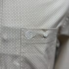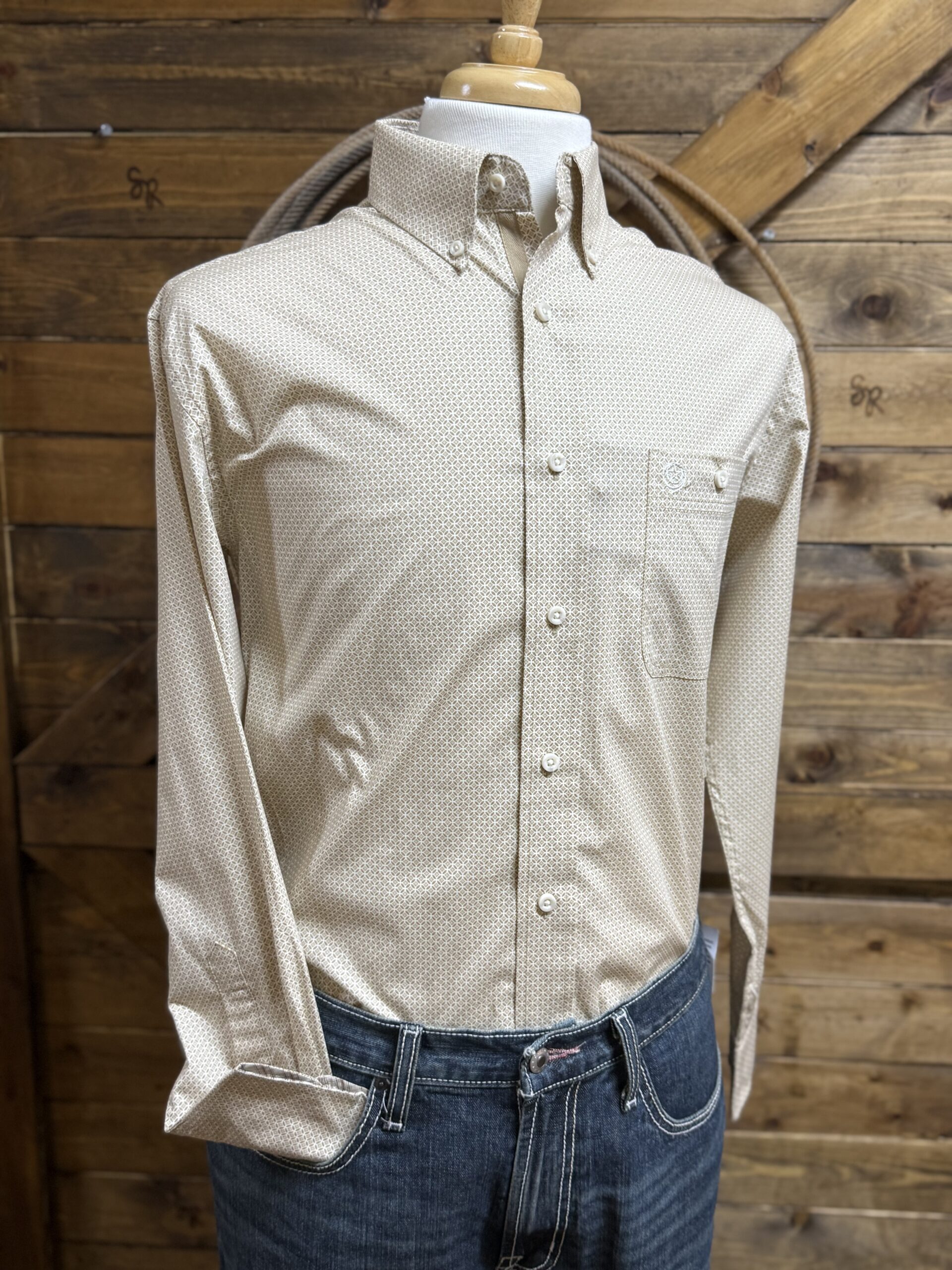 Another good button down from the George Strait Collection. Pretty tan geo print is a neutral color and print that’s easy to pair. Classic round buttons line the front, pin down the collar, and adjust the sleeve on a 2 button set. The front left side of the chest displays an open front pocket with a single button closure in the center. Great for evenings out or summer time wedding festivities. A look that never fades!