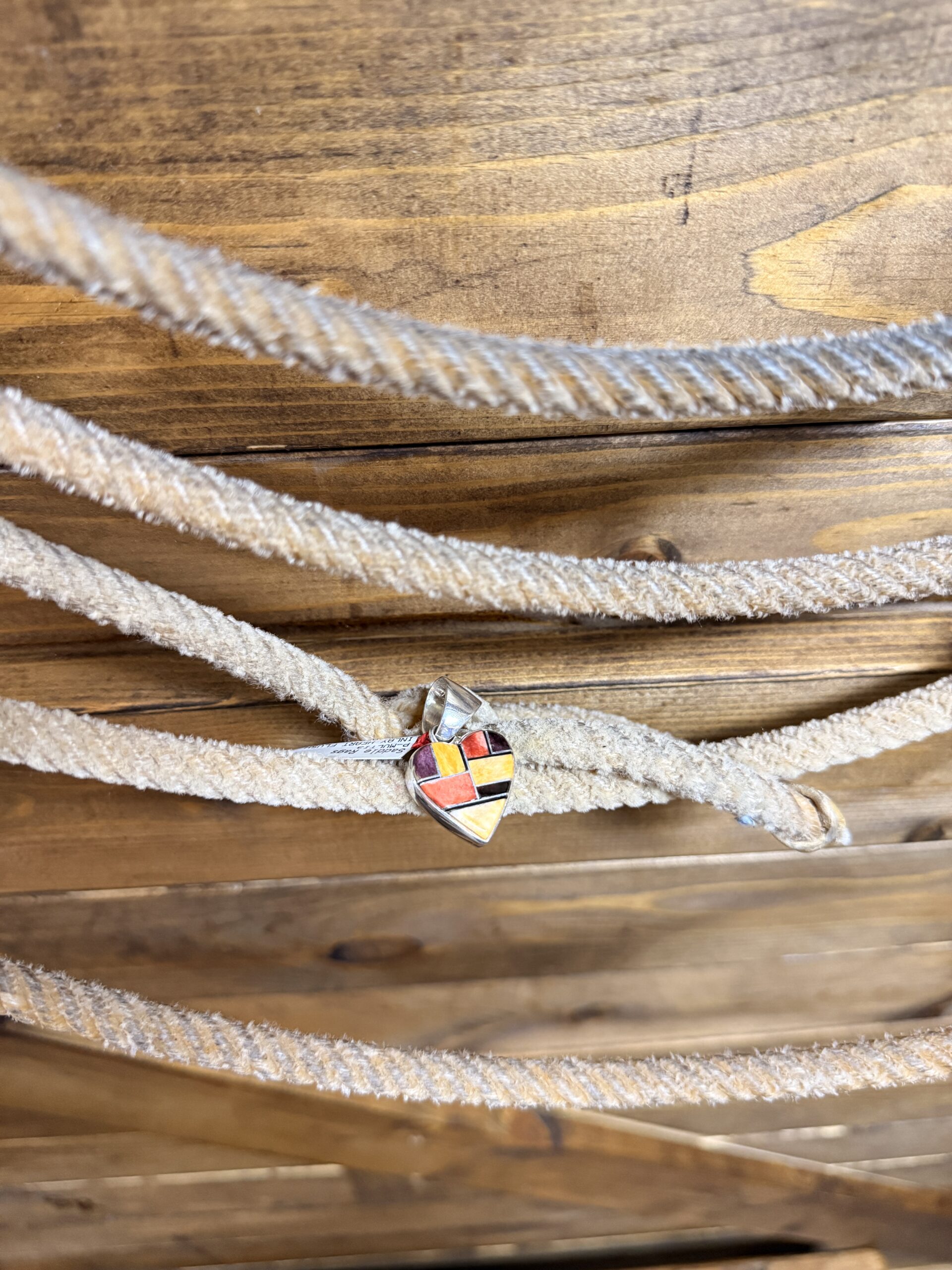 Authentic Native American made sterling silver heart shaped pendant with inlaid red, orange, & purple spiny oyster and onyx.