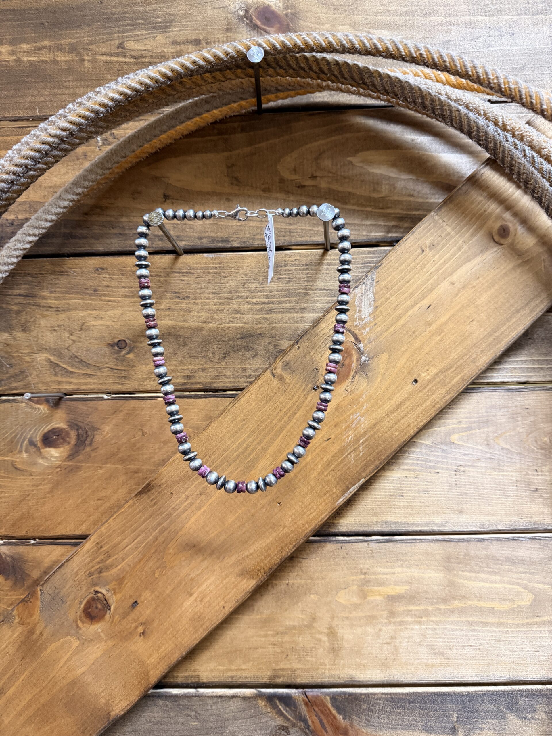 Authentic sterling silver Navajo Pearl beads & saucers strung with purple spiny oyster beads on 16″ necklace