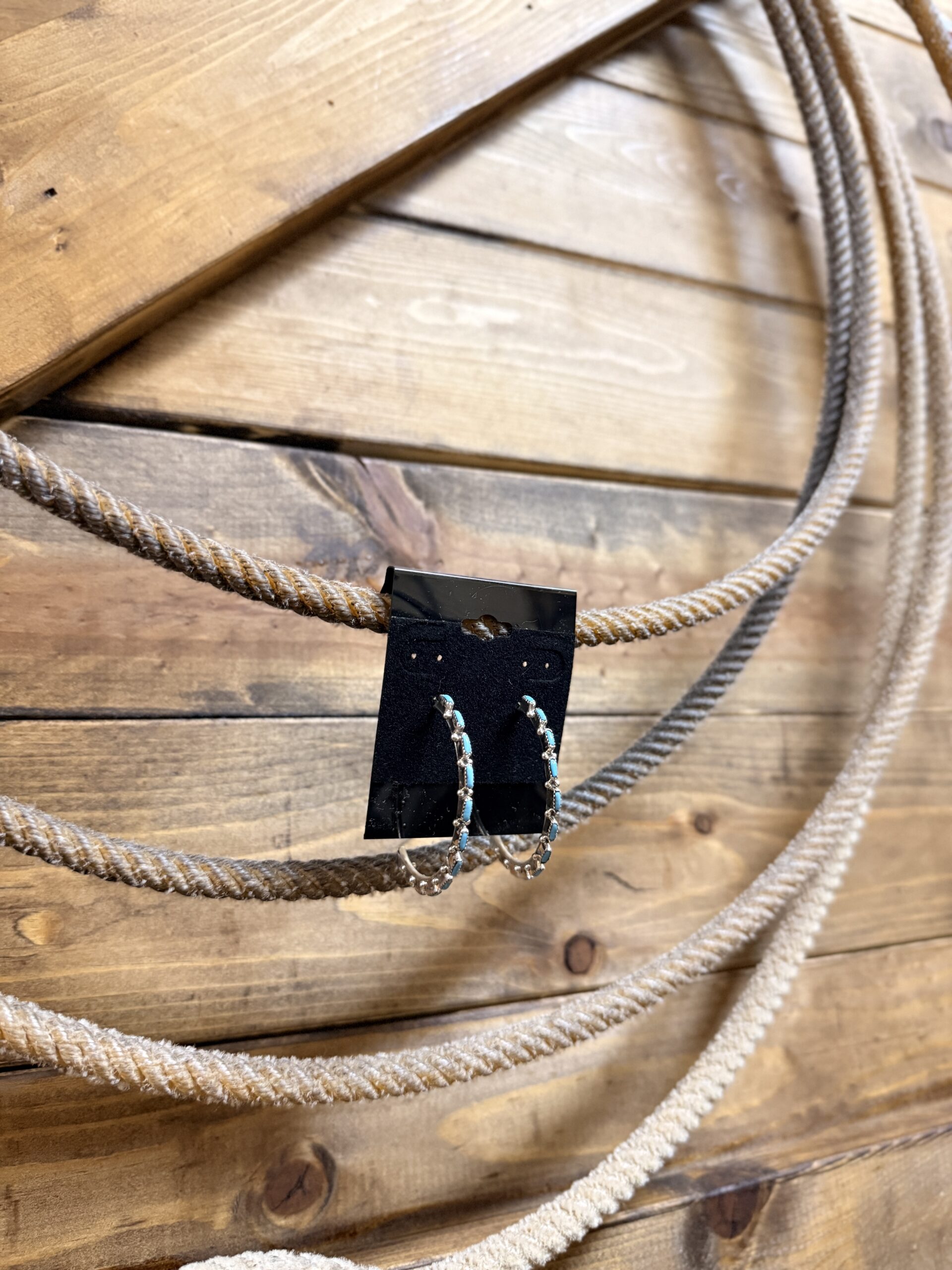 Authentic Native American made sterling silver and petit point turquoise 12 stone hoop earrings