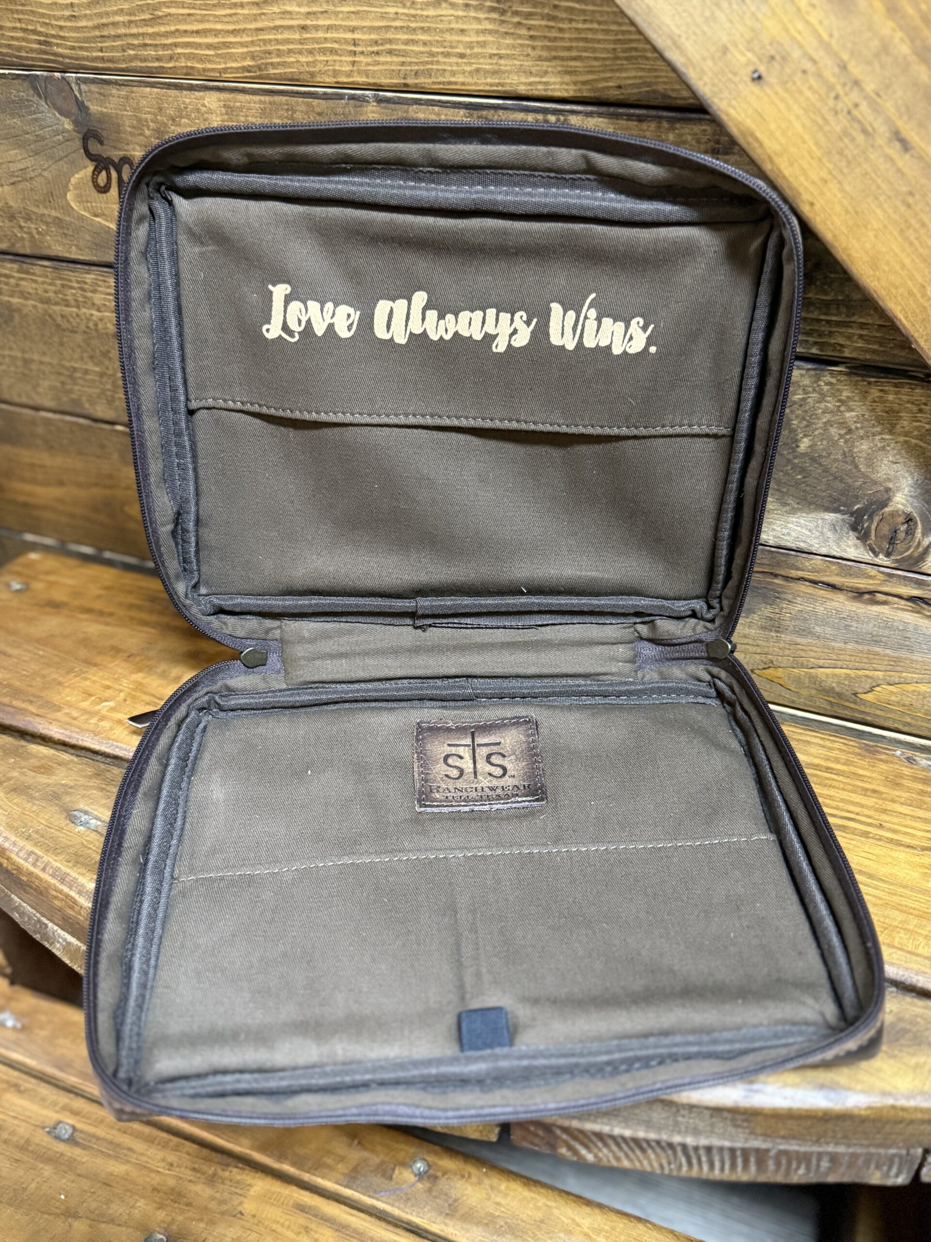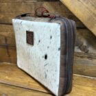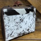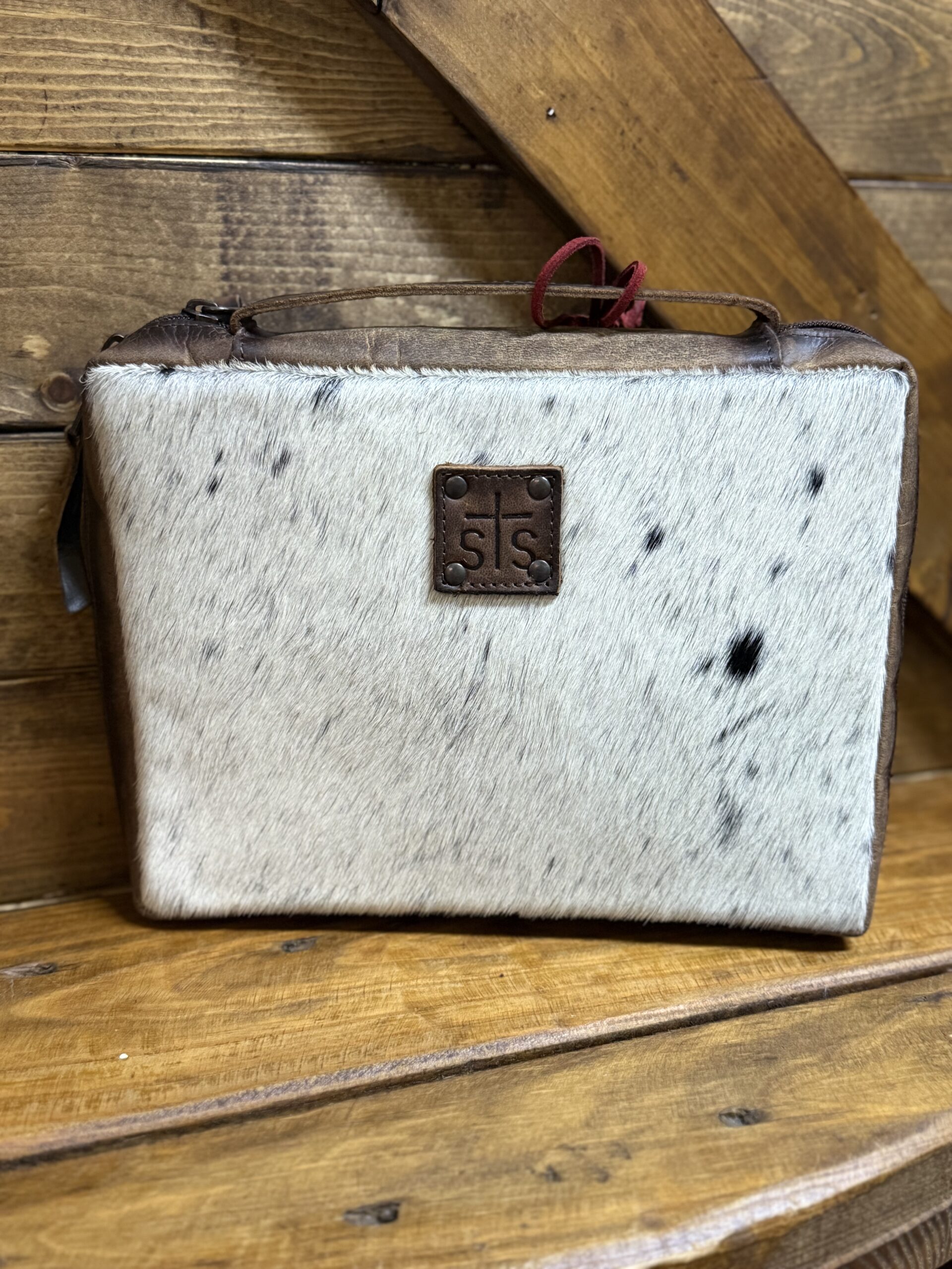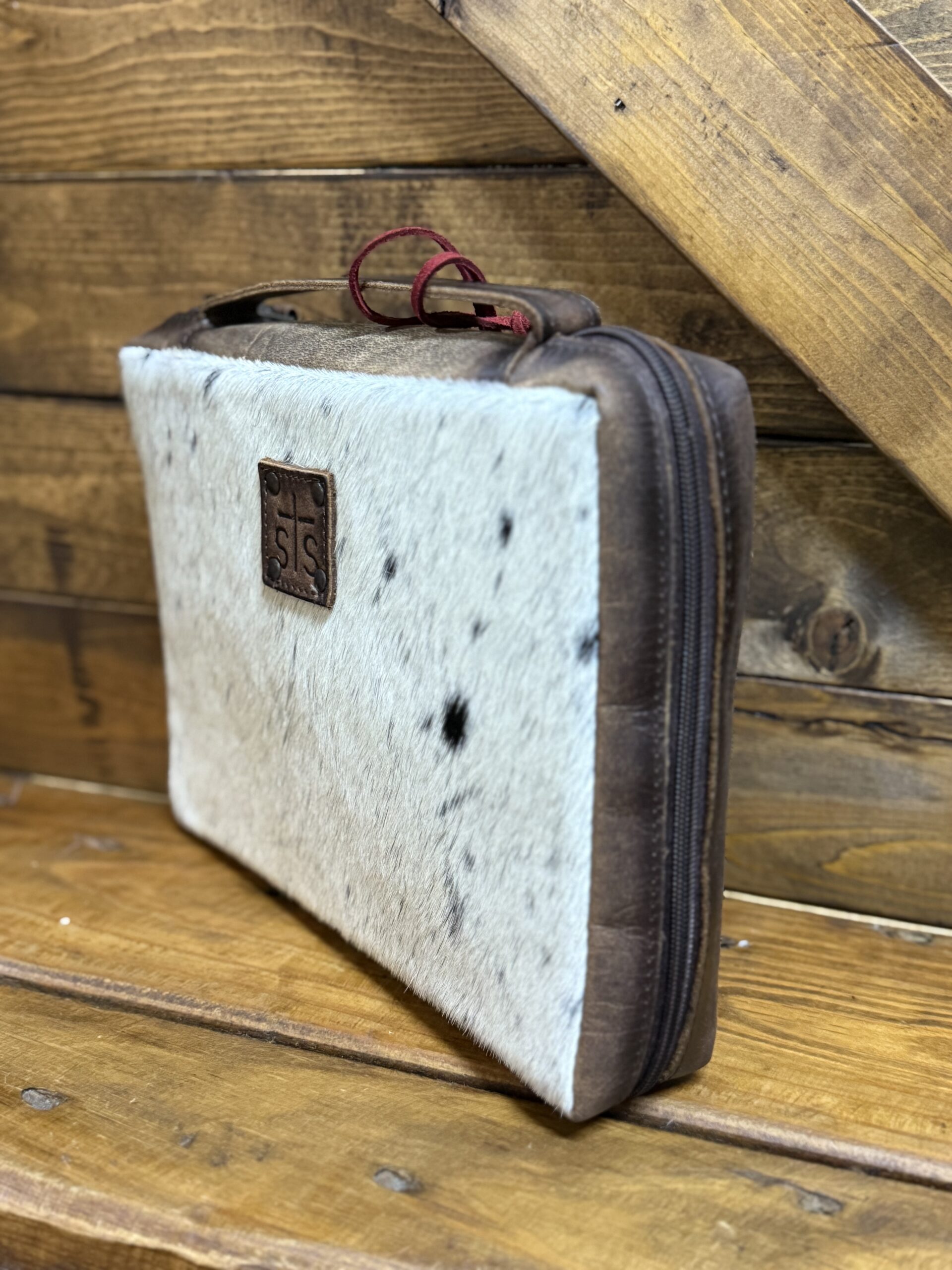 Cowboys and Cowgirls, keep your Bibles safe! Beautiful cowhide Bible cover securely stores the best book. Hair on hide covers the front and back alike featuring a slip pocket across the back. The leather STS patch is centered at the top on the front. A 3/4 double zipper goes nearly all the way around safely securing the closure. Inside are slips on each side to secure your Bible in place along with a pen or marker slip. Easily carried by the smooth leather handle that sets along the only solid outside edge. Needed not wanted, the cover to our most sacred book!