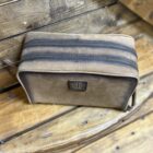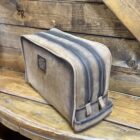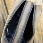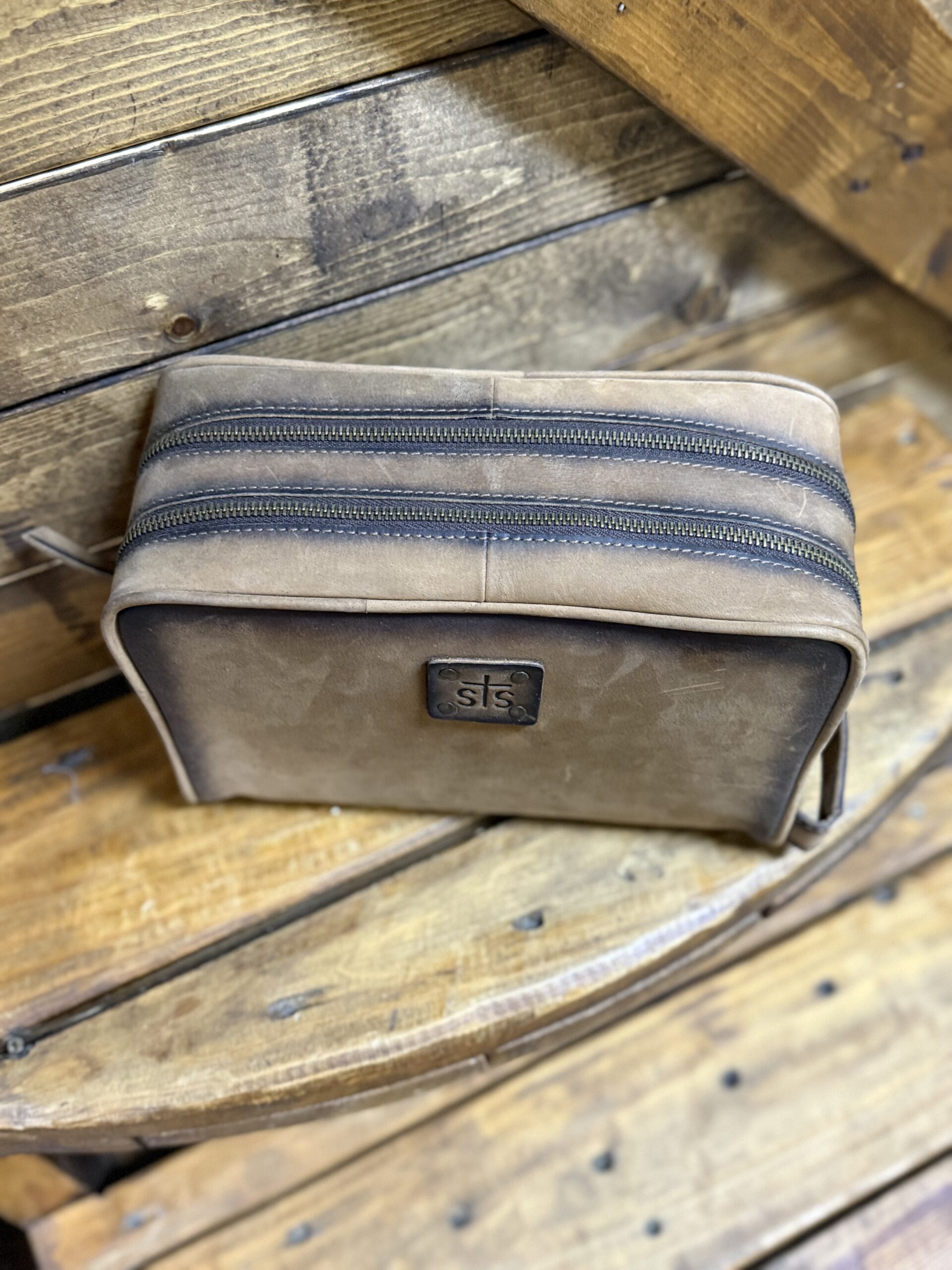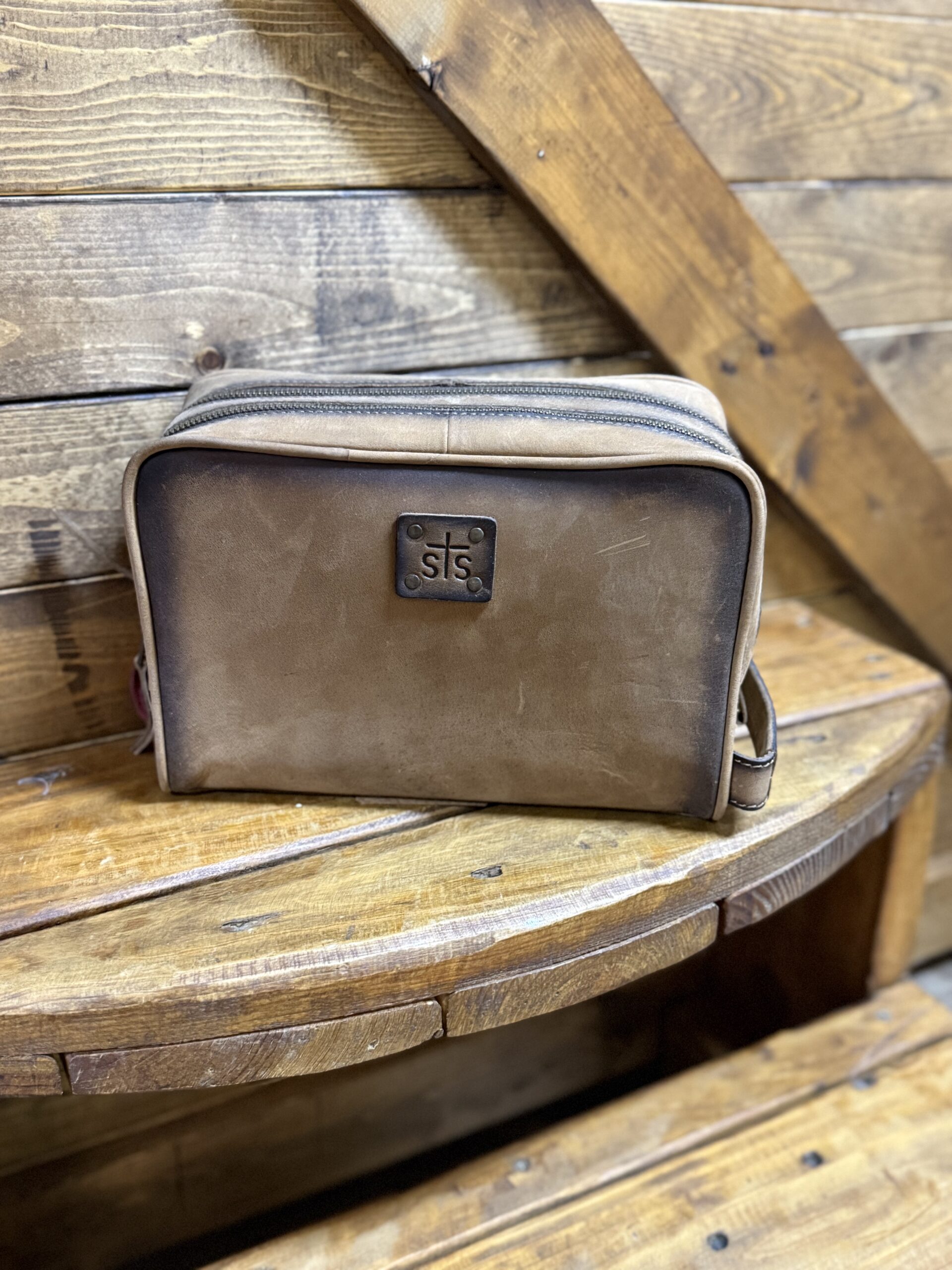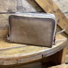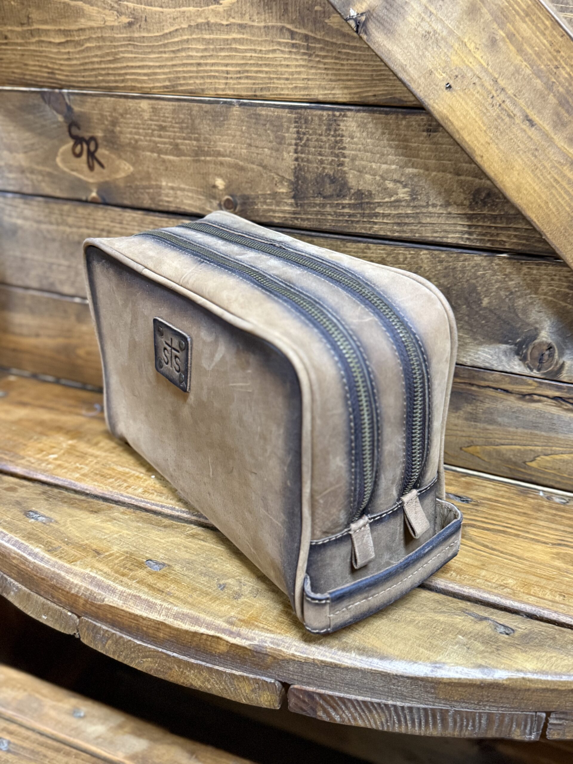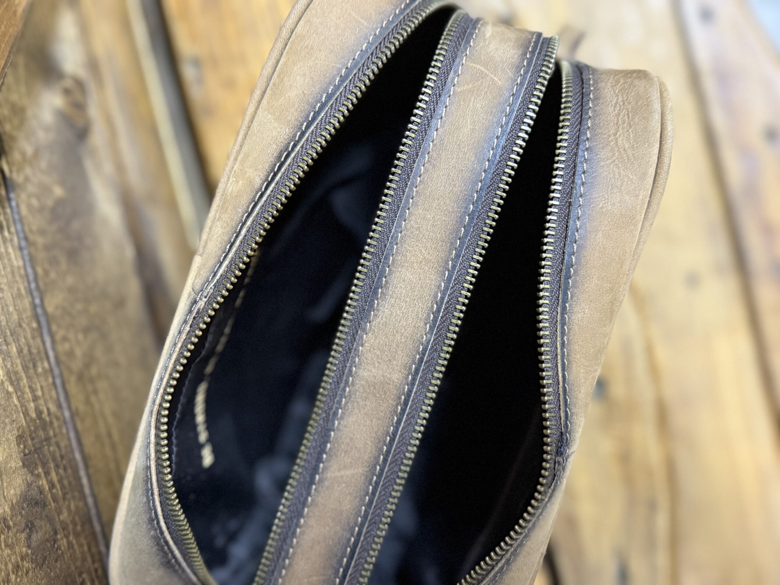 THE shave kit! A nice heavy distressed leather featuring a double zipper and double pockets. Each of the compartments open into a large open space. One of them has a zipper pocket while the other is a single large compartment. One end is designed with a thick matching leather handle for easy transport. No fancy design, just a good ol’ durable leather meant to handle all of the bathroom items during your travels. Great gift or hey, just get it for yourself!