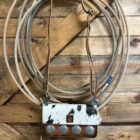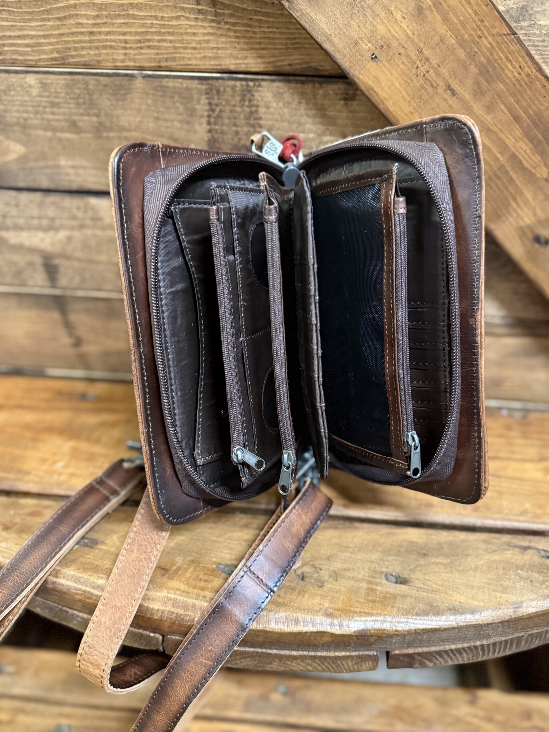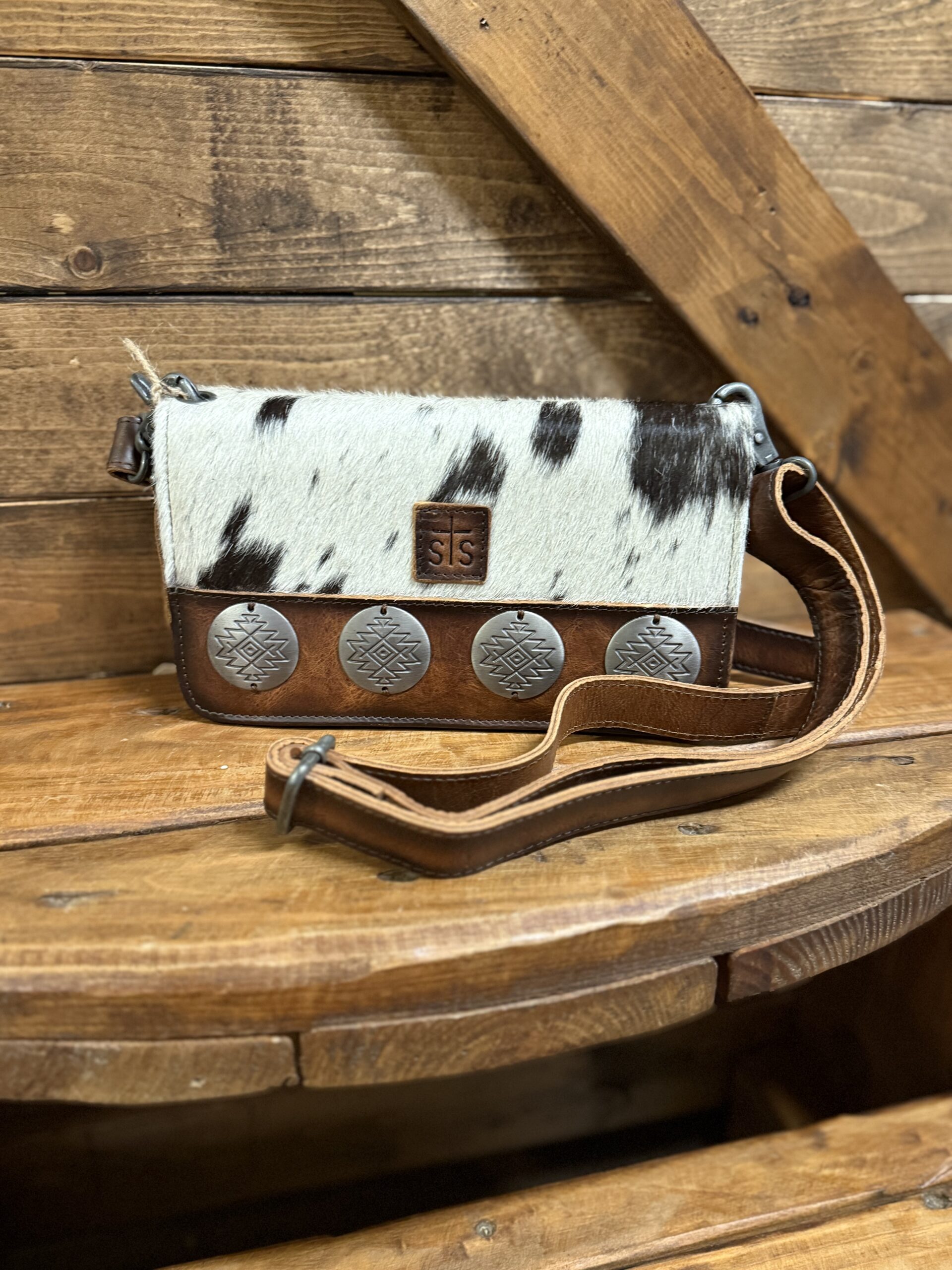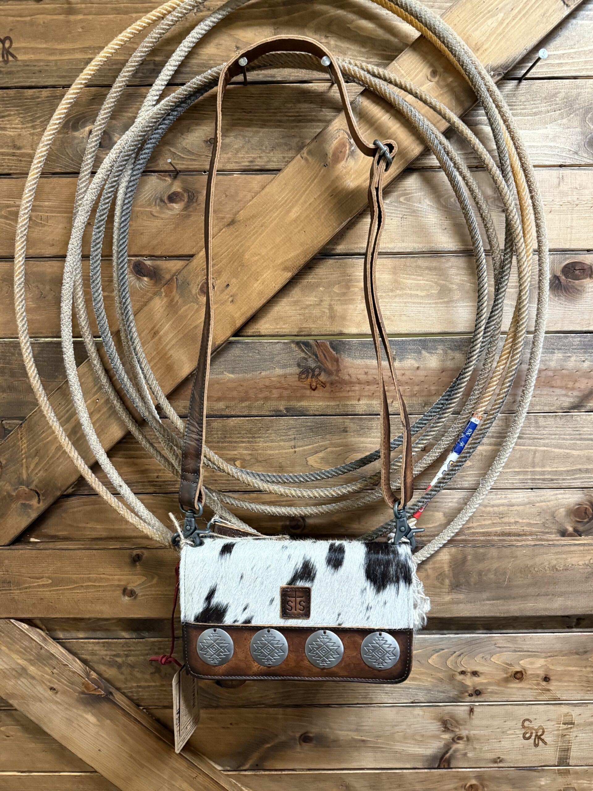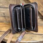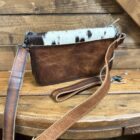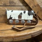 Evie is so functional! She pulls her own weight in style and look with a great combination of rich colored leather and hair on hide. The leather is beautifully accented with 4 large vaquero conchos across the bottom. The hair on hide wraps over the top and comes down to meet the leather and concho combination. The back is a large slip pocket of that beautiful plain leather. The matching strap across the top is easily removed on clasps. The wristlet strap can then easily be attached for a whole new look. Opening from side to side on a double zipper with leather pulls. It opens into a multi compartment with plenty of space for cards, cash, coins, 3 zipper pockets, and much more. A wristlet/organizer that has the space to store all your important things without the big shoulder bag look. It’s simple and elegant.