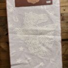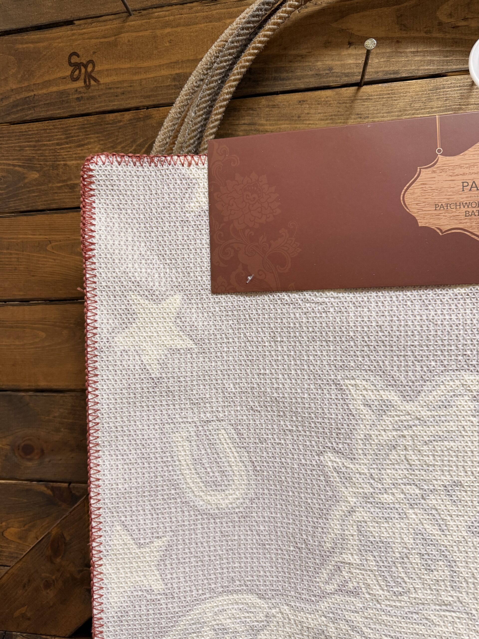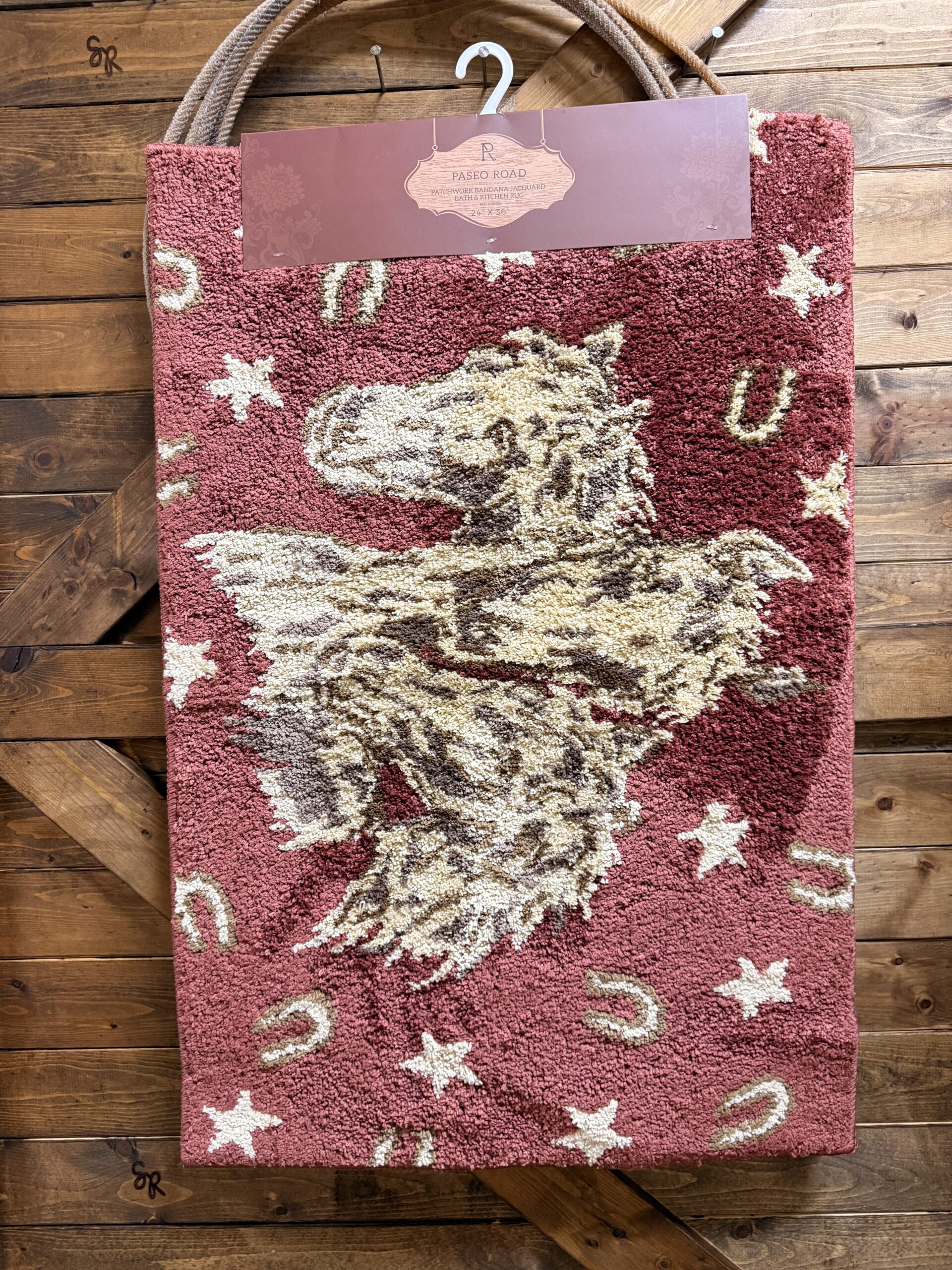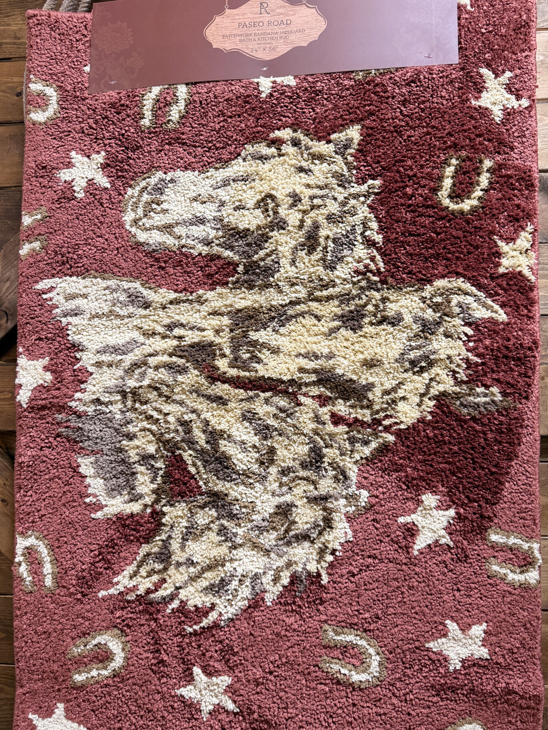 Two horses nuzzle beneath a scattering of stars and horseshoes on the Patchwork Bandana Red Horses Jacquard Bath & Kitchen Rug— a warm, spirited scene that celebrates the West’s most iconic companion. Cream and brown against a deep barn red ground give the scene a storied, hand-drawn quality, while stars and horseshoes fill the field with subtle detail. Jacquard construction brings the illustration to life with texture and depth, and the dense weave delivers the durability kitchen and bathroom floors demand. Measures 24” x 36”. Part of the Tasha Polizzi for Paseo Road Collection.