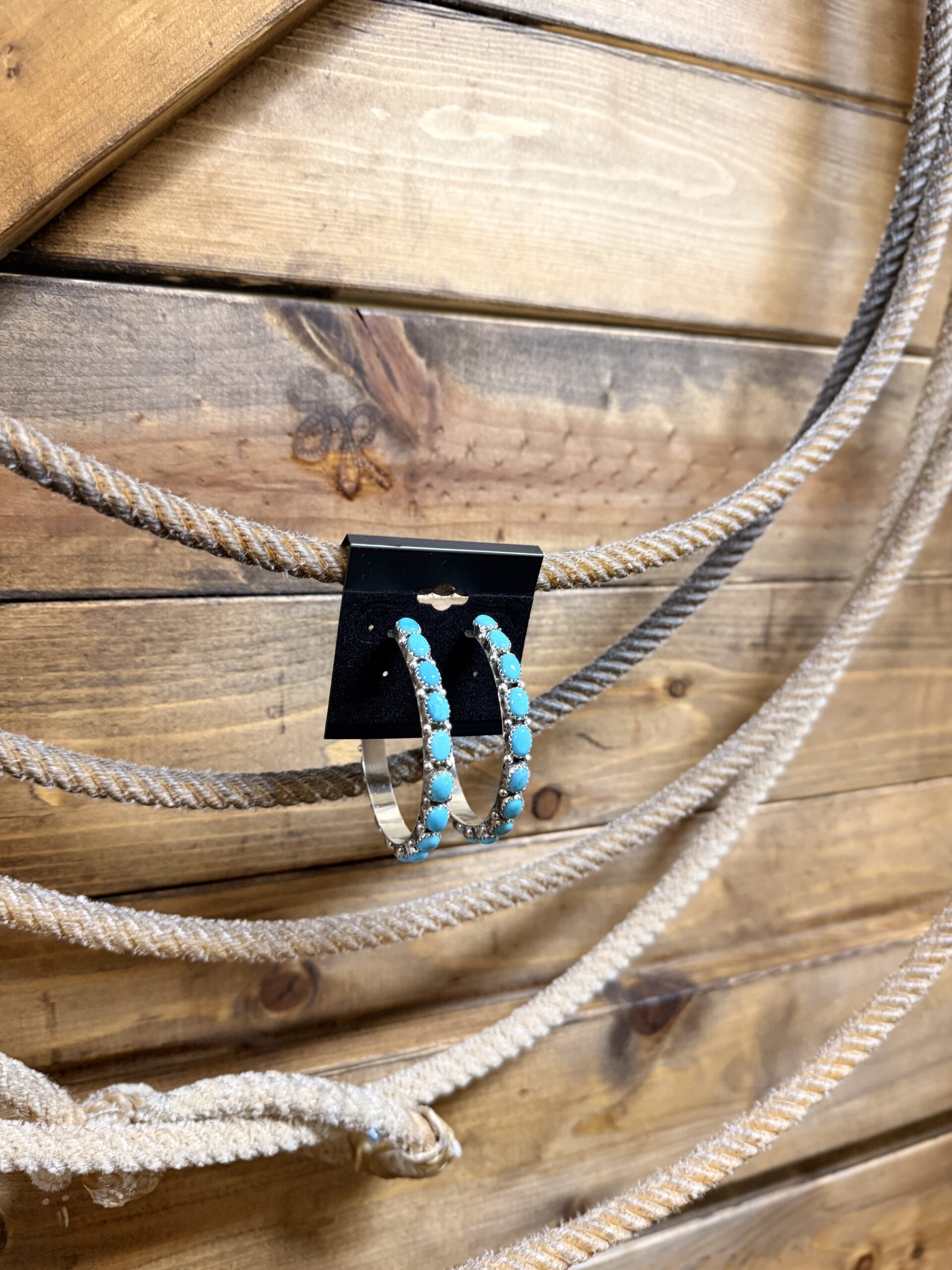 Authentic Native American made sterling silver 17 oval stone turquoise extra large hoop earrings