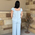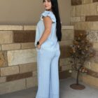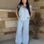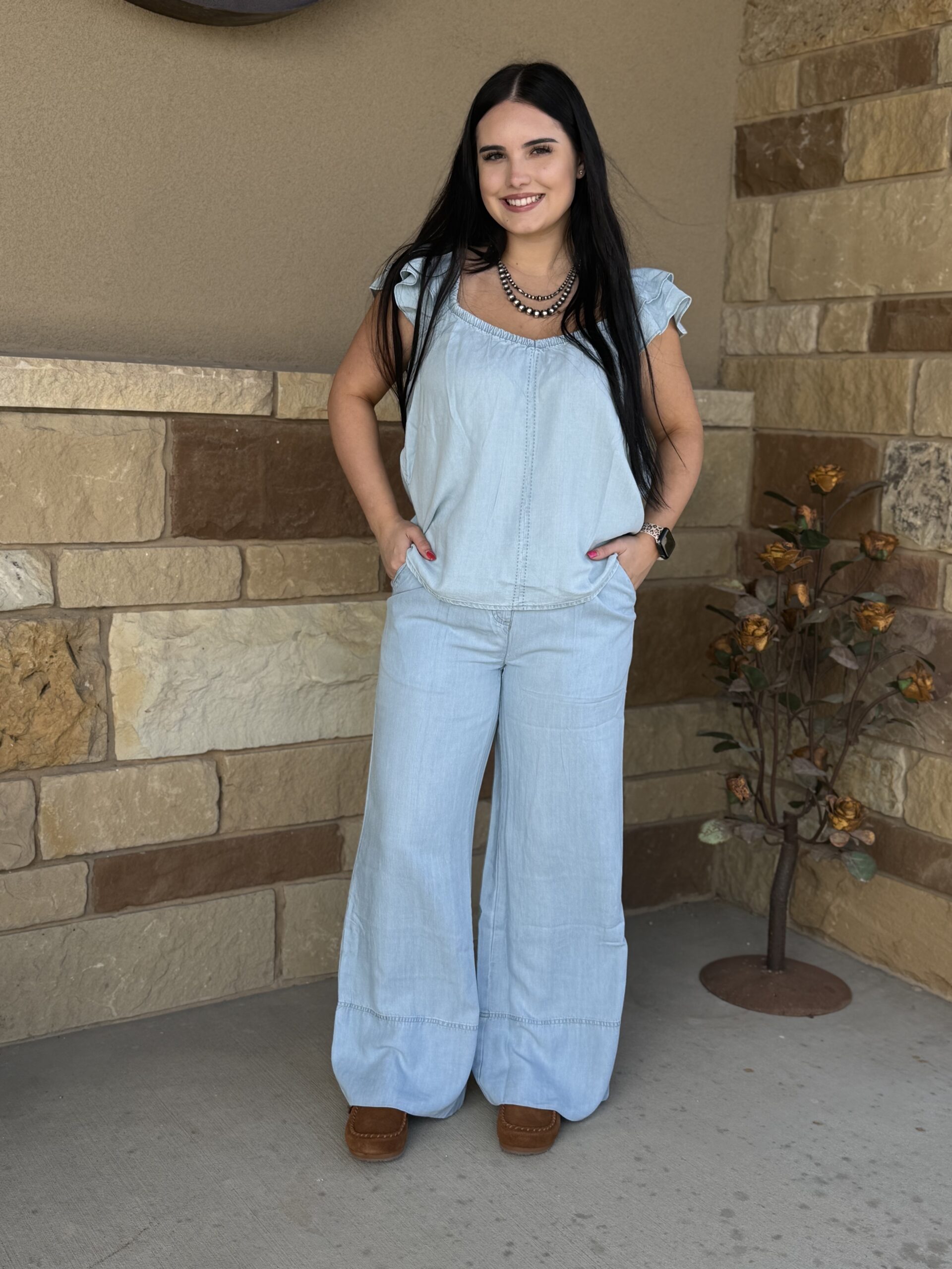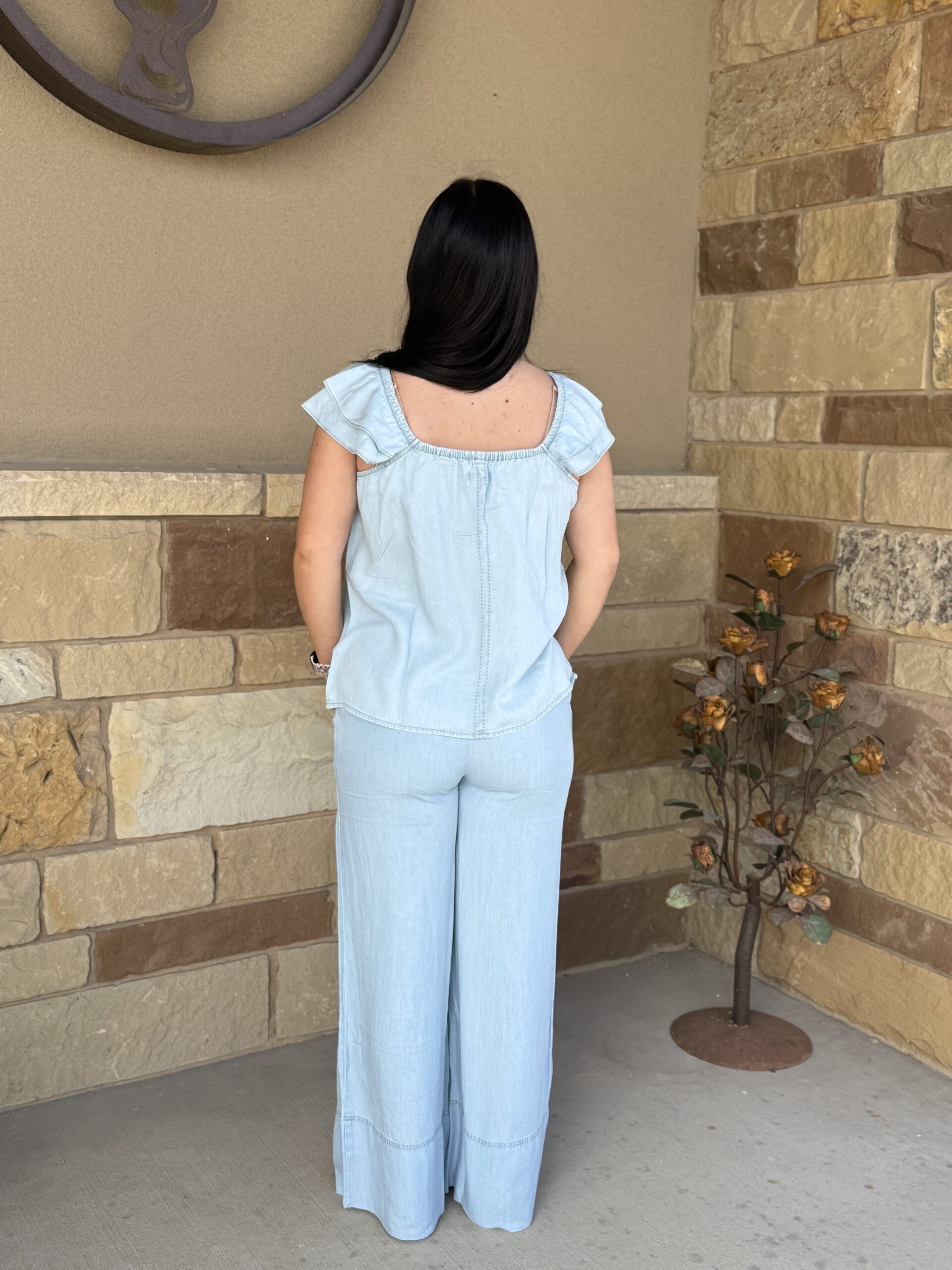 Aylin, a basic indigo tencel, is the perfect summer pants! Her and her bff, Lynn, are sure to create the ideal summer look. Lightweight tencel denim sports a dressy relaxed look. The front is designed similar to that of a normal pair of jeans but a bit fancier. The waistline can be forgiving with a traditional look and fit in the front and an elastic waistband across the back. A large center button, stamped with an aztec design, is flanked by two smaller buttons at the bottom of the front belt loops. They have the same design and sit at the top of darts that are centered at the top of each side. Hand pockets are located on each side leaving the back bare. The leg is a wide leg style all the way from the waist to the large bottom cuff. Lightweight and comfortable, they are suitable for a wide variety of occasions. A look that can be dressed up or down, is sure to create the look you are going for. Go find Lynn, she matches perfectly! They are a match made for one another!