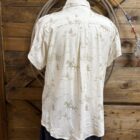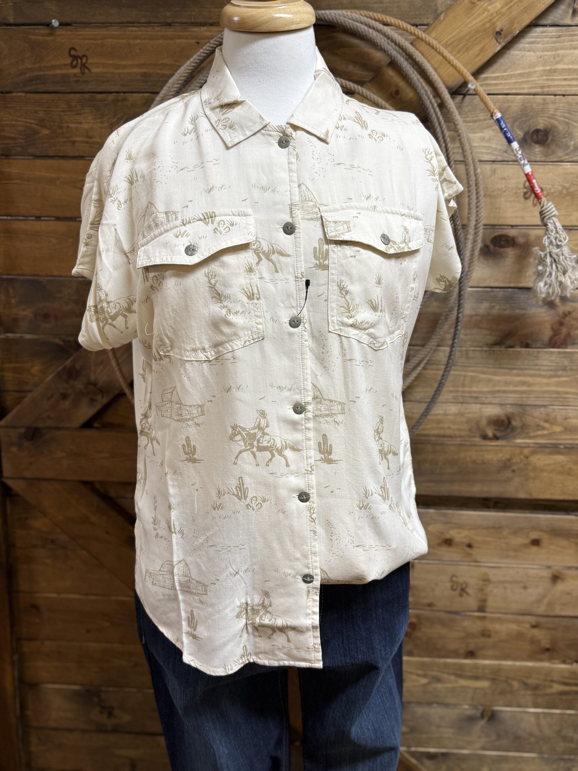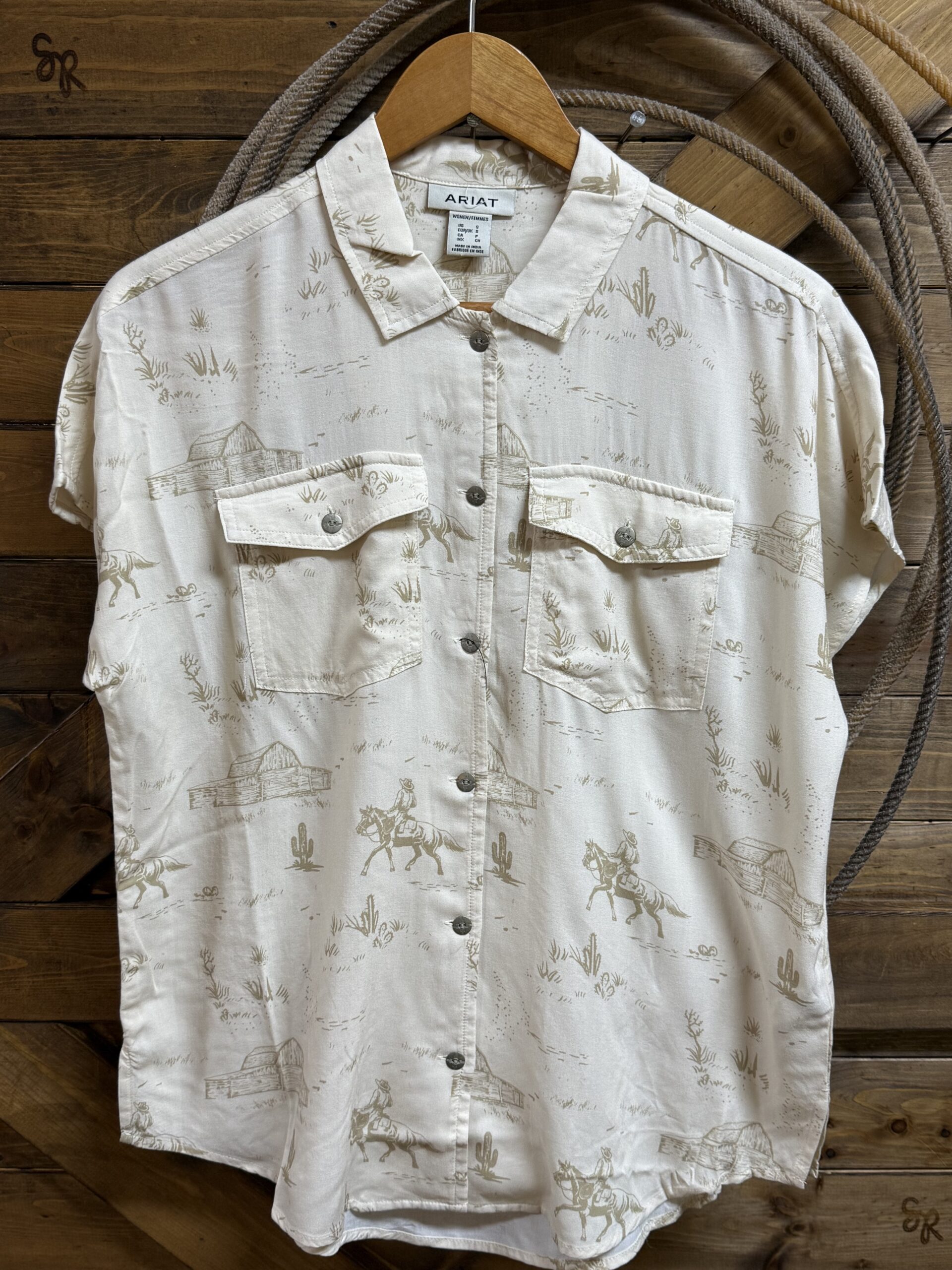 We are back this season with the popular ladies Badlands button down from Ariat. We prefer this light weight material that allows us to stay cool and styled at the same time.A neutral tone of cream displays various ranch scenes scattered throughout the top.  Silver buttons, stamped with a western print, are centered down the front and again on each of the front pockets. They are a small piece of the details we like so much in this top. A slightly oversized fit keeps you comfortable with a bit of extra room for whatever you may find yourself in for the day. Made to work in or made to wear to the classroom or office, this top is perfect for a busy lifestyle. Wear it to your liking! A fit we love and style that is made for all things!