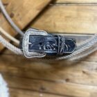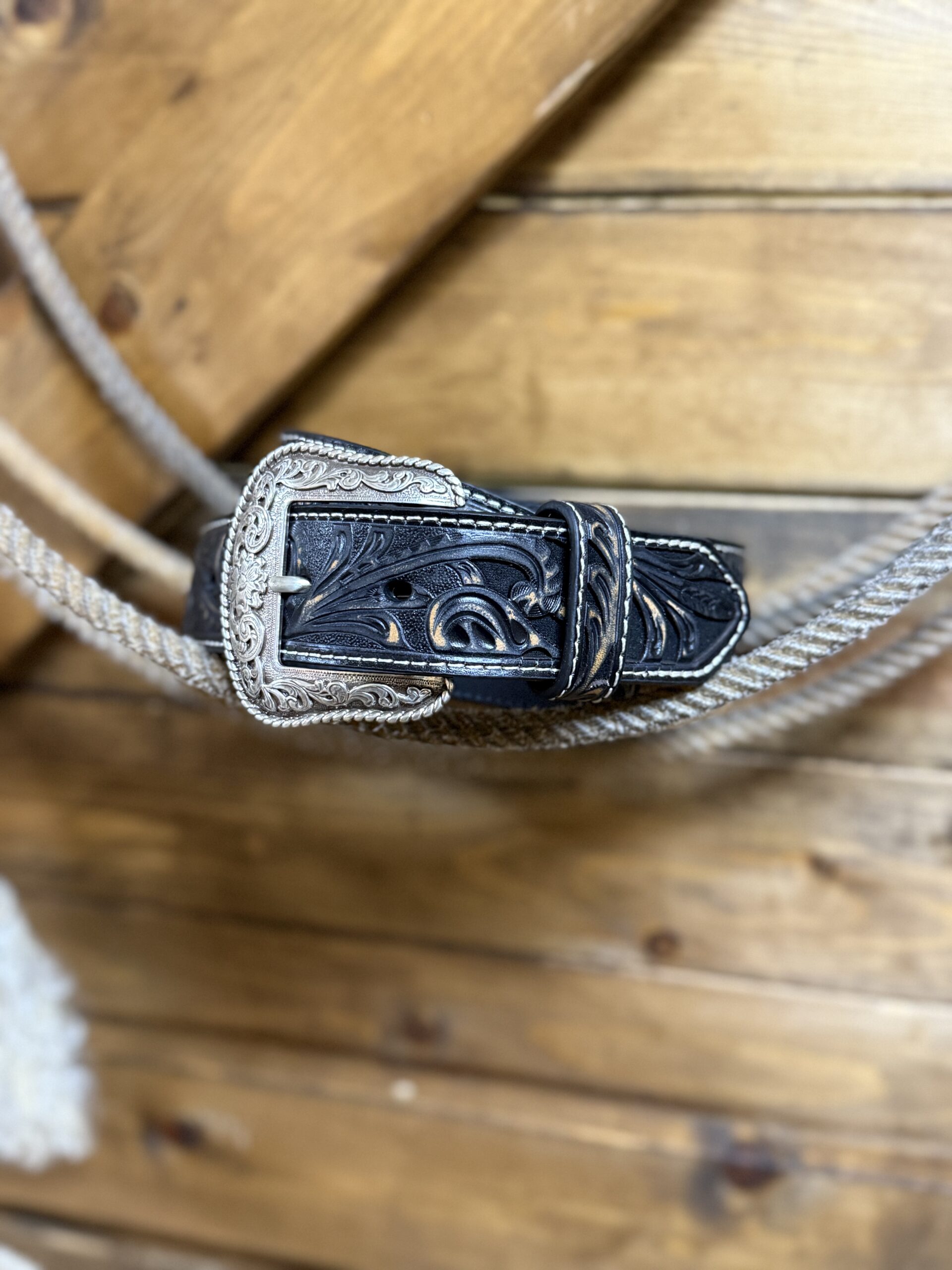 Beautiful black belt for ladies with floral embossing. A burnished brown tone is featured throughout the belt creating a vintage look. The buckle is easily removable on a 3 button snap back. Thinly stitched along the outer edges in a white thread. Great universal look that suits many styles and buckle shapes.