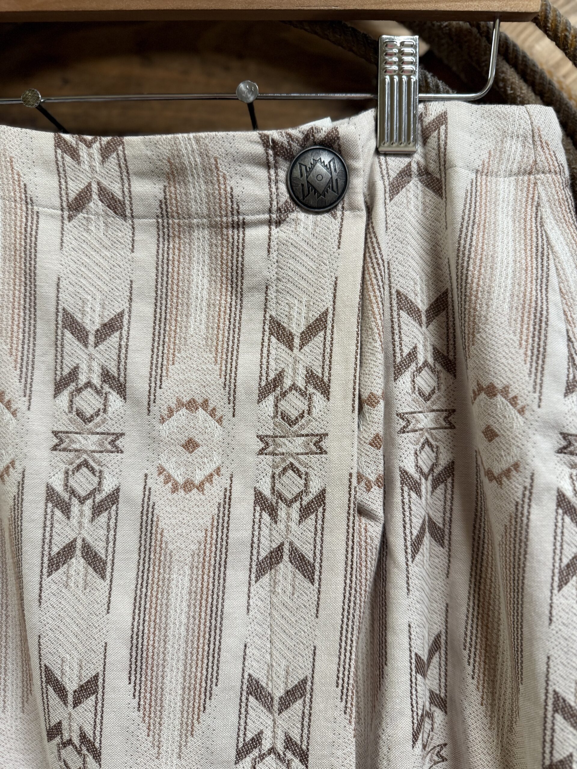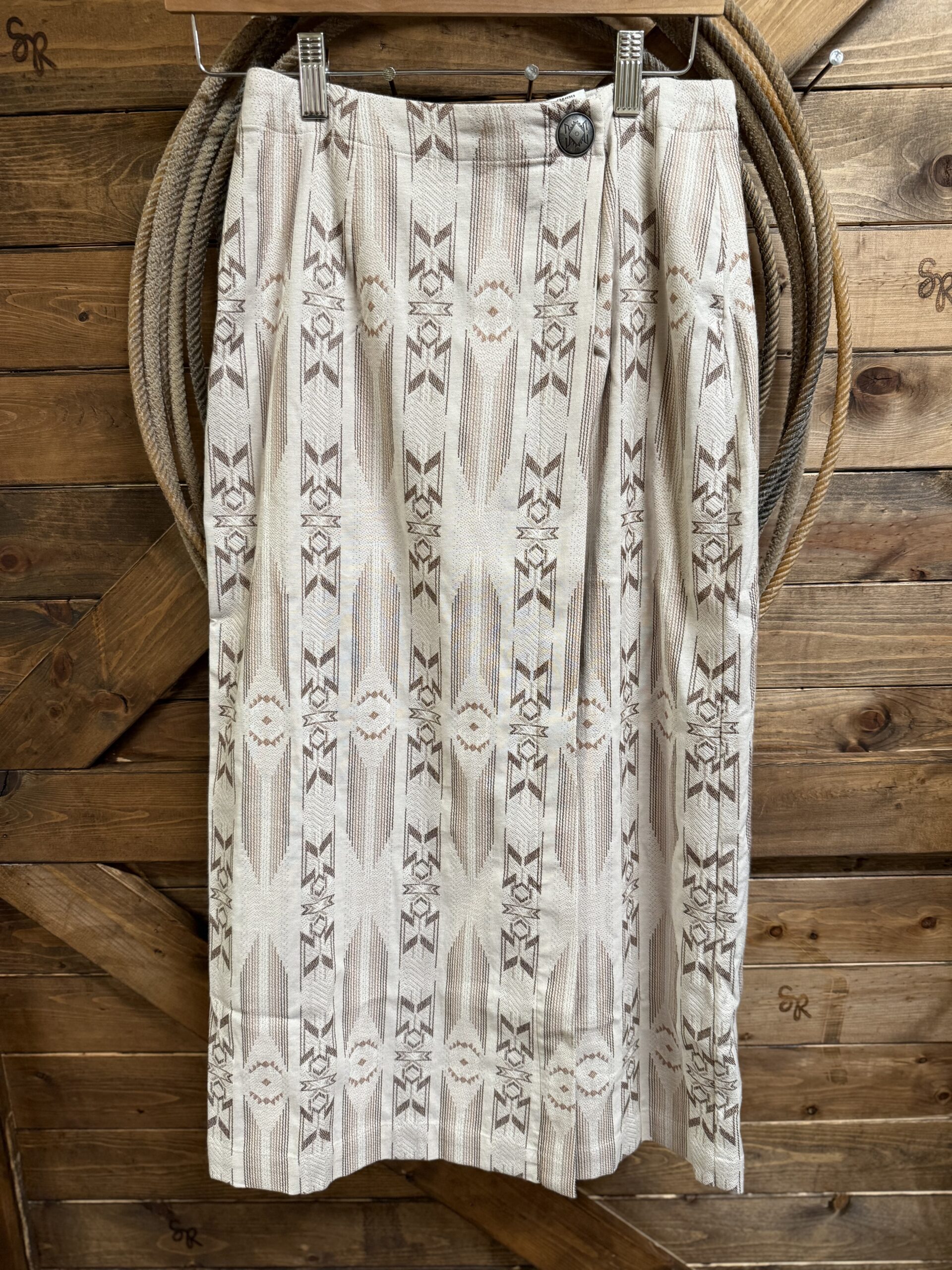 It can be challenging to find a good western skirt these days! Look no further! We have the PERFECT one! The length and the print are nothing short of the ideal western combination! A beautiful southwestern design is stitched in a vertical pattern from the waist clear to the bottom hem. The style is that of a wrap around skirt. There is a beautiful overlay of material across to the left leg allowing for a little additional leg room within the style. Neutral colors make this an easy piece to wear and style. Great combination of browns and off white are a perfect match for the fit and style. The waistline is adorned by a single western stamped concho button on the front and a zipper down the back. Slip into this piece paired with your favorite solid blouse and make it as fancy as you would like. It easily pairs with a basic tee or your favorite bodysuit for a more casual look. Worn many different ways but we promise it will never lack class!