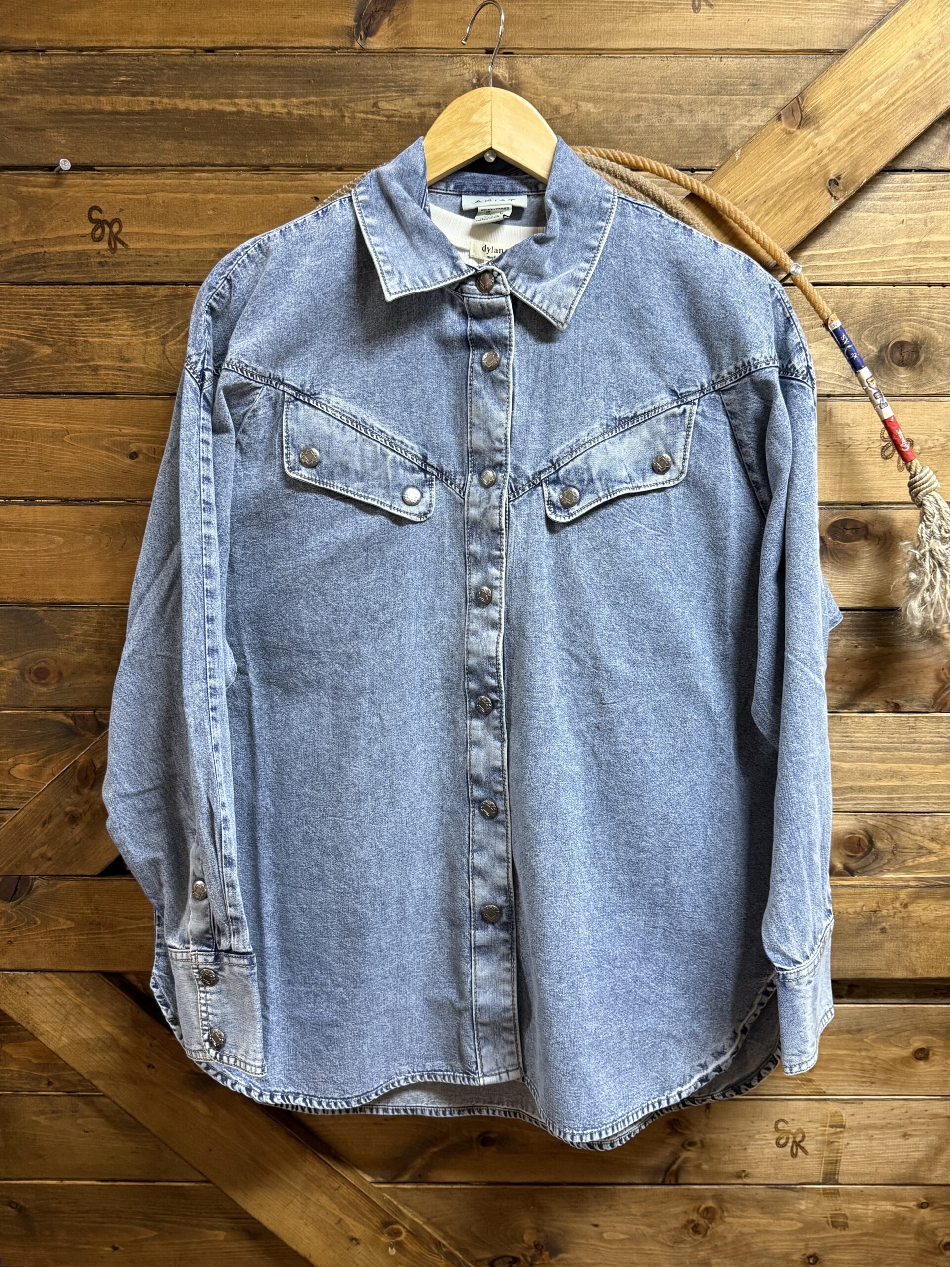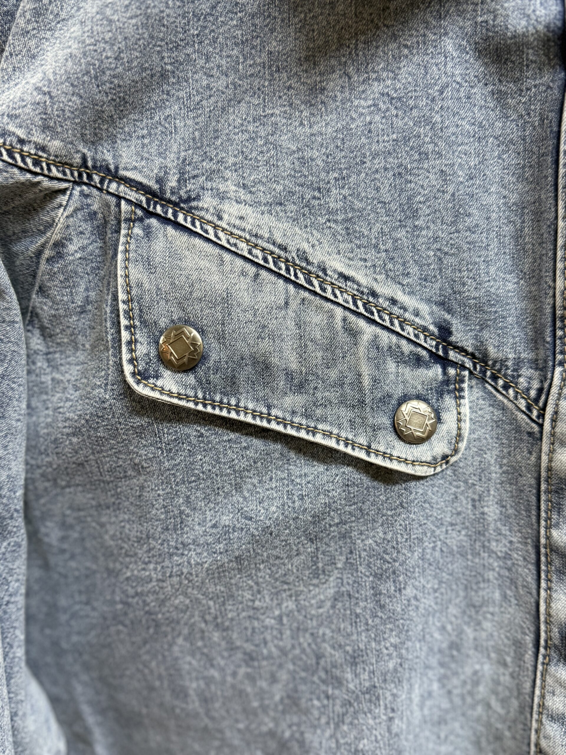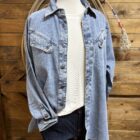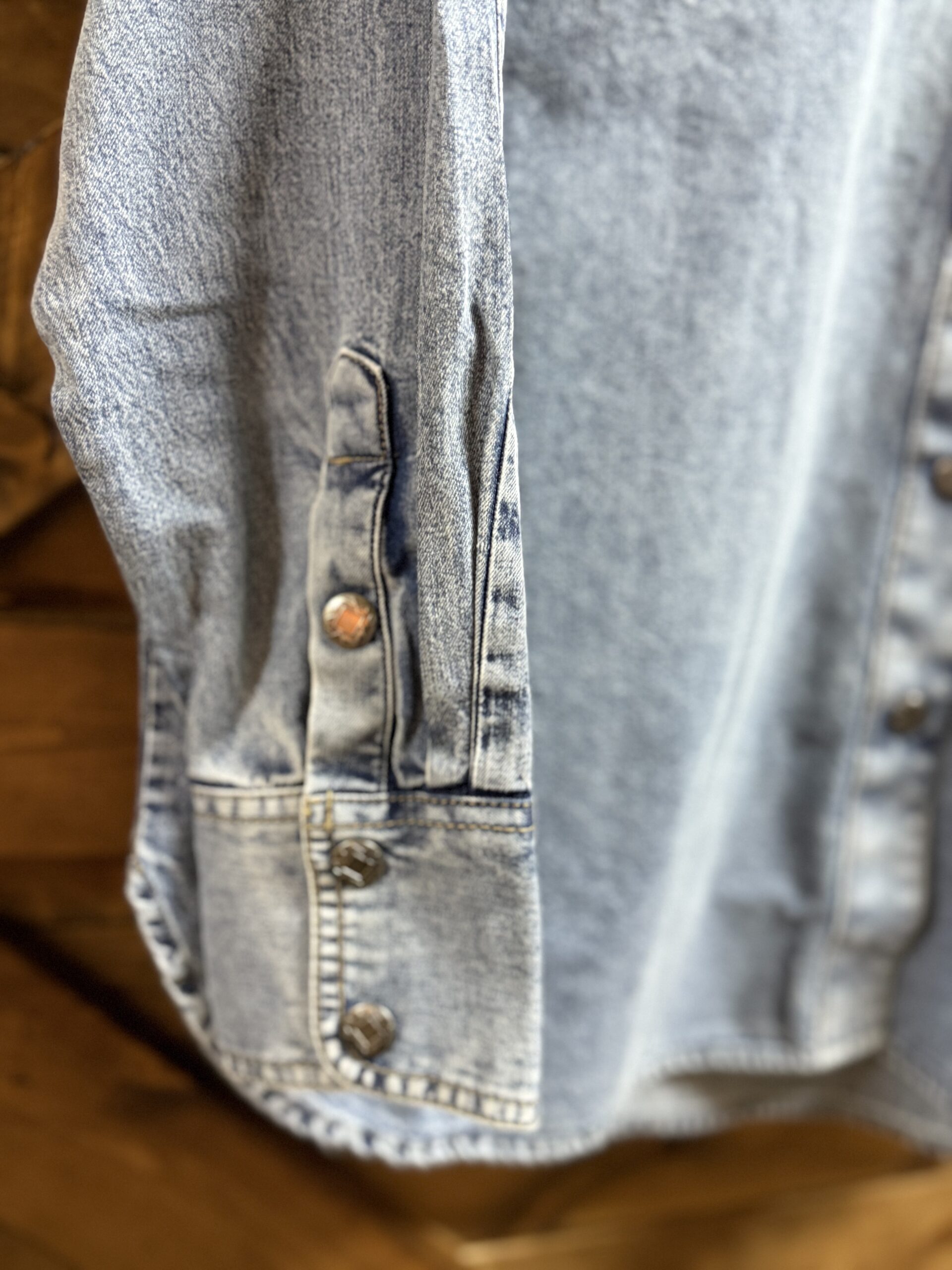 Denim! It’s our go to! We think you will like the Charleston as much as we do! Perfect for layering or wearing alone, there are no rules on how to wear a good denim top. The wash of this top is on point. Great light wash indigo that features some fading and darker areas specifically around the seams. The front carries the cutest round stamped snaps down the middle as well as the double chest pockets. Situated at an angle across each side of the chest, the pockets are easily a focal point. The sleeves end in a slightly deeper cuff with the same silver stamped buttons. The cut is made to be flattering on all body types with a longer cut and even longer tail. Find your favorite look and add the Charleston! Layered over the top, worn alone, or even worn tied around the waistline, this one is a must have!