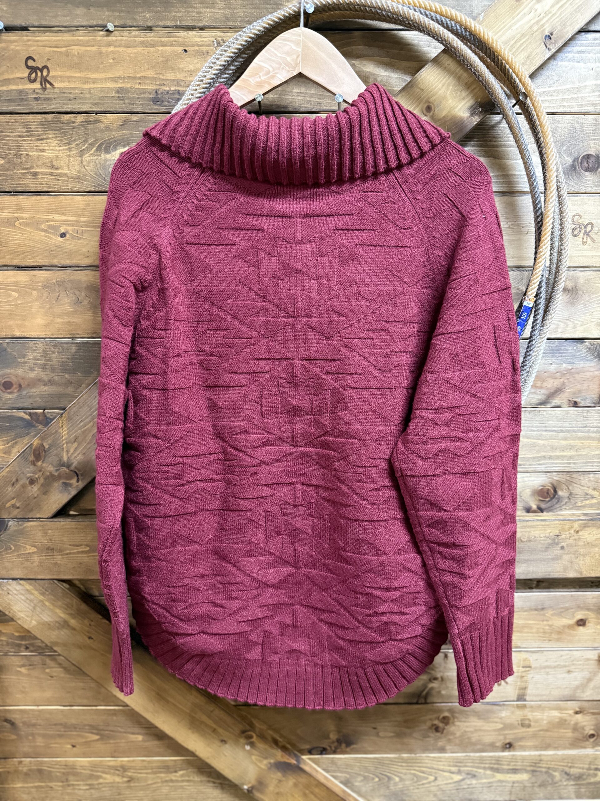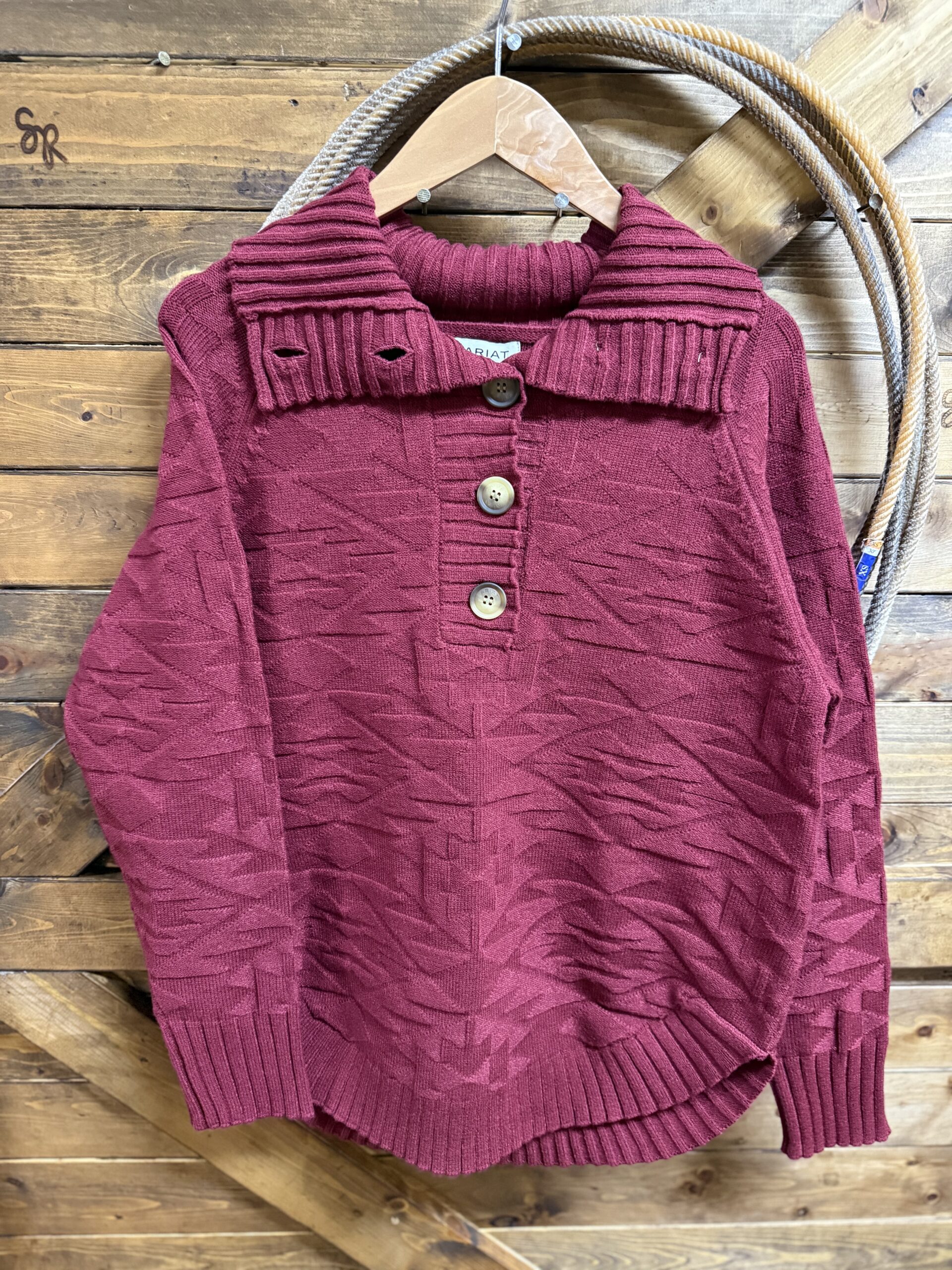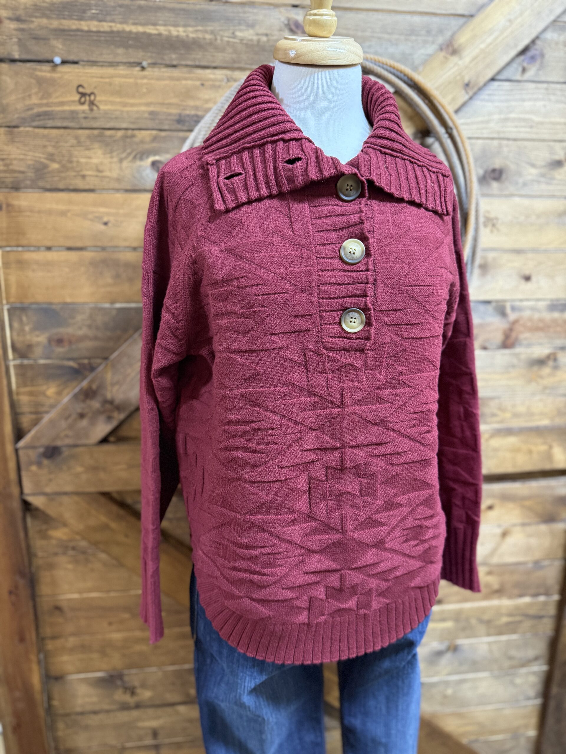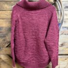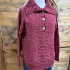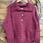 Sweaters are important! The style is more important. Find your style and shop away. We think this one may be your style! Pretty cabernet red textured knit sweater in a pullover style. Beautiful thick ribbed sleeve ends and bottom hem add to an already beautiful style. The collar folds over opening up out onto the shoulder. 5 beautiful big buttons start at the top of the collar and come down 1/4 of the way. Set the buttons and collar as you like. This will create your own style around the neck. Easily layered with a collared button down if layering is your thing. Heavy and warm, you are sure to not be cold regardless of how you choose wear it! Great for cooler days in the office!