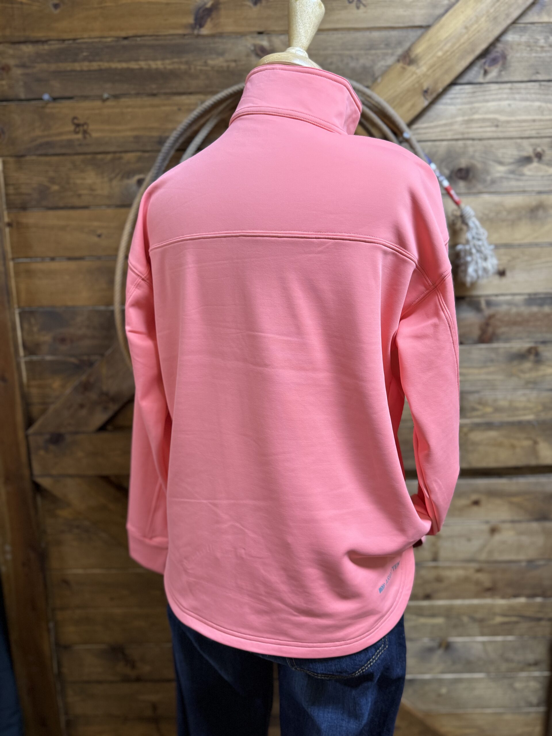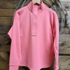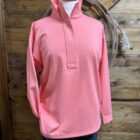 It’s an Ariat Tek pullover you need to get your hands on! Pretty shell pink color with a sleek look and design made for all types of styles. An outer shell that is designed with a sleek and smooth appearance yet made to defy any climate. The interior is lined with a lightweight fleece that will pull any moisture away from the skin. This keeps your fit and comfort levels consistent. The front features a 1/2 zip coming off of a stand up collar. A smooth cover lays neatly down to cover the color matched zipper. This one is handy! Perfect for a day on the golf course, and afternoon or evening in the barn, or a full day of errands across town! Wear it anywhere!