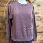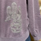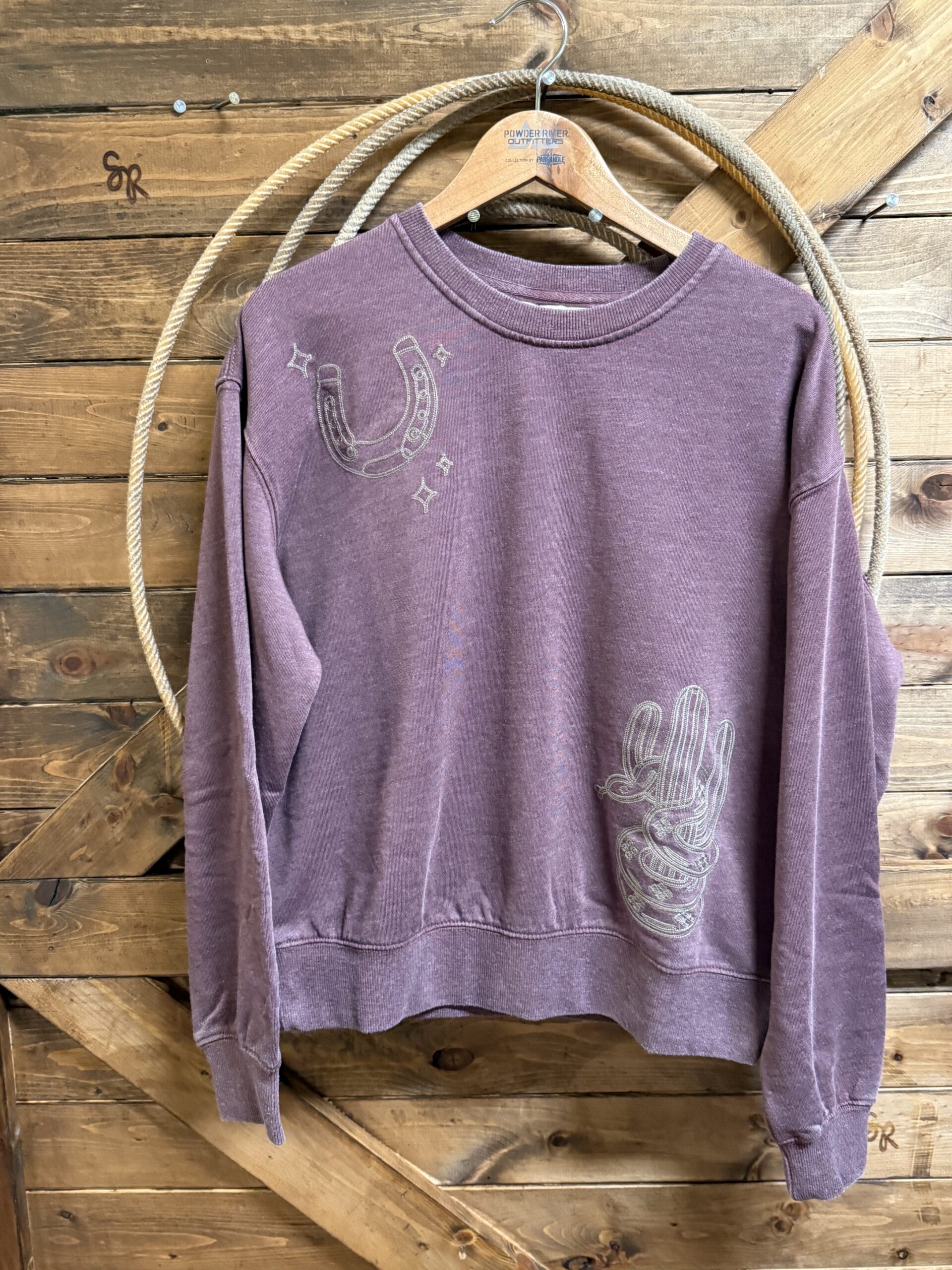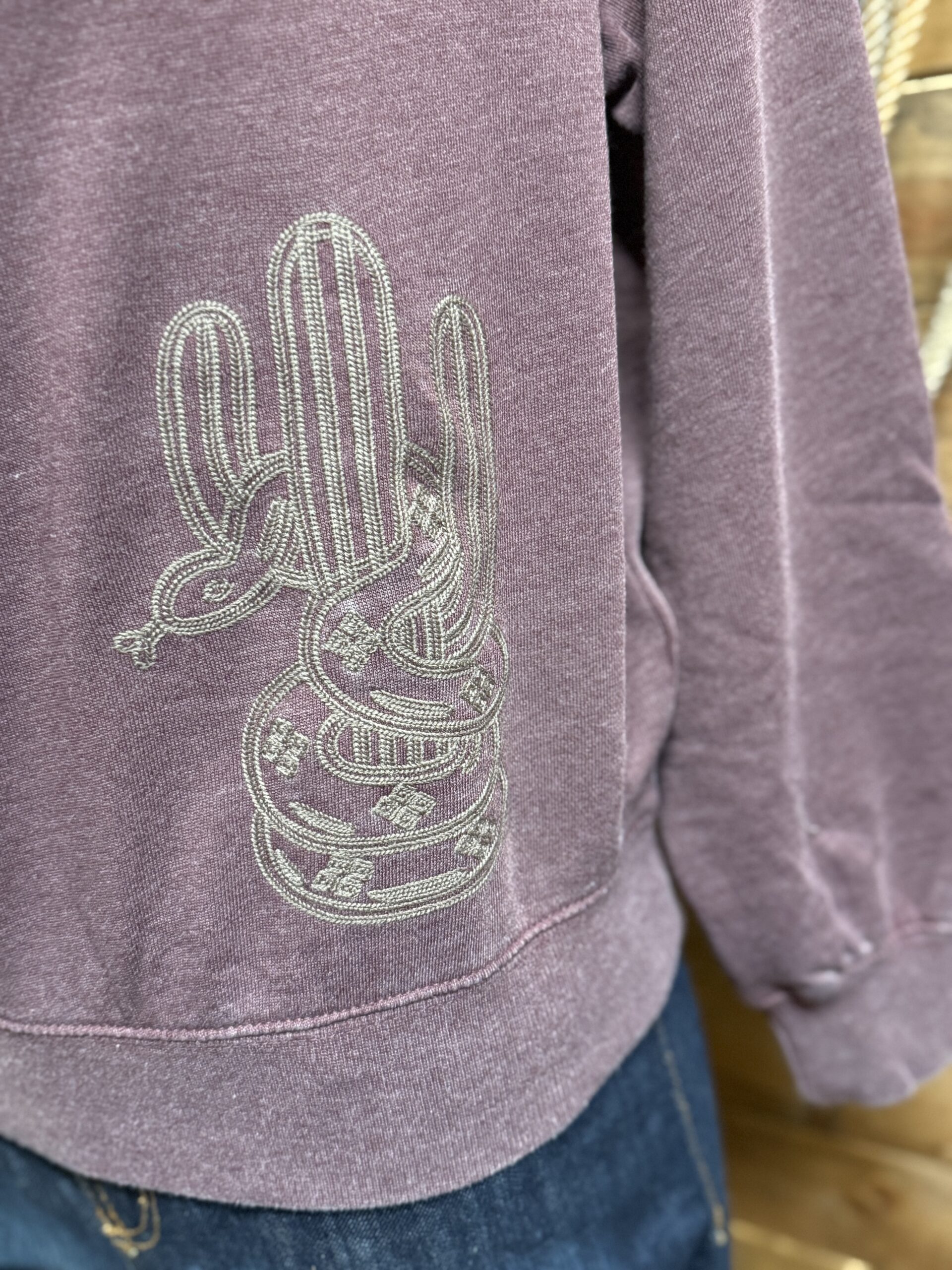 Sweatshirts are an easy style to gravitate towards! The comfort and simplicity make it hard to resist. Pretty Royale purple color sweatshirt features western embroidery in opposite corners. The top right corner is a lucky horseshoe and a surrounding stars and the bottom left is that of a snake entangled within a cactus. Pretty neutral tan color makes up the embroidery on each design. A cute crew neck makes it easy to layer with your go to collared shirt. Create your own look and style in this cute sweatshirt!
