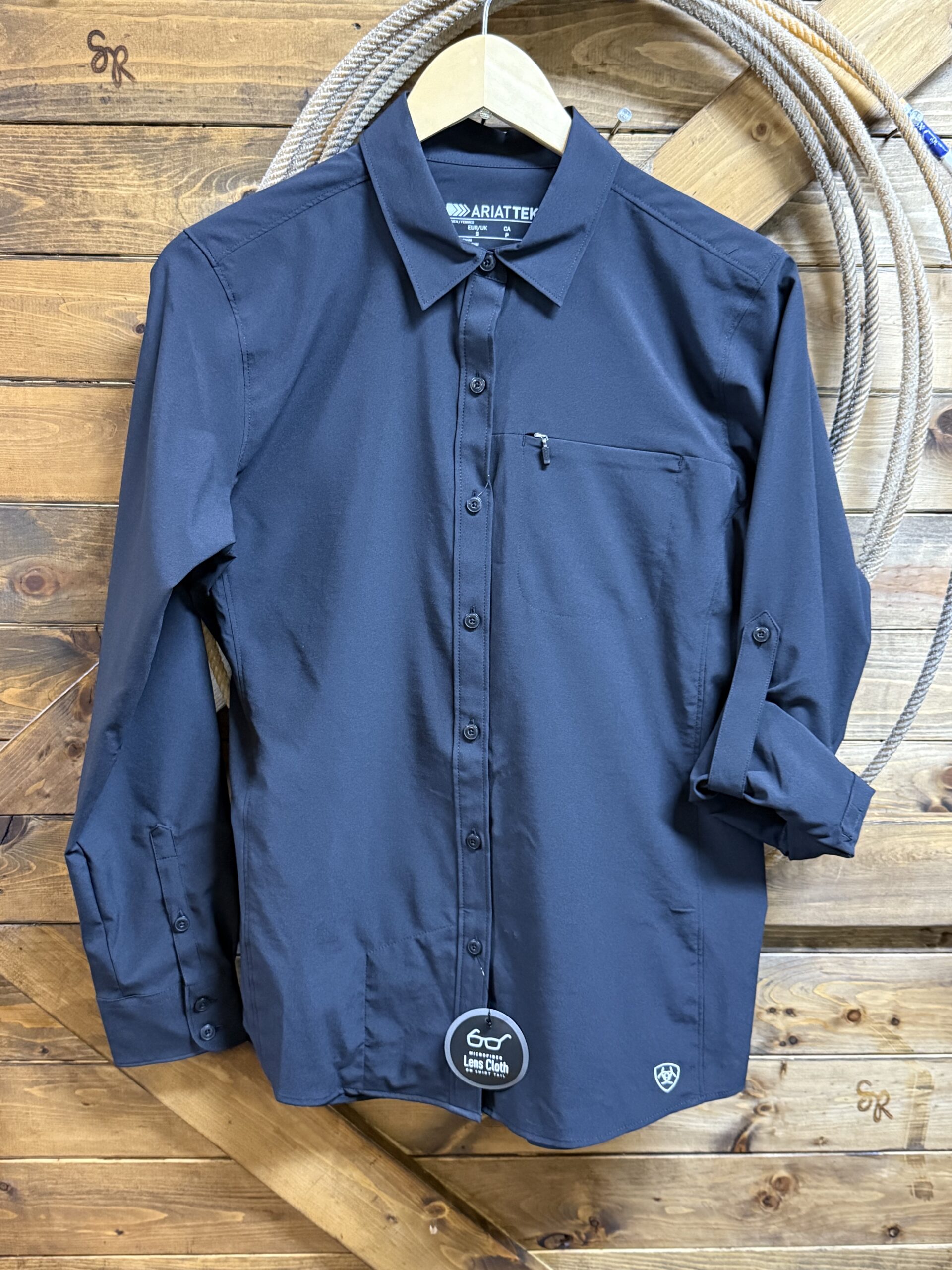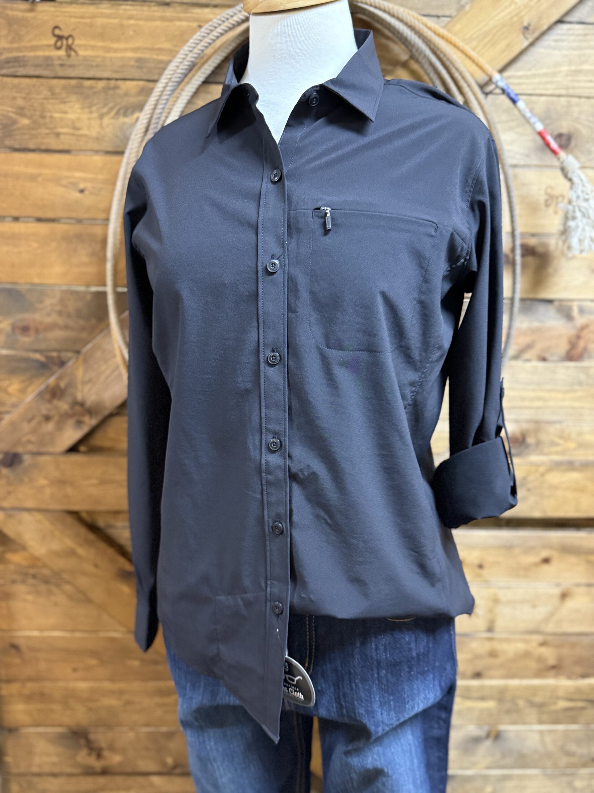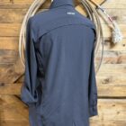 The summer shirt you have been waiting for! It’s so lightweight and packed with performance extras. Cool black performance material that is designed to protect you from the suns rays and move moisture away from your skin to give you the most comfortable fit! The front is lined with color matched buttons down the middle and again at the sleeve ends. A super cute zip pocket is situated on the left side of the chest to hold all of your necessities. A mesh panel runs across the back of the shirt from shoulder to shoulder creating additional air flow. The sleeves feature a single button and strap to secure your sleeves in place should you choose to roll them up. A sleek sharp look with all the summertime comforts!