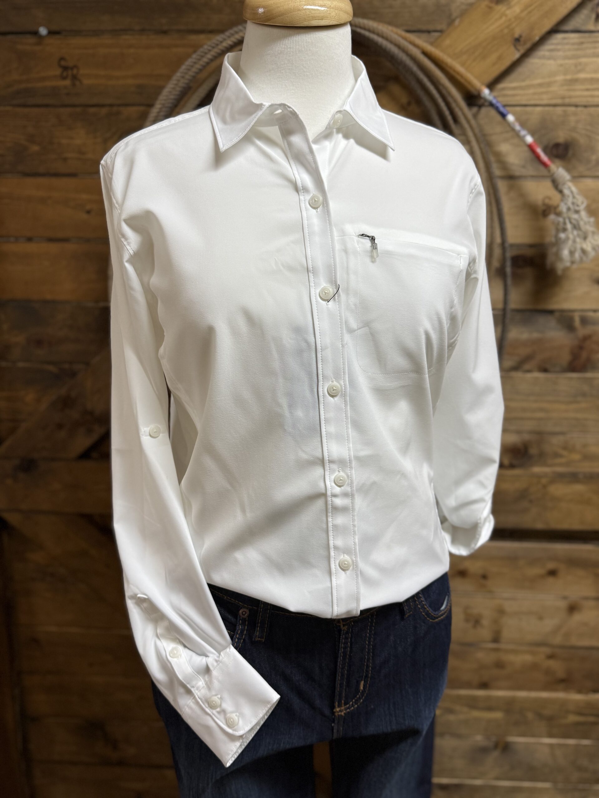 The ultimate summer-time shirt! It’s made from the lightest performance material! Sure to wick moisture away from your skin, it makes for a cool and dry fit and wear all day! UV protection is an added bonus for those days out in the sun! It shields the suns rays for work outside. The front features classic white buttons lining the front and closing the sleeve ends. Roll the sleeves up if you choose! There’s a button and strap to secure them right where you want them. The left side of the chest displays a cute little zipper pocket for all the small things you need to keep handy! Across the back of the shoulders are mesh panels to allow air flow! Stay cool and cute this summer in white!