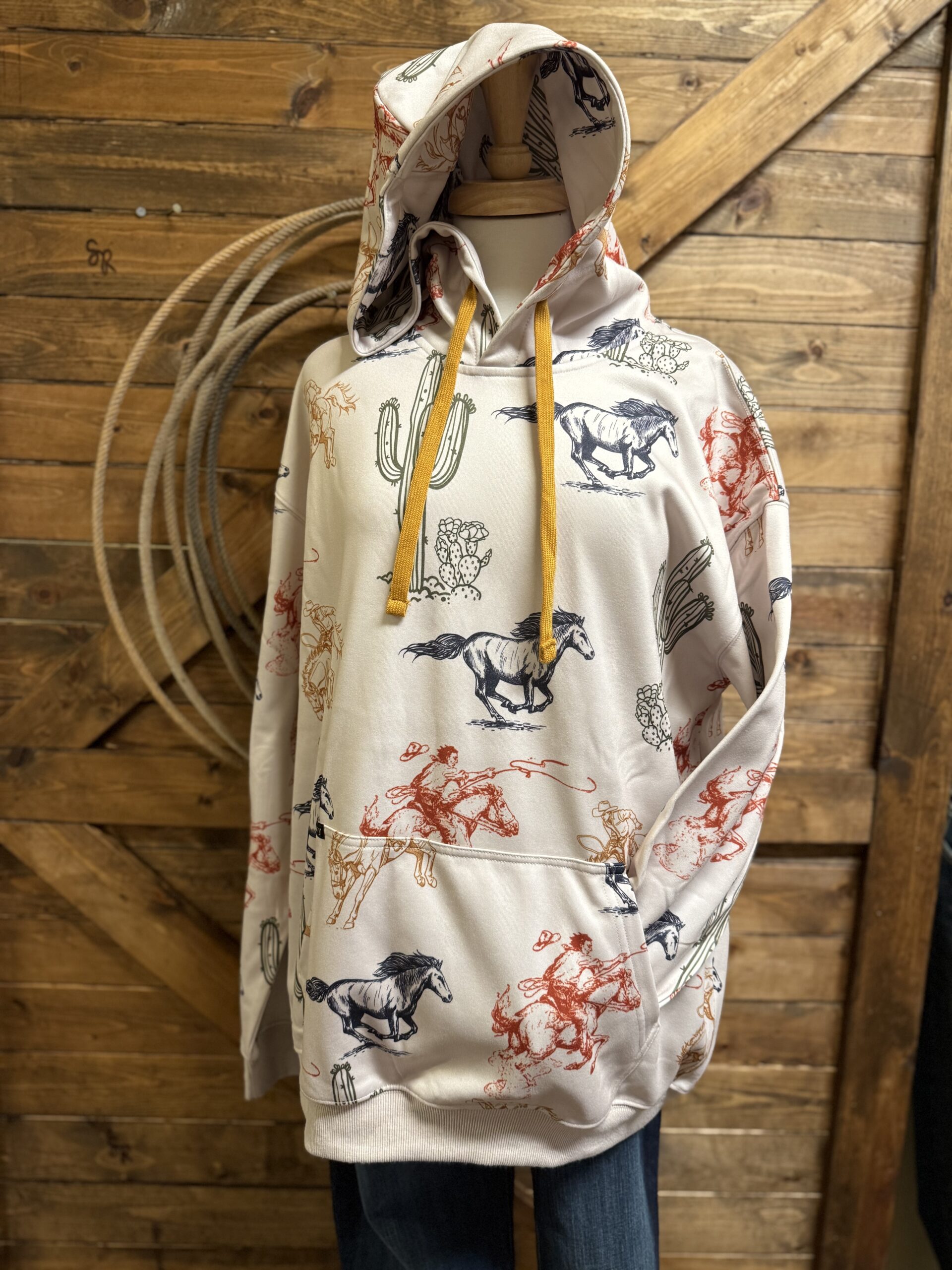 A brand favorite in the ladies pearl snaps, is bringing us a hoodie! Breakaway has brought us a super cool performance hoodie designed with multi colored western symbols in a variety of colors. The performance cutter is lined with a thing fleece lining. Hooded with double tie strings at the neck. The front features a full pocket with access from both sides. Super fun and functional!