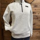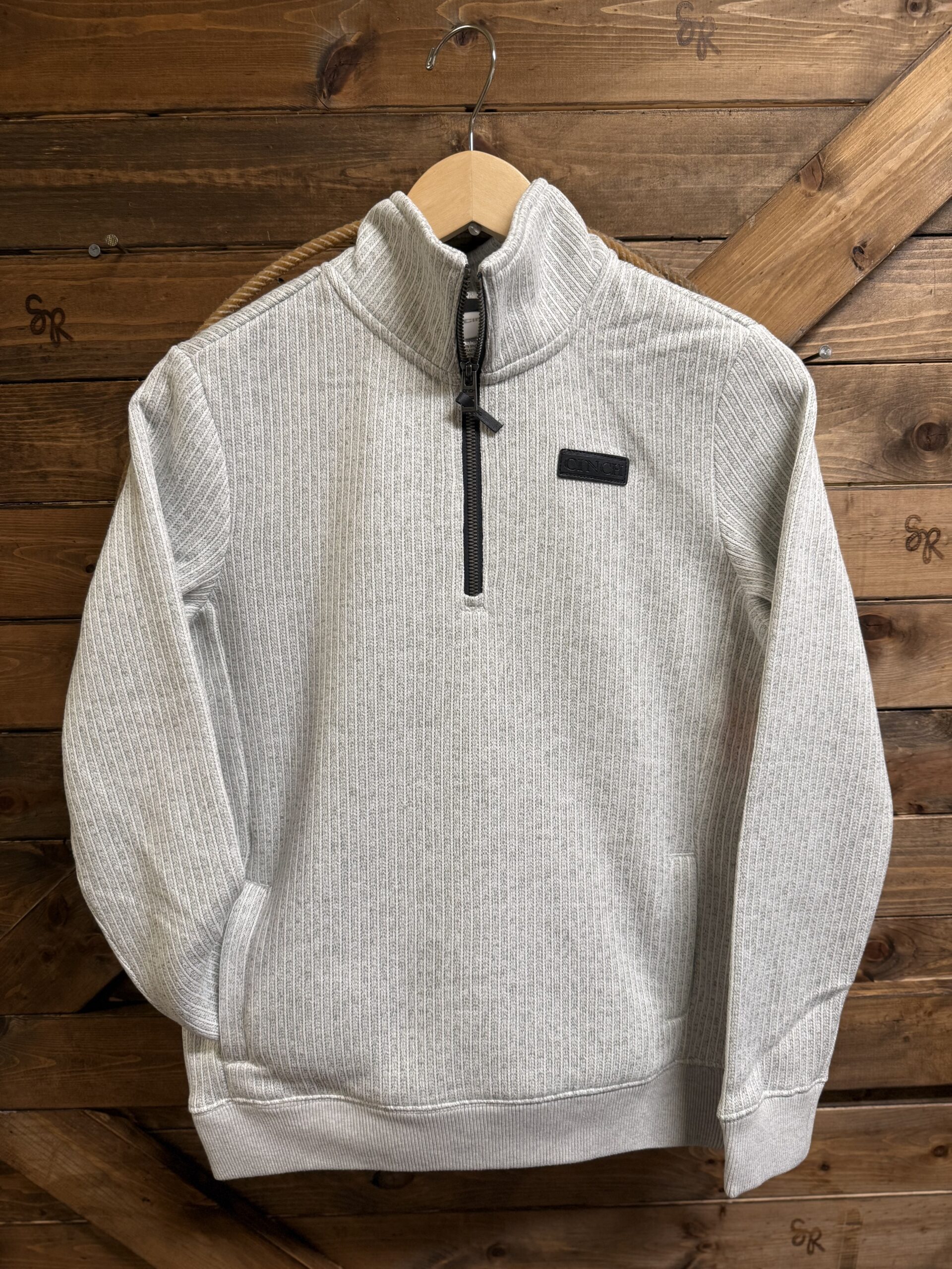 Just like the mens but designed for women! Heather grey pullover with a ribbed texture. A black zipper comes 1/4 of the way down the front off of a stand up collar. Individual slit pockets are on each side at the bottom. The left side of the chest displays the Cinch brand logo on a black leather patch. The combination of the ribbed exterior and the lightly fleece lined interior create a sleek look without sacrificing the warmth and comfort of a pullover. The bottom hem and the sleeve ends are both ribbed elastic. A must have! Great for cooler days out on the town running errands!