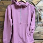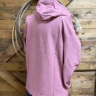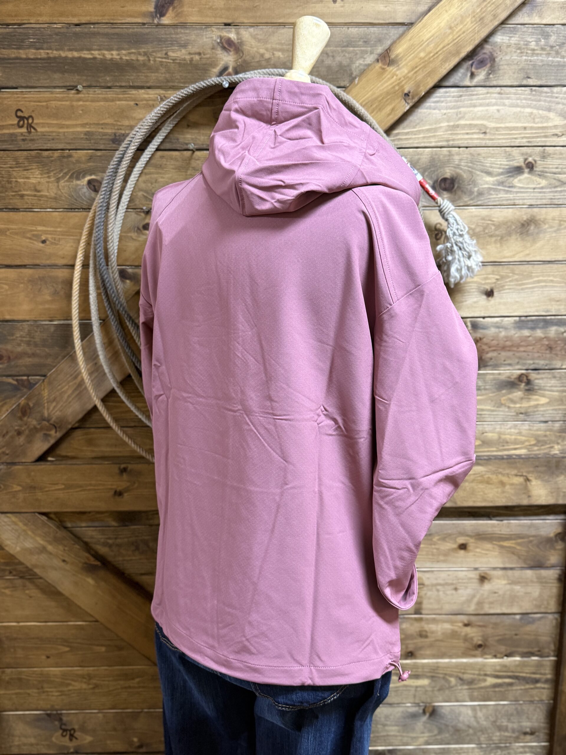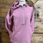 The pink windbreaker! A pretty rose pink windbreaker suitable for all types of weather conditions! A lighter pink zipper runs 1/4 off of the stand up collar featuring a hood on a draw cord. A large single pocket across the bottom of the front is accessible front either side on a slit opening. The bottom hem is designed with a draw cord that allows you to adjust the fit around the wait to your comfort level. The sleeves are designed with an elastic hem for an easy and convenient fit at the wrist. If you like pink and like windbreakers, this one is calling your name!