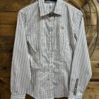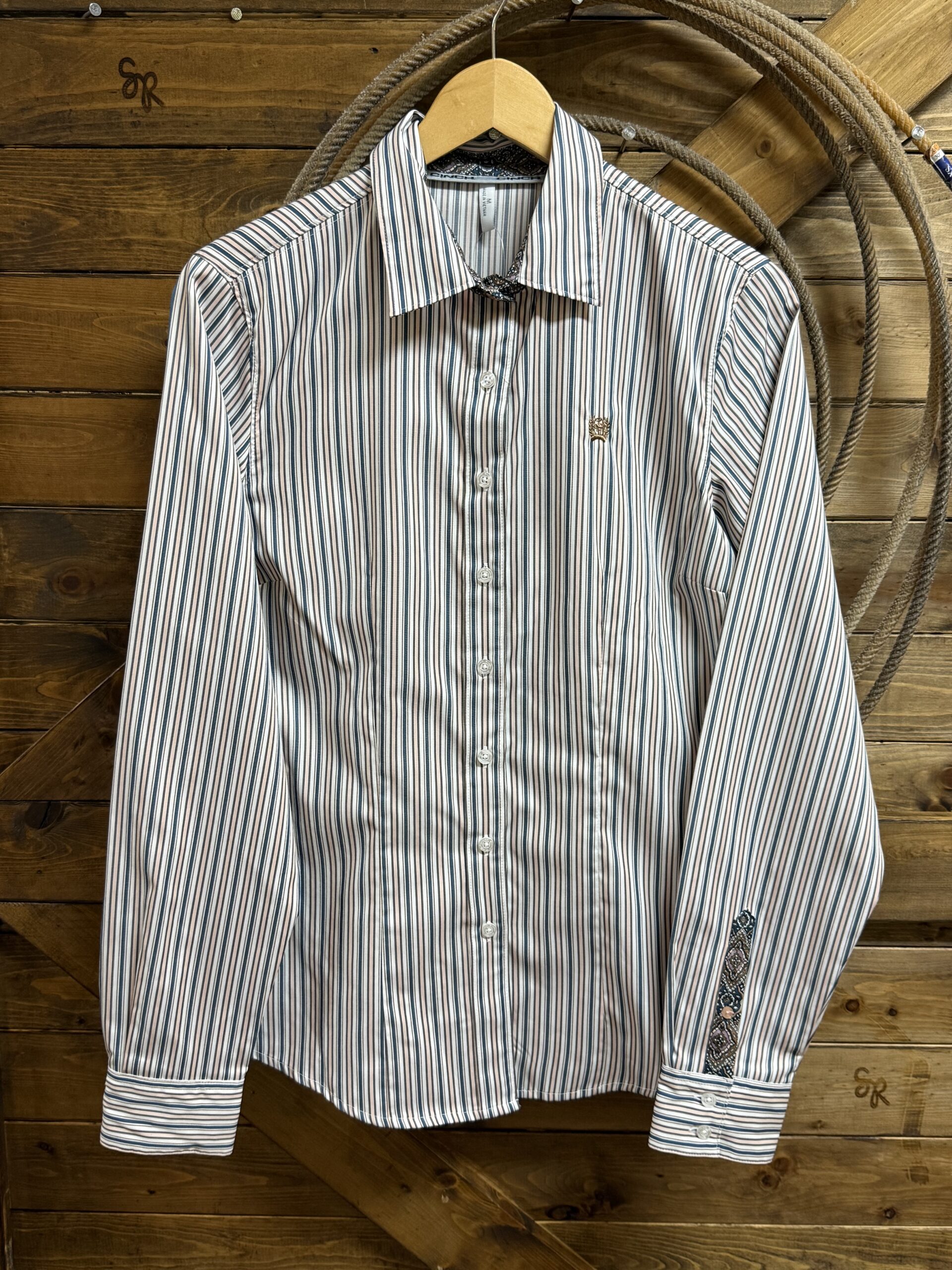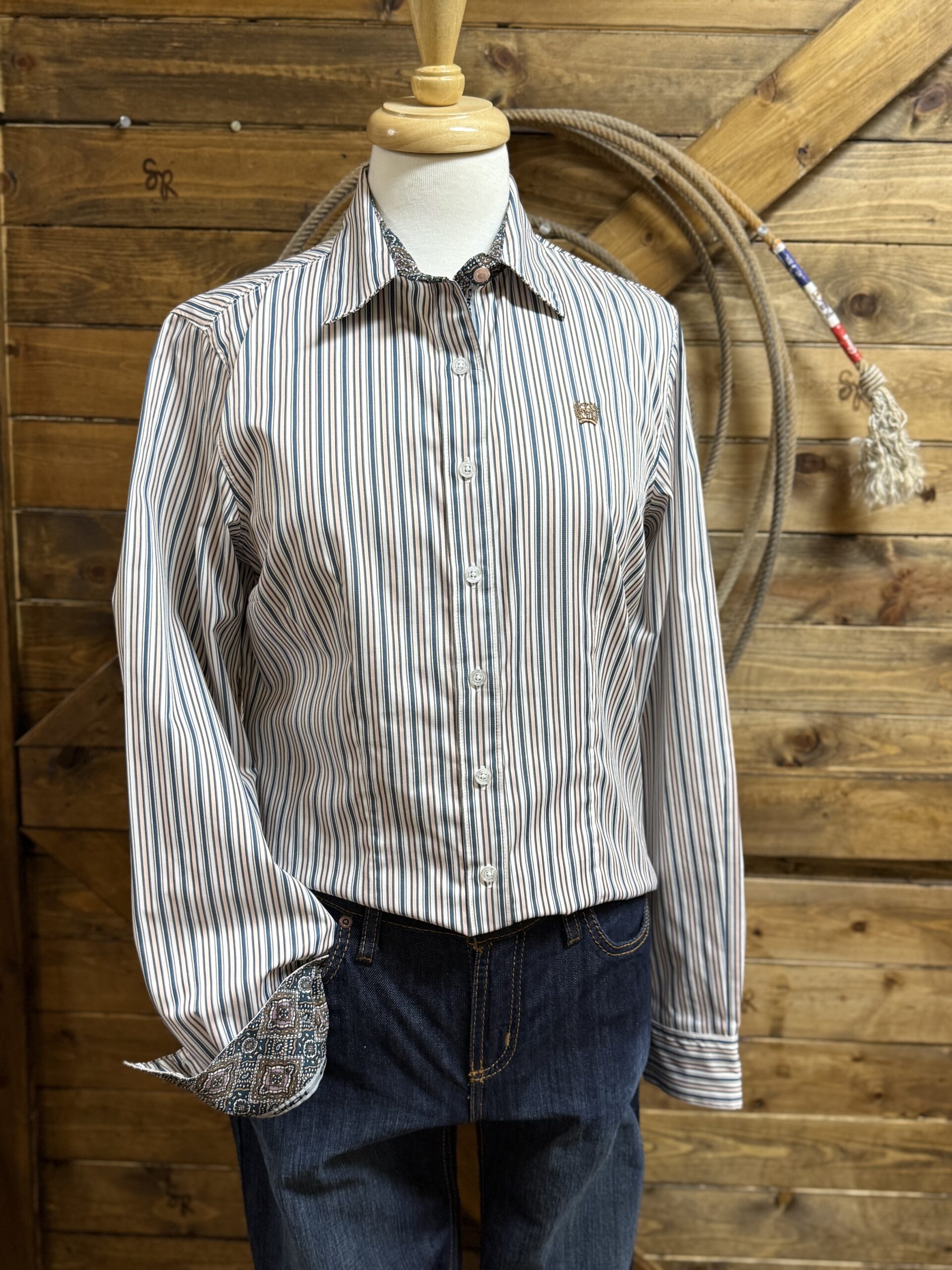 A classic for ladies, the Cinch Stretch Tencel button down. Designed with comfort, flexibility, and style both in mind, the tencel is a performance fabric featuring that will be you cooler than the traditional cotton shirts. The tencel makes it easier to care for in a wrinkle resistant material without sacrificing any durability in the shirt itself. Classic white buttons line the front and set at the sleeve end. Featured on the left side of the chest is the Cinch logo embroidered in a pretty golden color. The underside of the cuffs and the inside of the collar are a very pretty deep turquoise and light purple and brown western floral paisley.