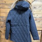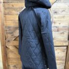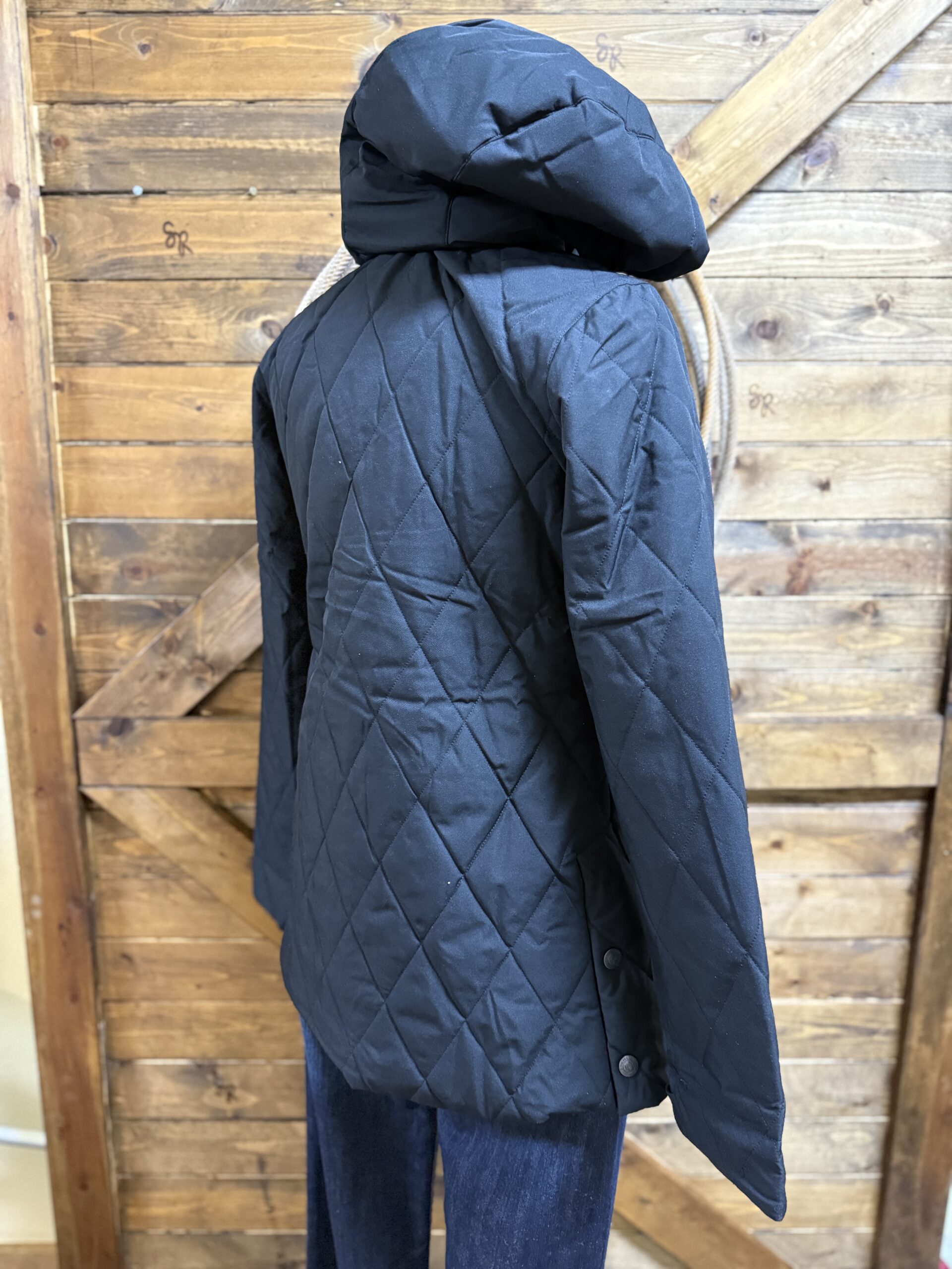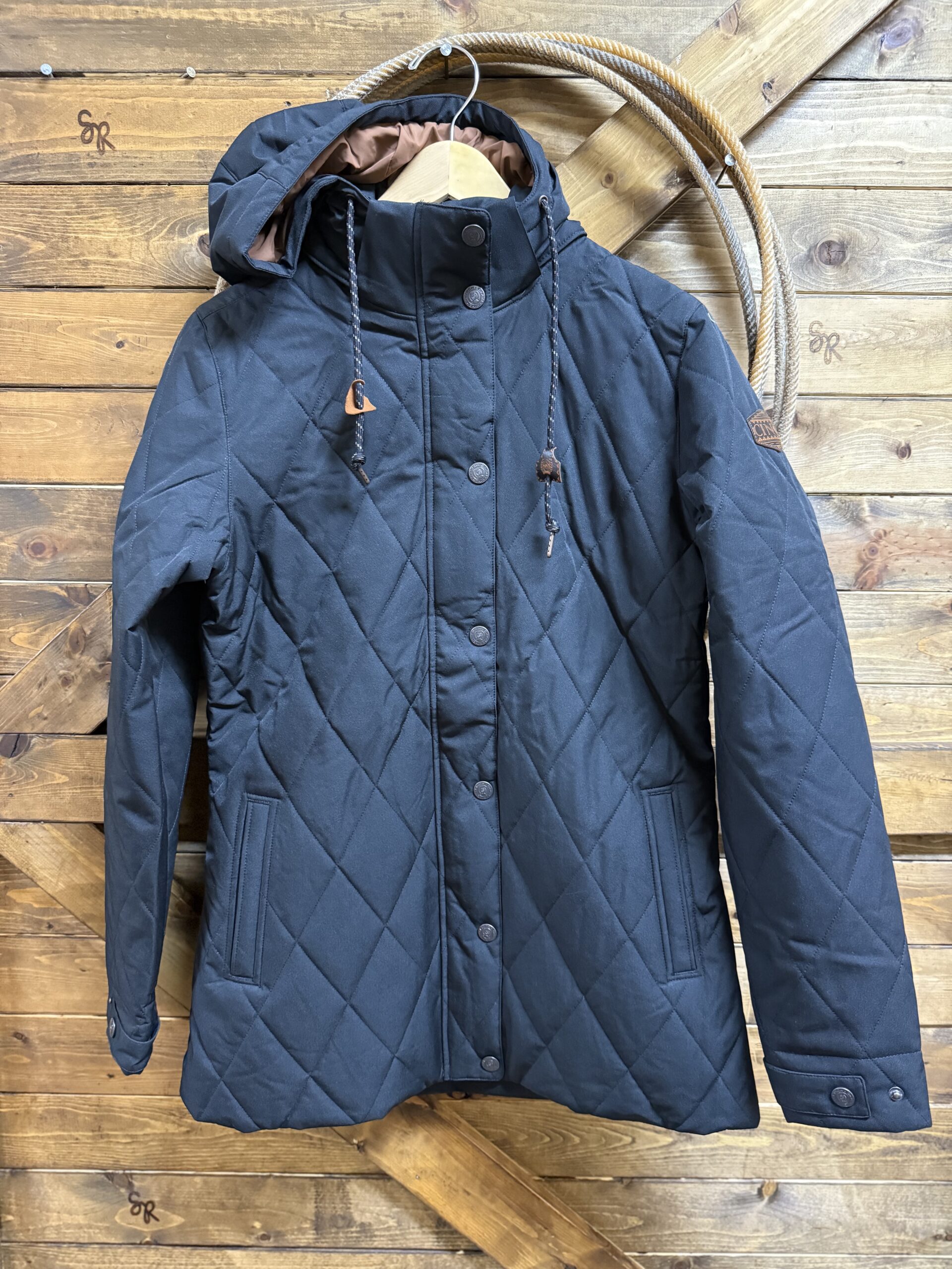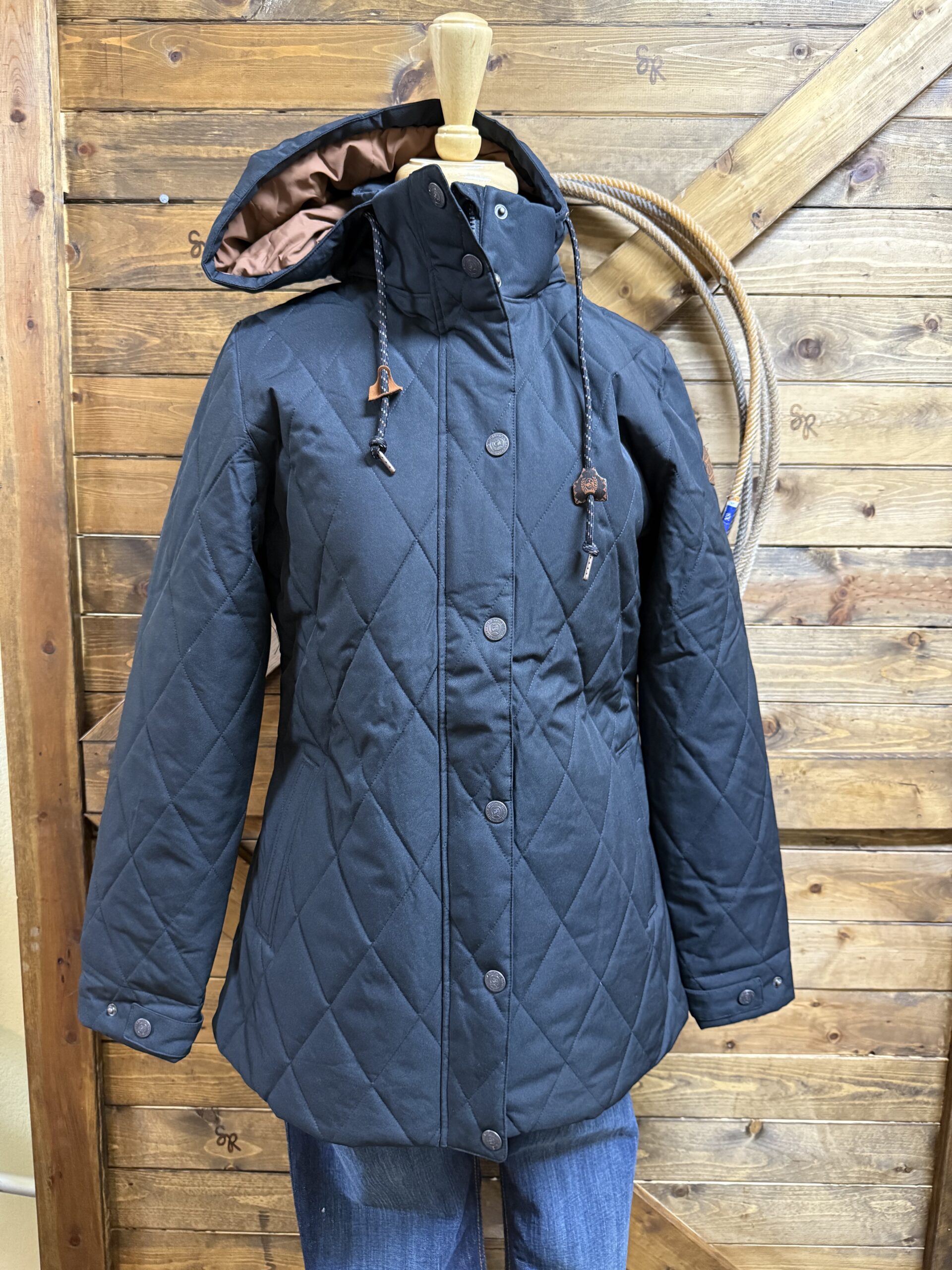 Ooooh look, another coat! For the barn you say?-Of course! Cinch is on top of the game with the design and make of this barn jacket. The length is perfect, just above the knee with a 2 button panel on the bottom of each side. It allows you to move as free as you need or snap them up and wear it a little tighter. The pretty black quilted outer shell is a durable water resistant fabric that will lock in the warmth. The exterior features a slit pocket on each side for your hands and a full length zipper covered by a button flap closure as well. The sleeves are adjustable on a 2 button set to secure around your wrist comfortable. The Cinch logo is situated on the outside of the left arm just below the shoulder. A hood comes up easily and can be tied with the strings should you choose. Fully lined inside with a beautiful deep copper layer. Stay warm, stay cute, stay in the barn:) We like it there!
