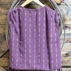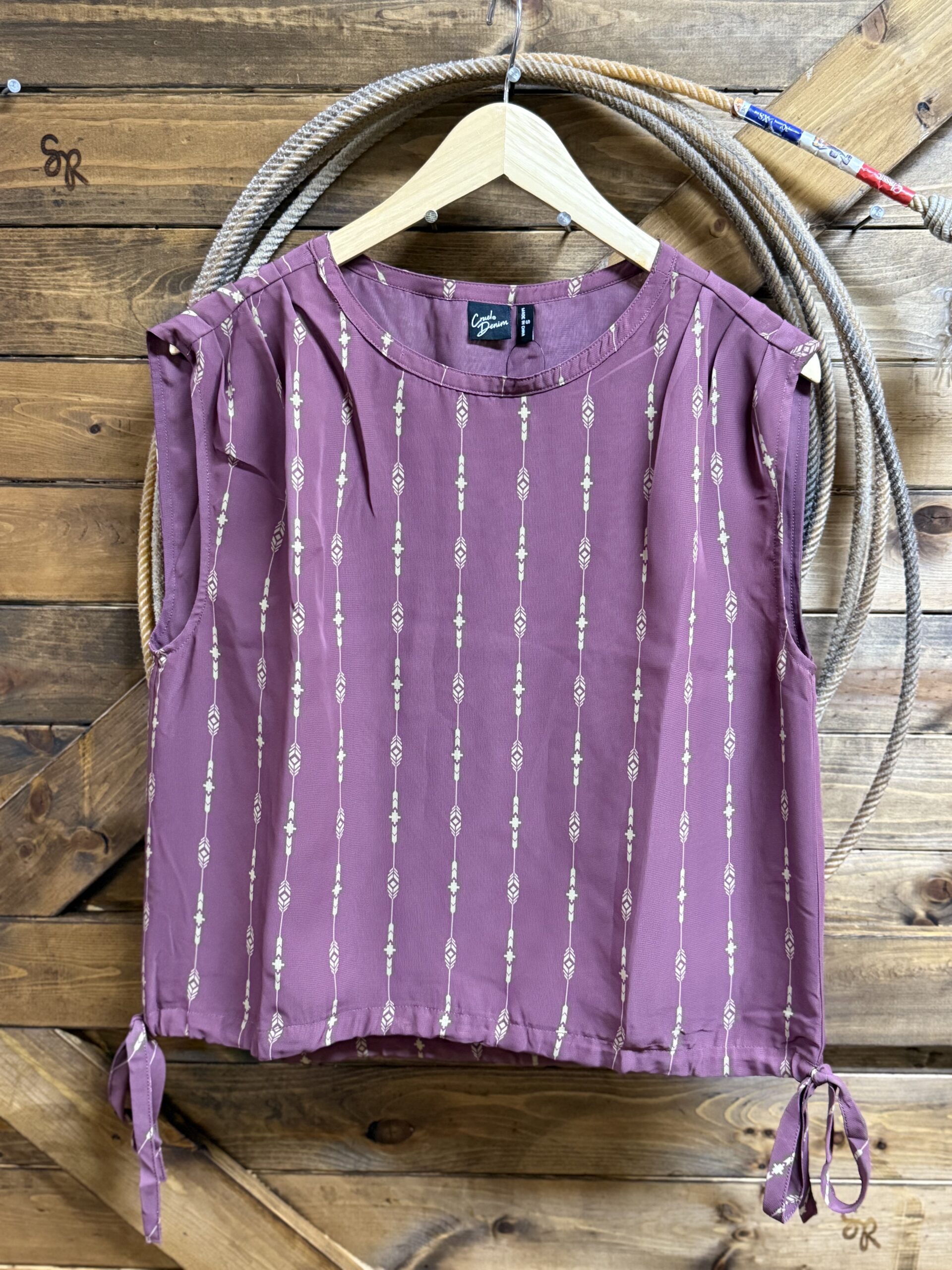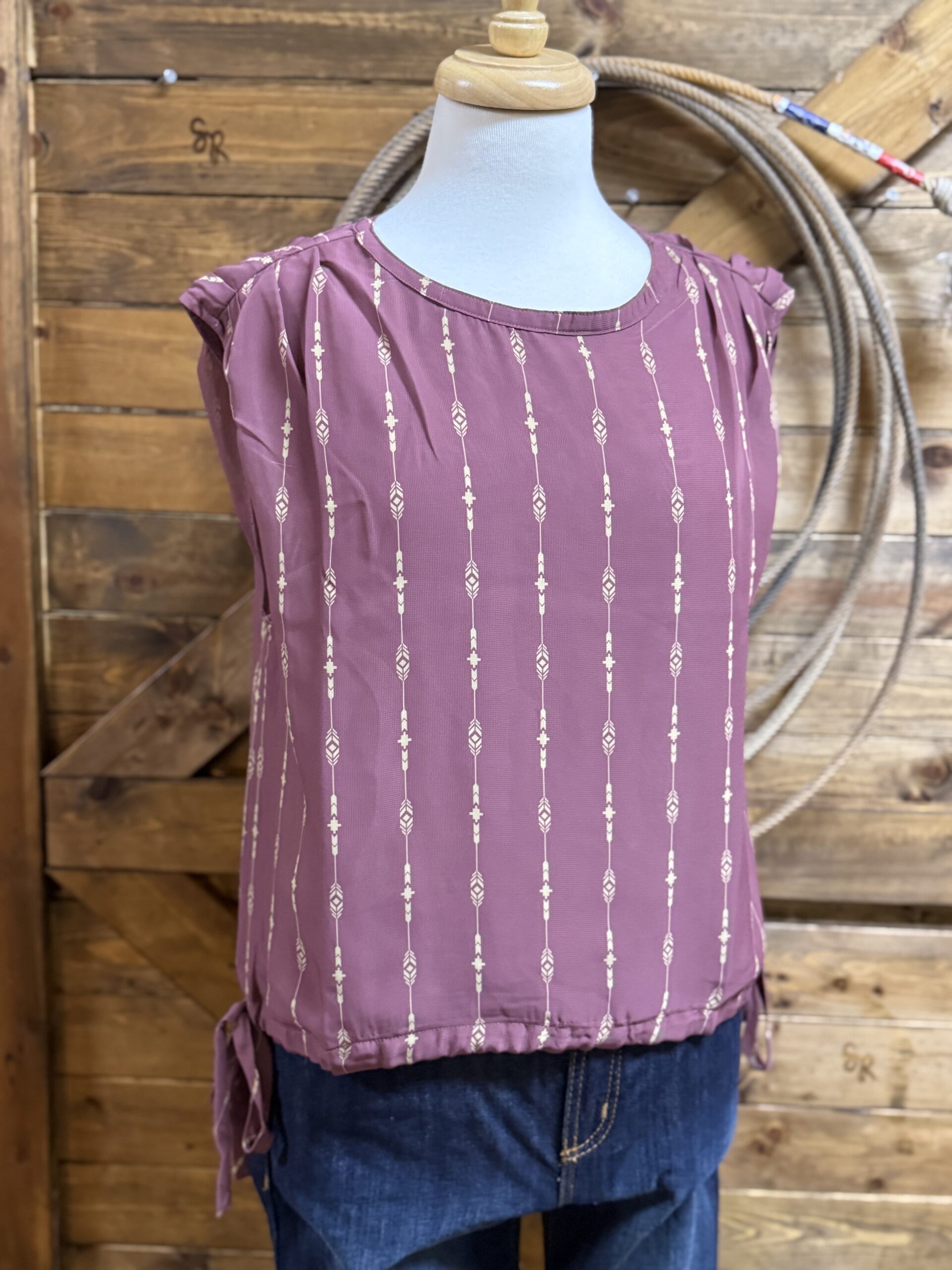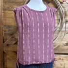 A dress blouse that is simply beautiful! A very pretty maroon chiffon-like material is printed with a simple golden aztec line pattern. The shoulders are cut with a wider strap that is ruched all the way across to form a layered form. The bottom hem has a tie that will pull on either side and tighten across the bottom should you choose. Perfect for warmer days in the office!