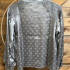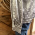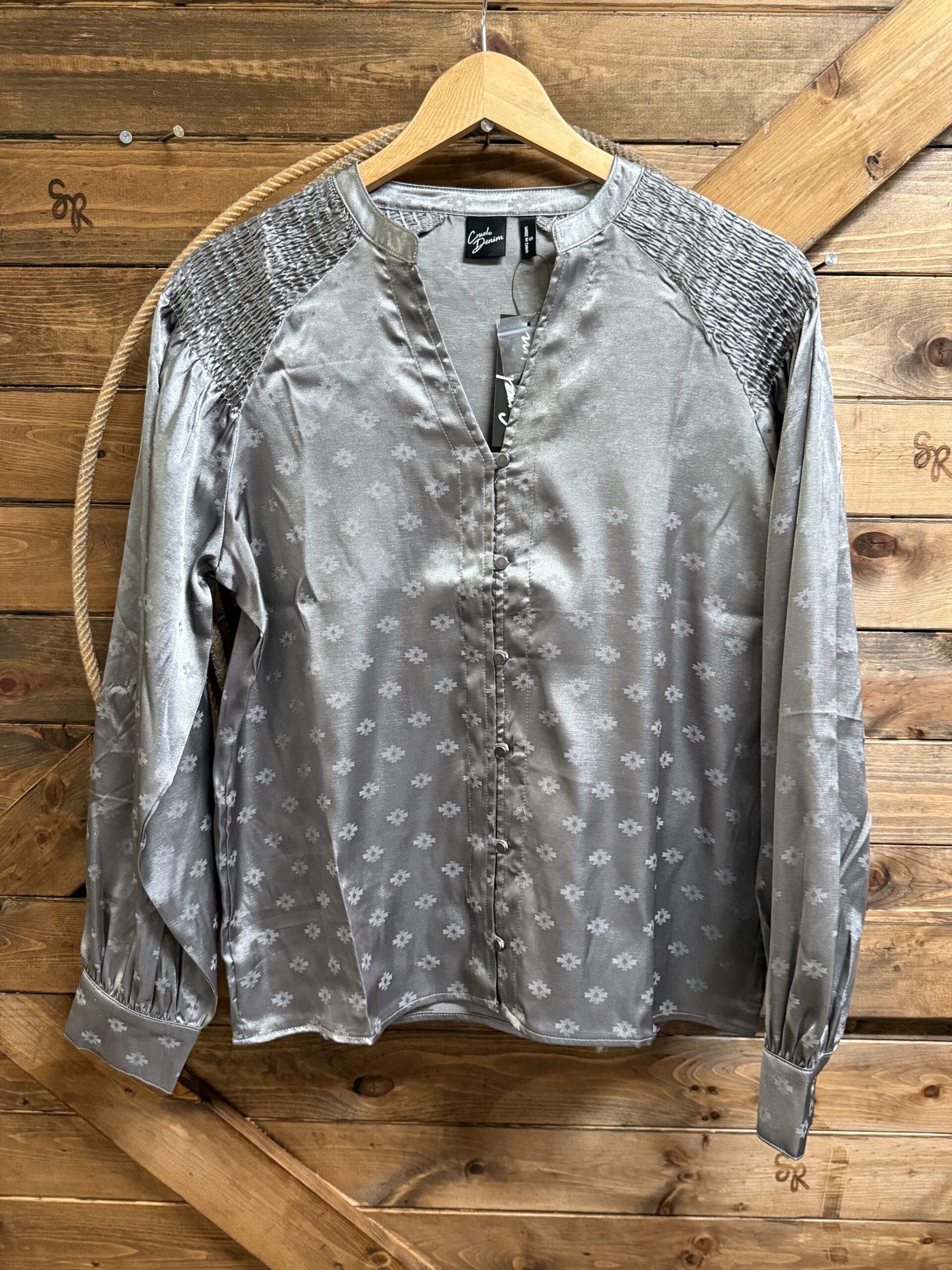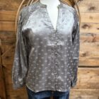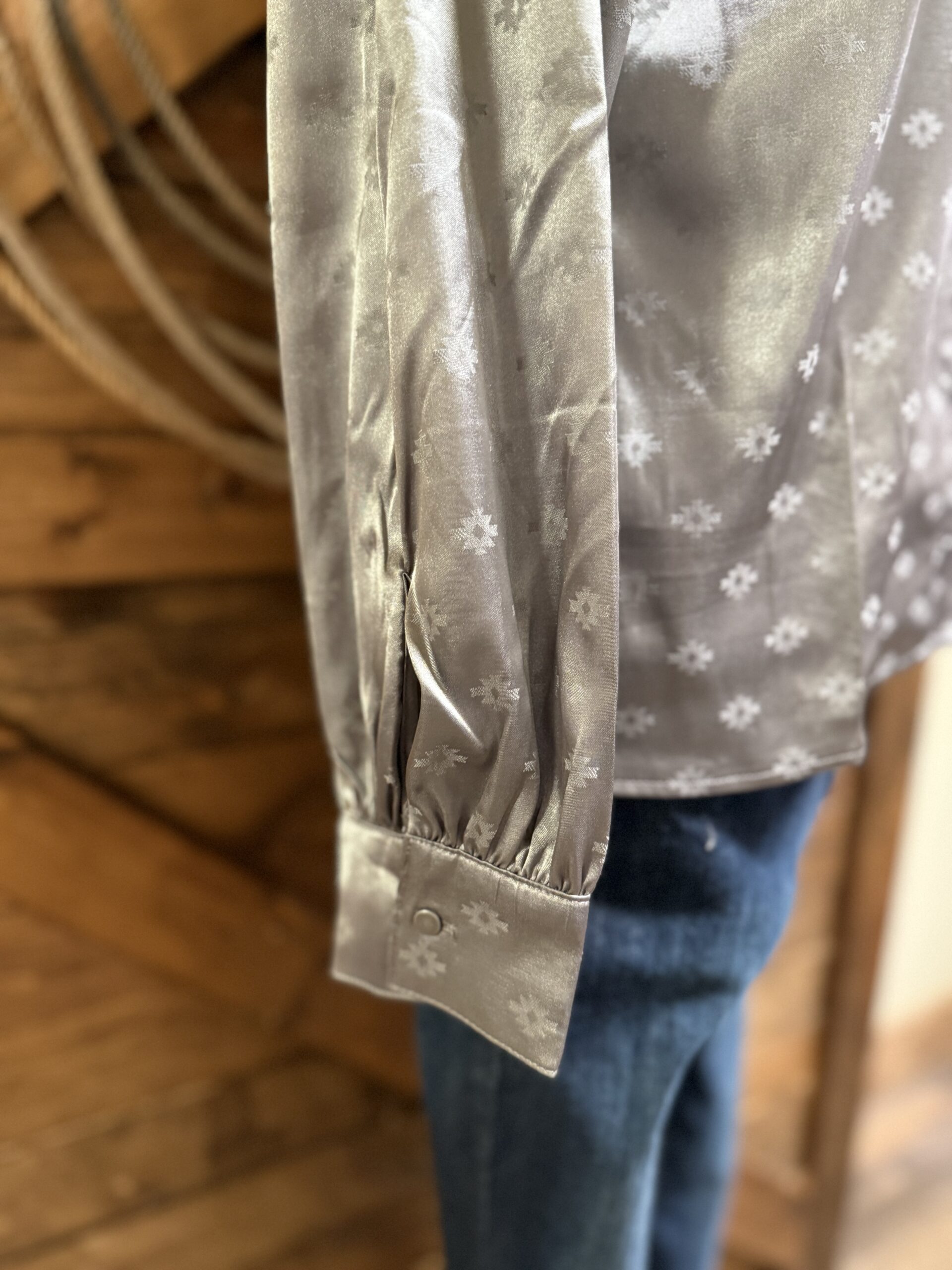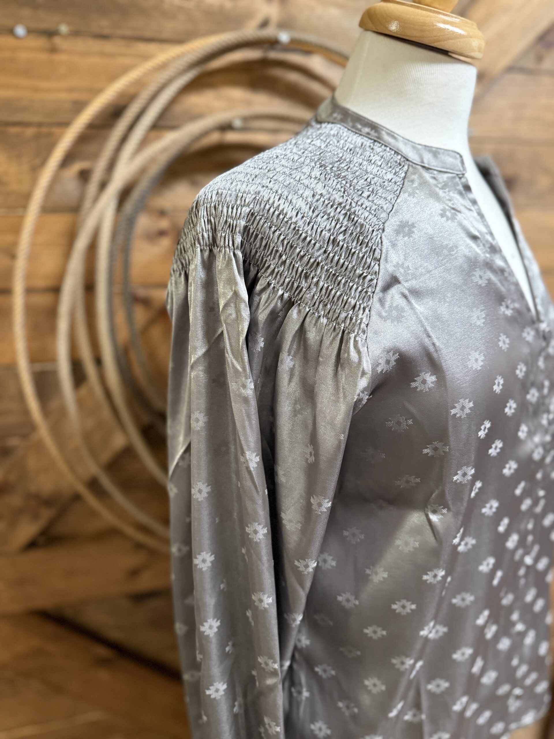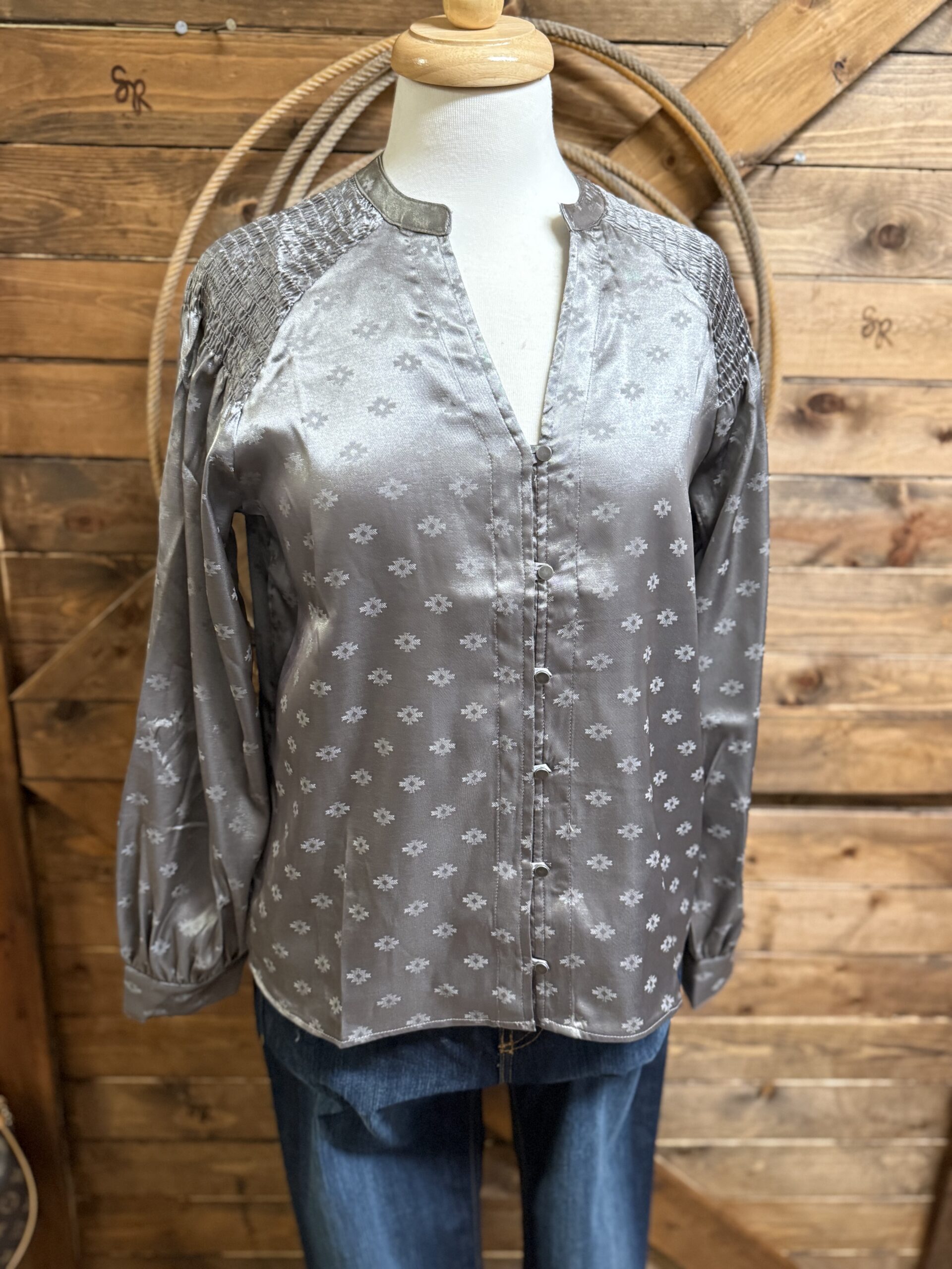 Satin is so elegant! Pretty silver satin with an aztec jacquard print scattered throughout. The shoulders are the prettiest ruched satin from the collar out to the shoulder cap. Pretty v neck line comes down to a 6 loop button center with plain silver buttons to match. They blend in so beautifully! The sleeves are a balloon style with a pulled cuff that buttons on a single matching silver button. Dress up a dark pair of denim and head to town! This top is so simple and pretty, its bound to catch the eye!