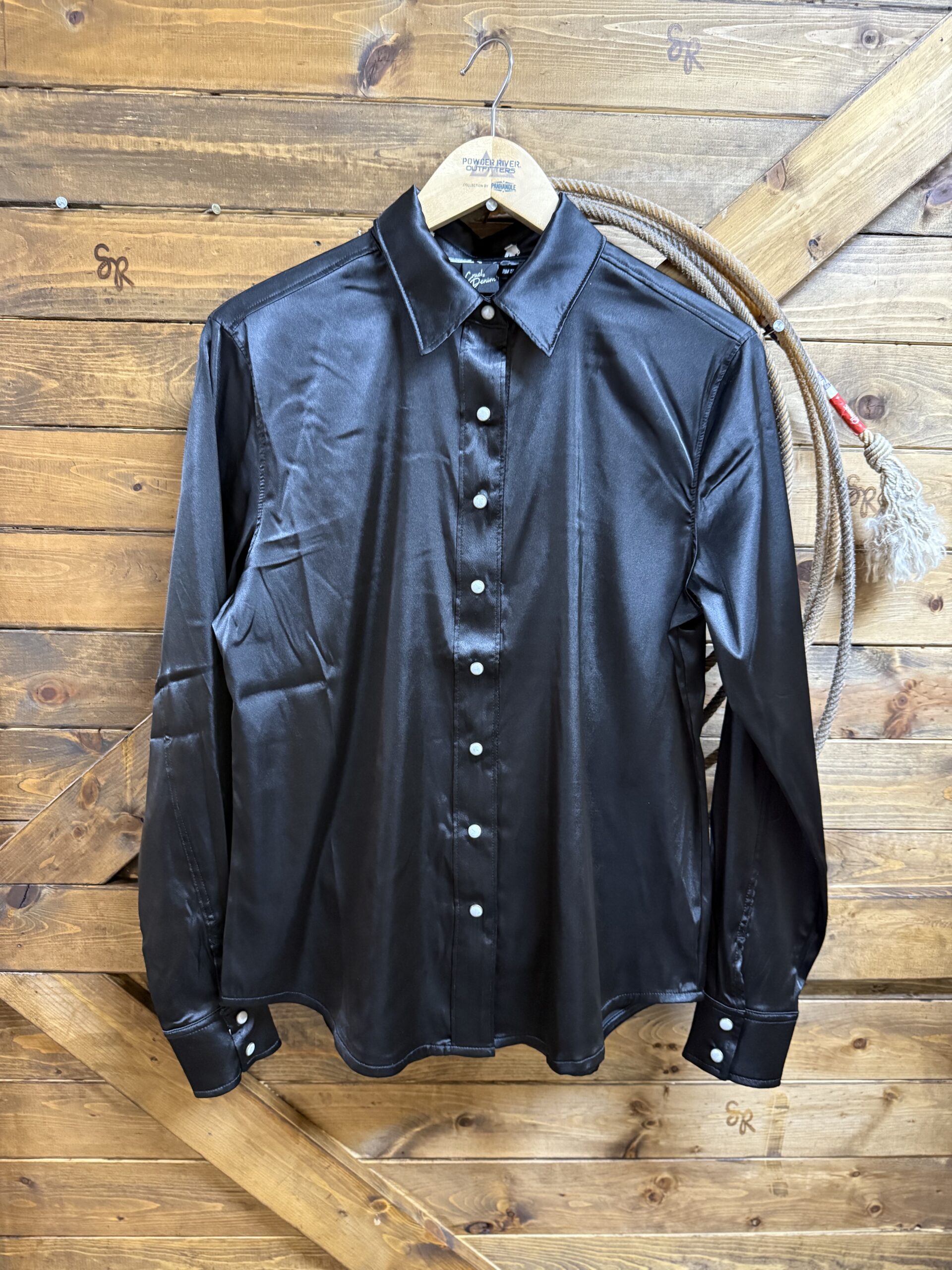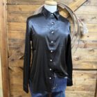 Satin is so pretty! Slip into this black satin long sleeve and head out! No matter the occasion or dress code, this blouse checks all the boxes. Pretty white pearl snaps simply add detail to the elegance. The same pearl snaps are on the cuffs on a 2 button set. It’s made with longer lengths to allow for a more roomy and comfortable fit. Paired with denim, slacks, or a skirt, this top is sure to rise to the occasion and make any outfit. Color matching doesnt matter, black goes with anything!