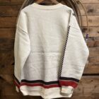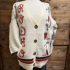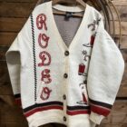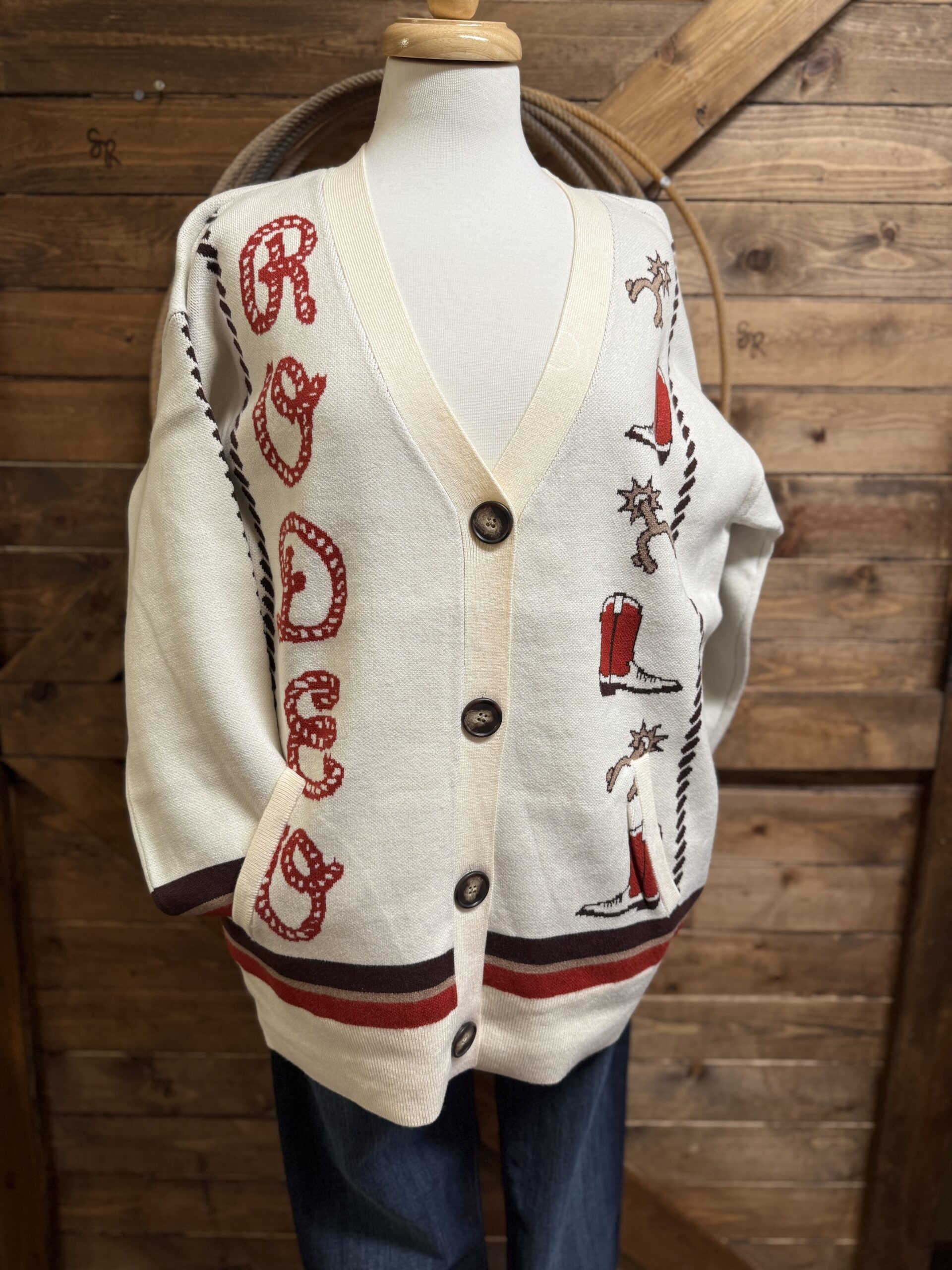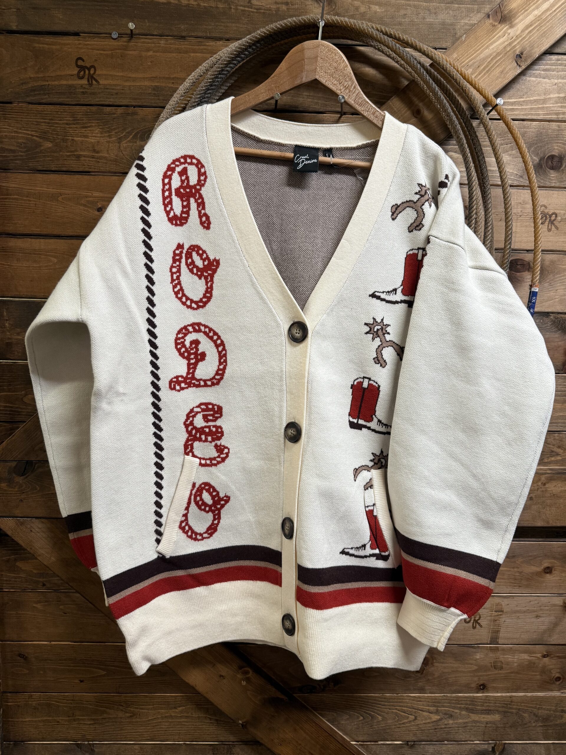 Cardigans are a girls best friend! We love a good cardigan that we can throw on and dress up any outfit regardless of the occasion. Pretty colors of cream and red with hints of brown. The nice heavy knit creates a great look. Large brown buttons come down off of a deep v neck. Boots and spurs hang out on the left side while RODEO is spelled out down the opposite side. The brown rope detail adds perfect detail down the side of each of the arms. The sleeve ends are an elastic cuff with bands of red and brown knit. The back is blank leaving all the detail to the front. A cardigan made to keep you warm and add detail to your attire!