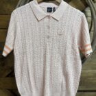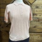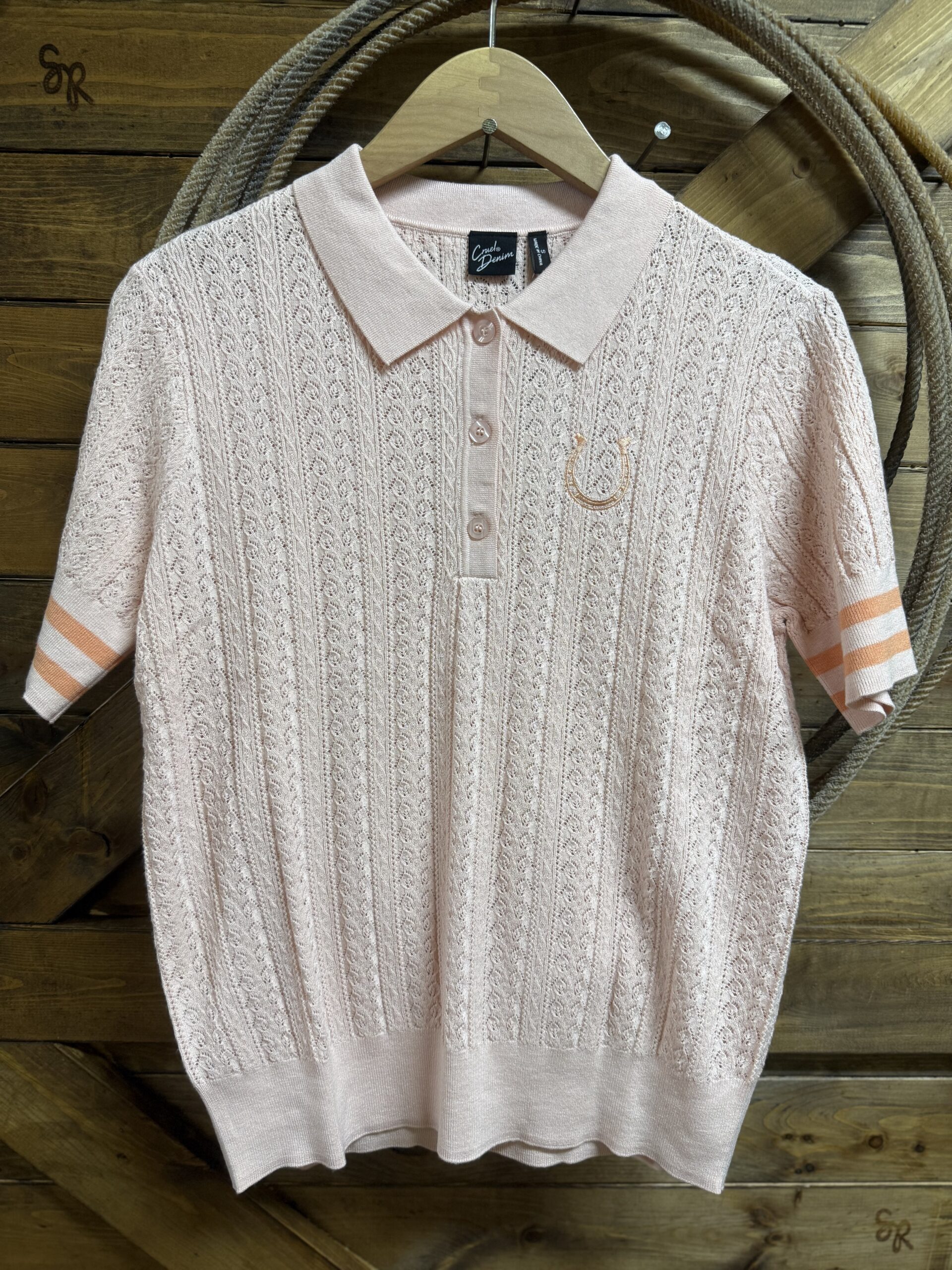 Summertime sweater! Beautiful light pink knitted polo sweater. Three matching pink buttons come down off of the layover collar. Each of the sleeves are striped in a pretty peach at the elastic set. On the front left side of the chest is a cute horseshoe embroidered in a light peach thread. Layer it if you wish, however the knitting is a tighter knit that doesn’t require an undershirt. Dressy and casual at the same time! This makes it easy to style your way!