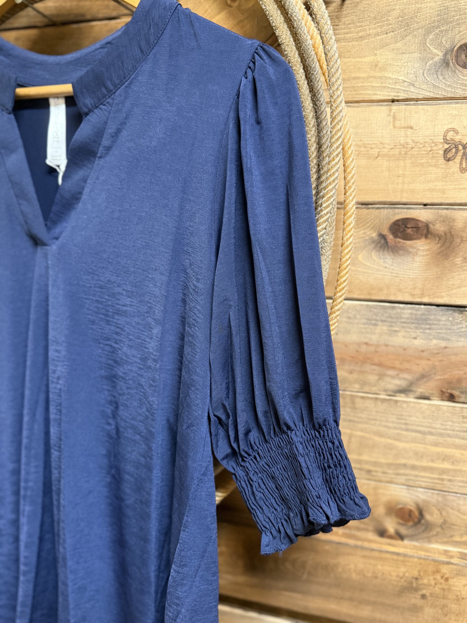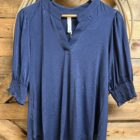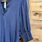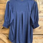 Gorgeous dressy blouse! It you don’t like fancy and simple is your thing, this is your blouse! Basic deep navy color on a stretchy material that is sooo comfy and wrinkle free. Shorter collar comes down into a V neck. The sleeves are a ruched shoulder top giving it just enough raise to be a detail in the style! The sleeve comes on down to an elastic pull with a short ruffle. A small pull in the center of the back allows for a more flow style and a little extra room! It will be the comfiest dress blouse you ever snag!