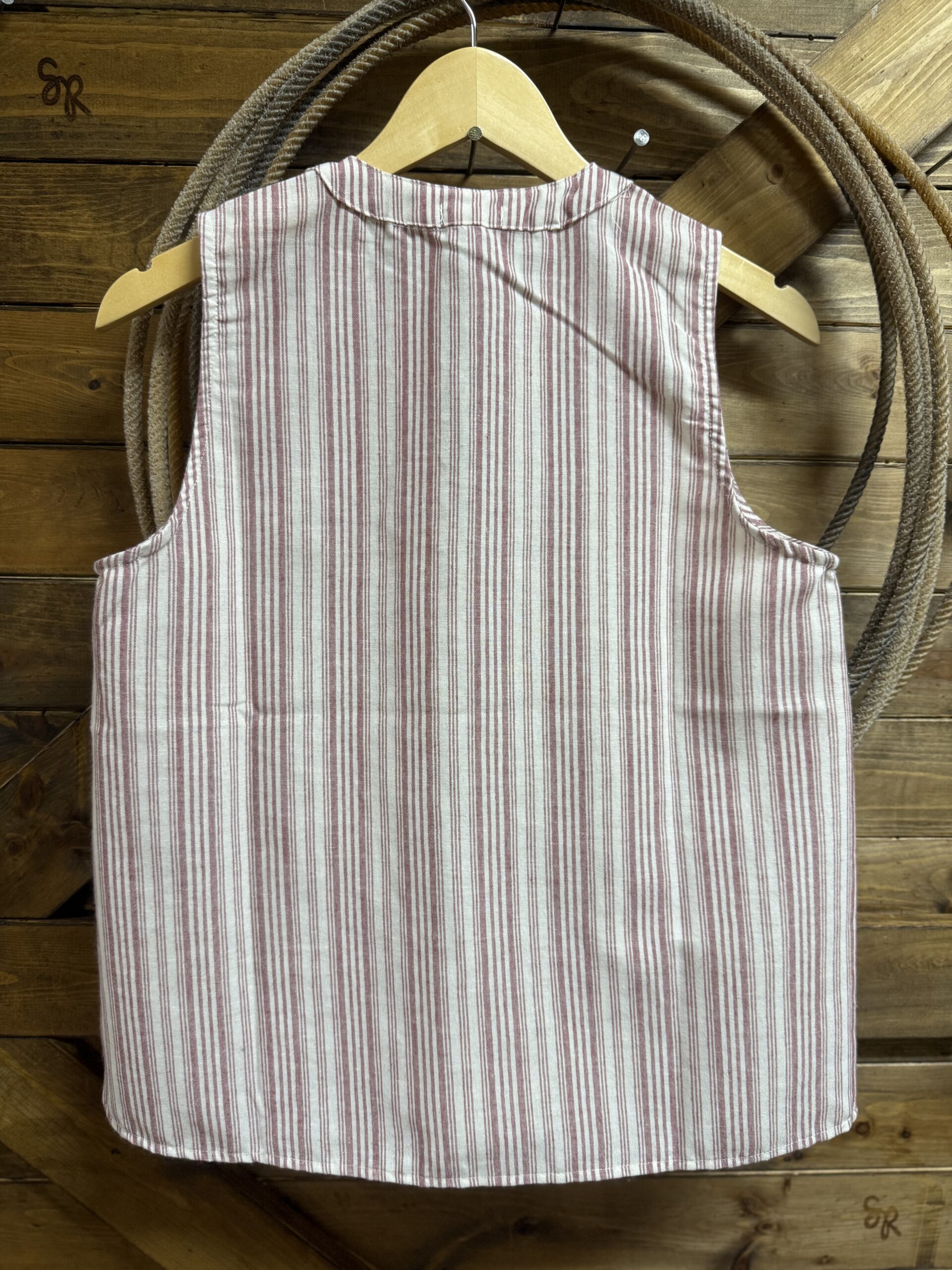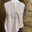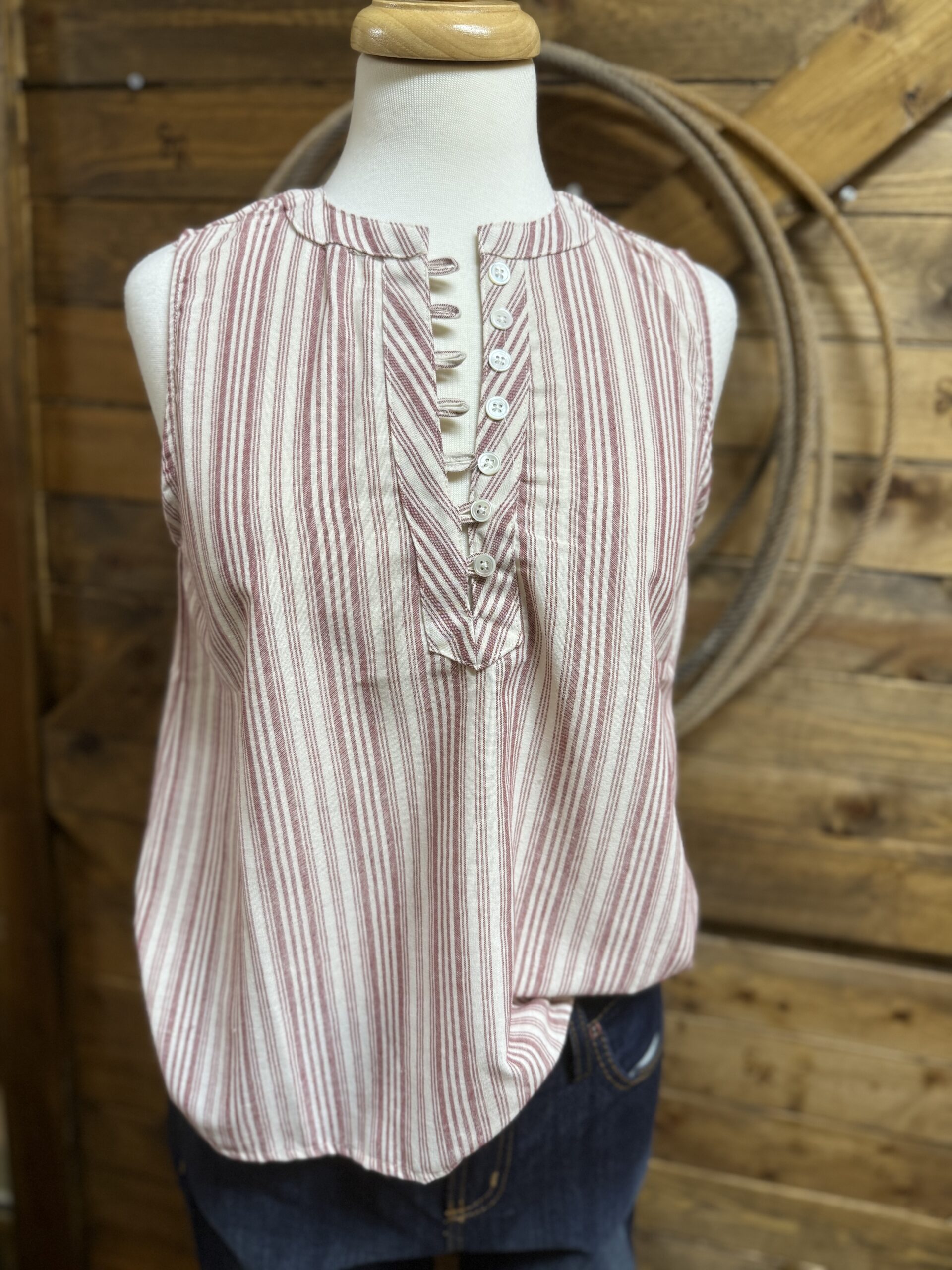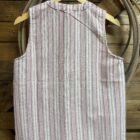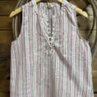 The simplest summer tank! Pretty stripes alternating in a red and natural stripe. It’s the kind of material we all want, light weight and breathable. Pretty rounded neckline with buttons dropping down at the center. They each hook on a loop to draw in the closure to your preference. Made for everyday wear with a style for a dressier occasion during those hot summer months.